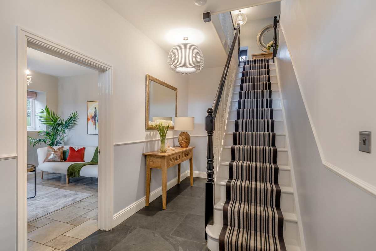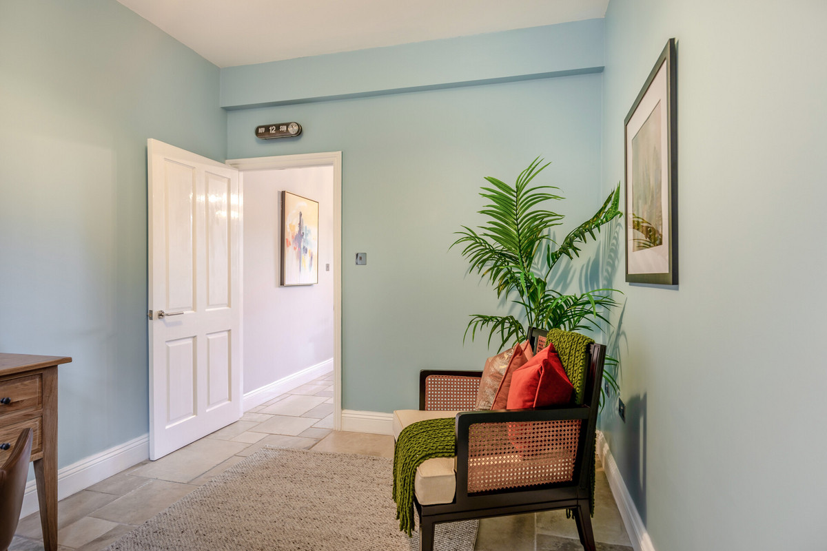 Step into the welcoming entrance hall, with its wide staircase, high ceilings, and useful storage. The cozy snug, with its bay window framing the garden, provides a quiet retreat, while a secluded home office sits conveniently adjacent.