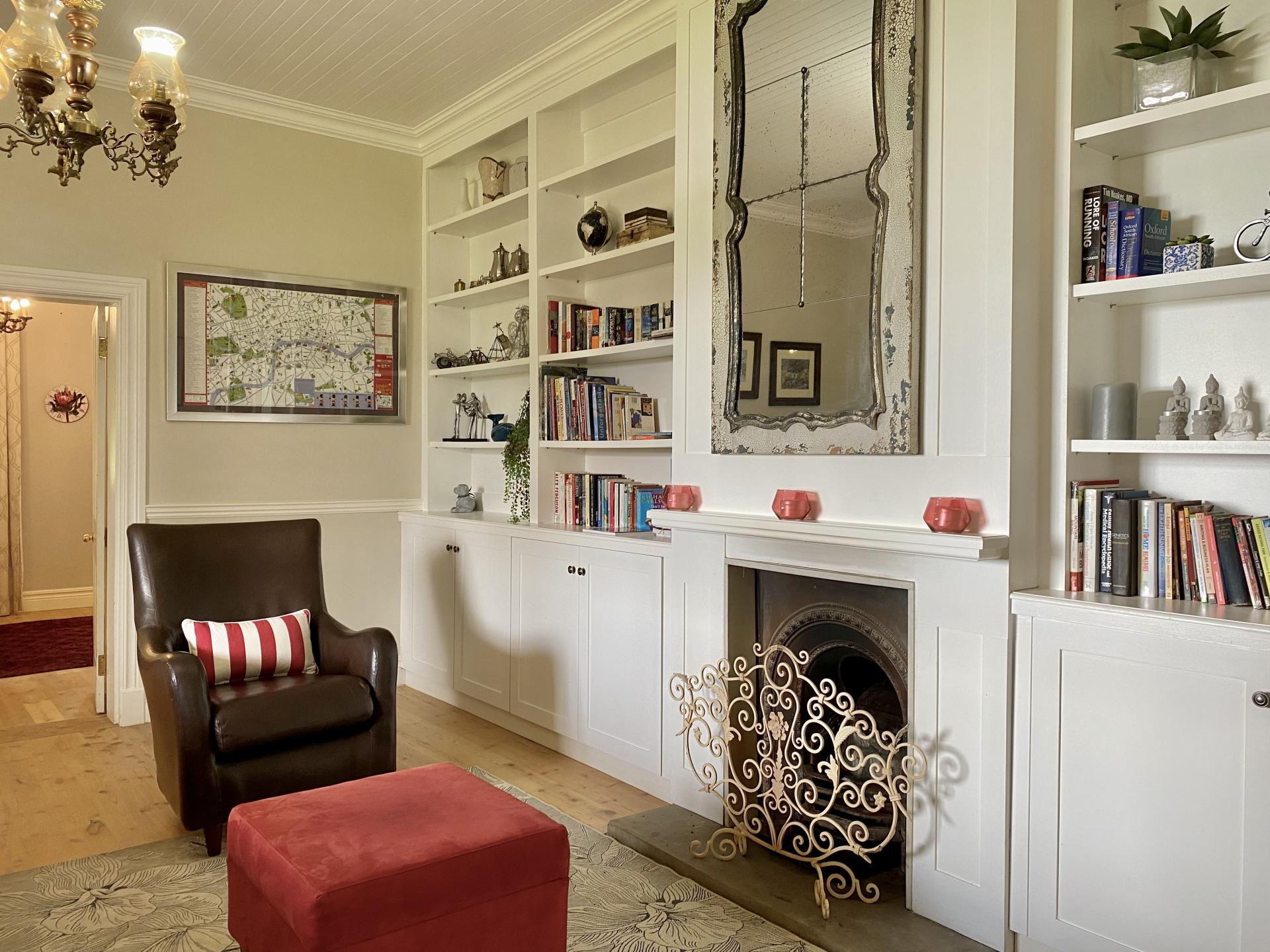 • Formal lounge with a wall-to-wall bookshelf and wood fireplace