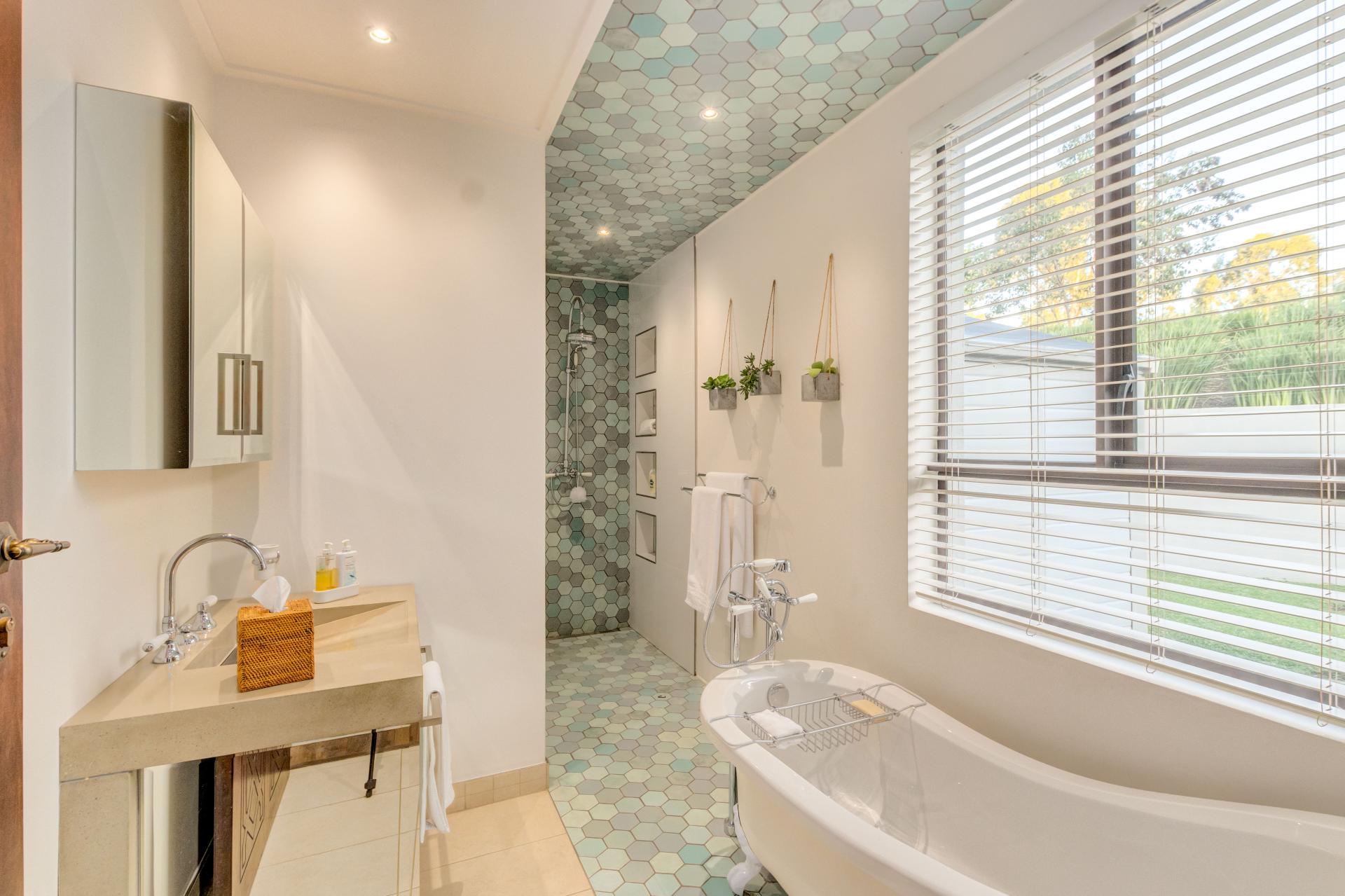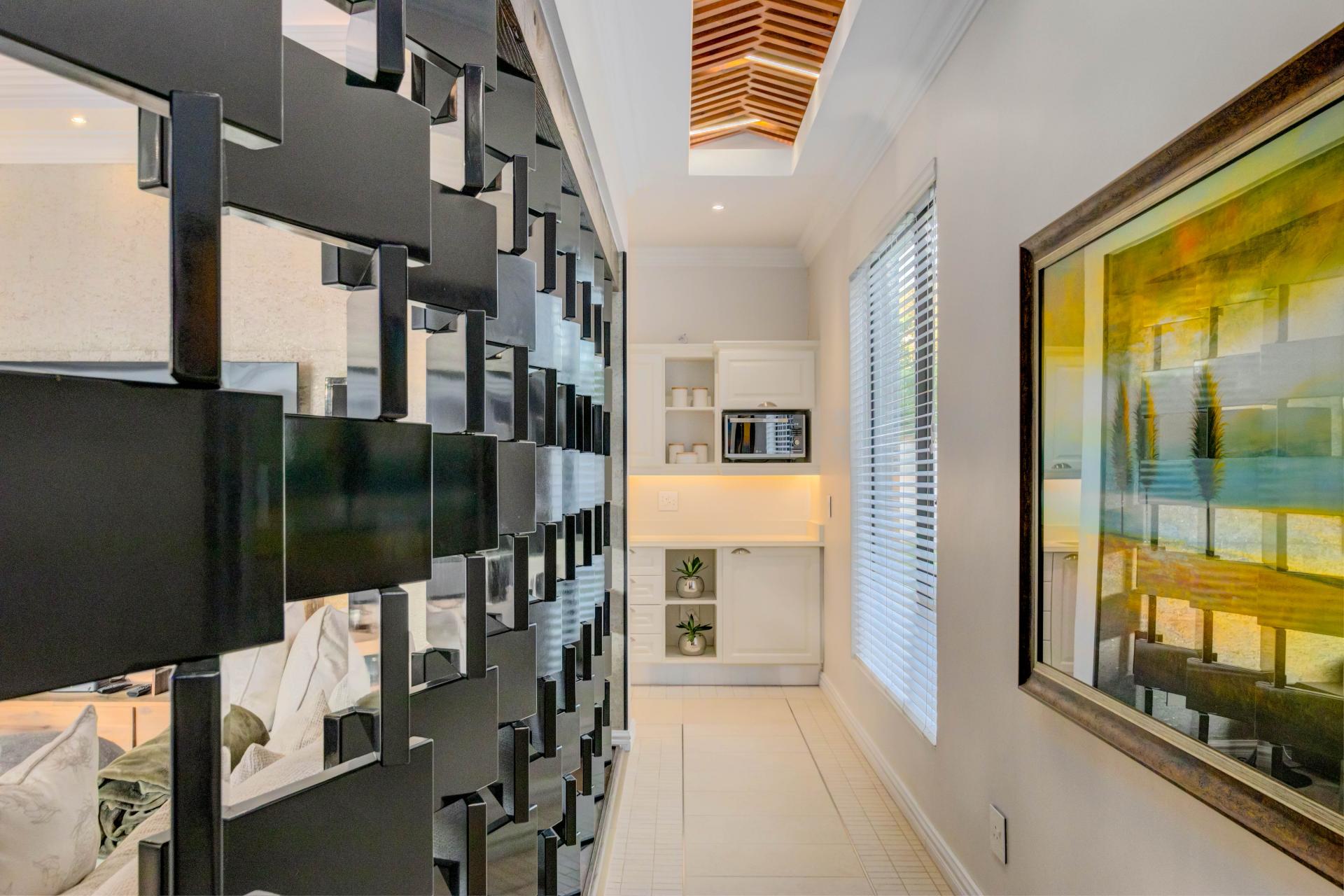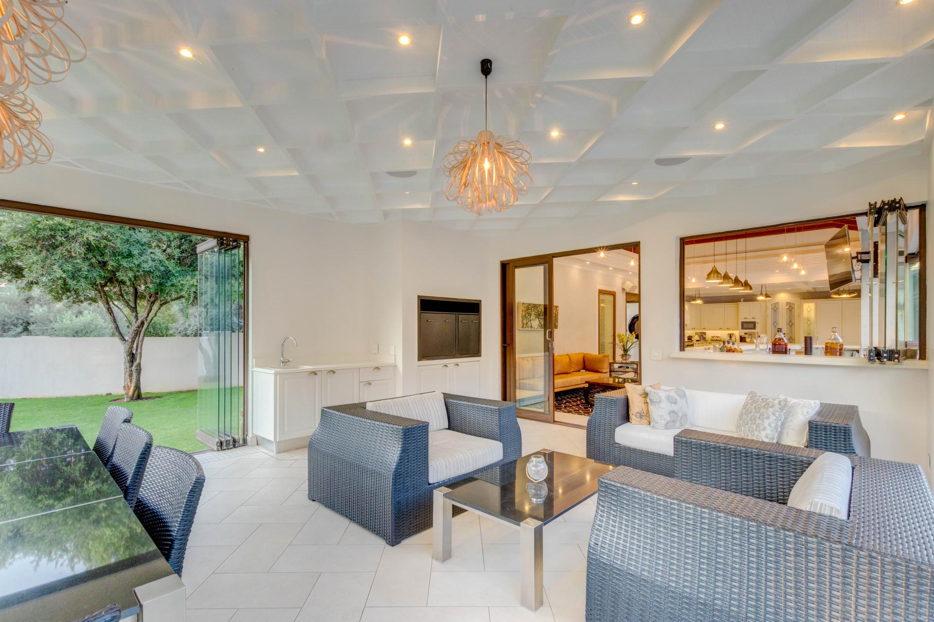 Entertainment has never been better with an 8 seater cinema room with 3D capability and surround sound, multiple entertainment areas from inside going out. Inside has three lounge areas – one private cigar/formal lounge off the wine tasting room, one large lounge by the beautiful bar, and a third tv room lounge off the kitchen near the bedrooms. Outside there is a boma with wood braai and closer to the house is another wood and gas braai. There is also a jacuzzi under an additional covered entertainment area. The garden is beautifully manicured throughout with privacy of utmost importance on this corner stand and very few neighbours surrounding you.