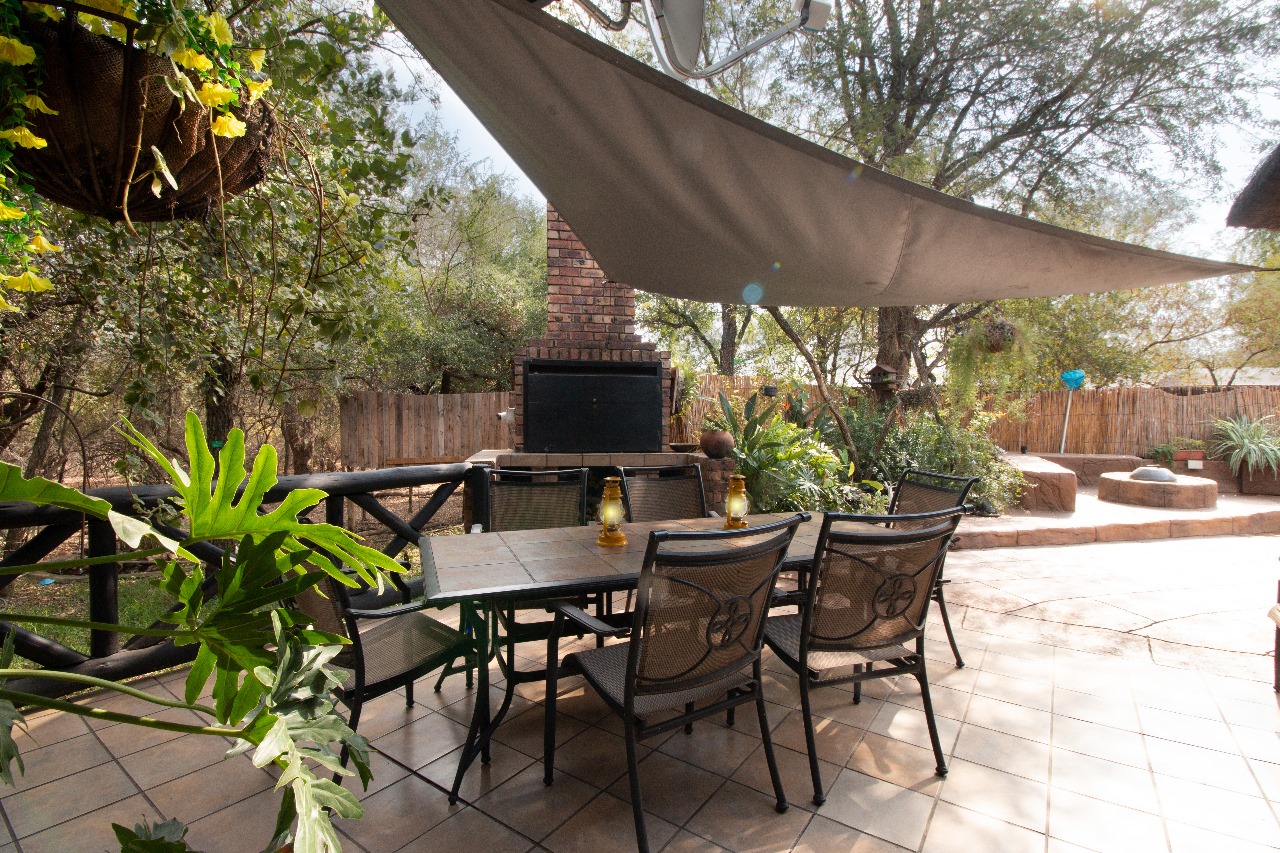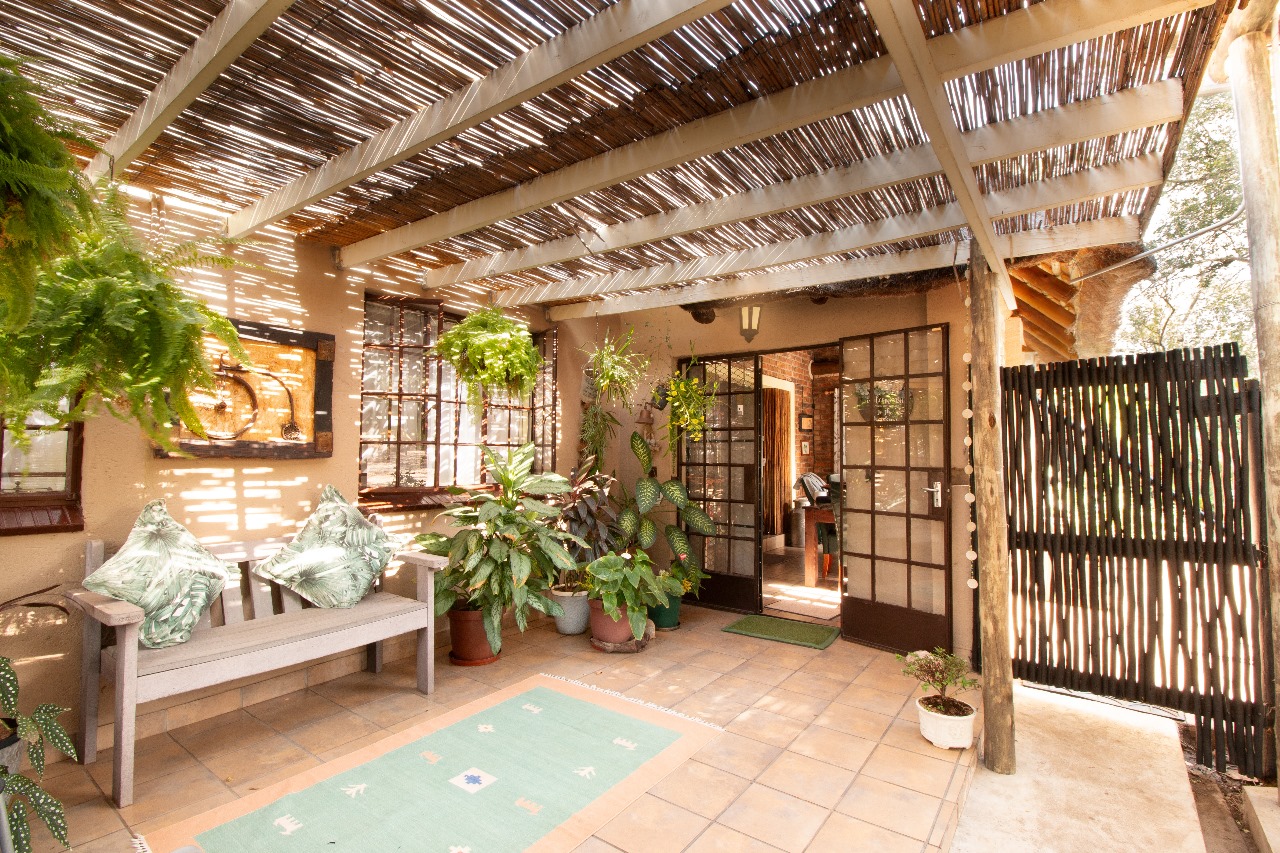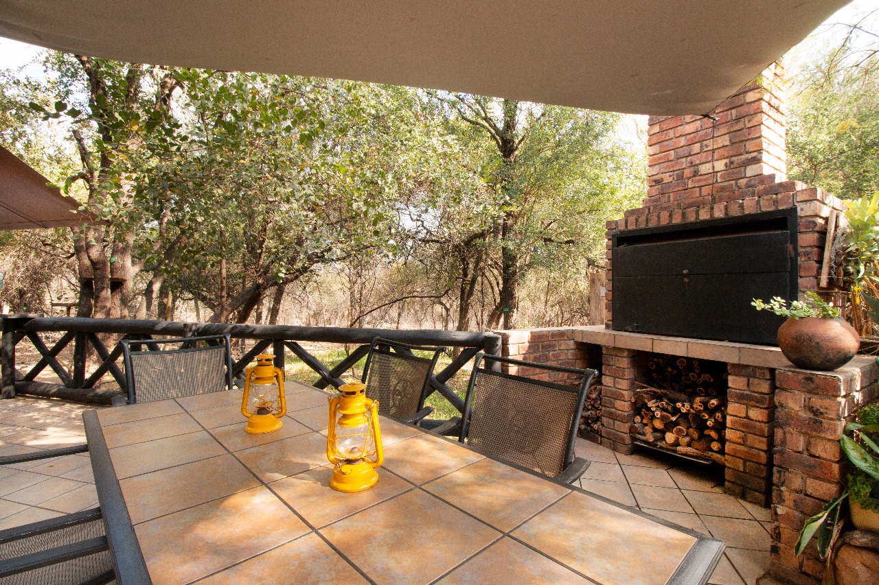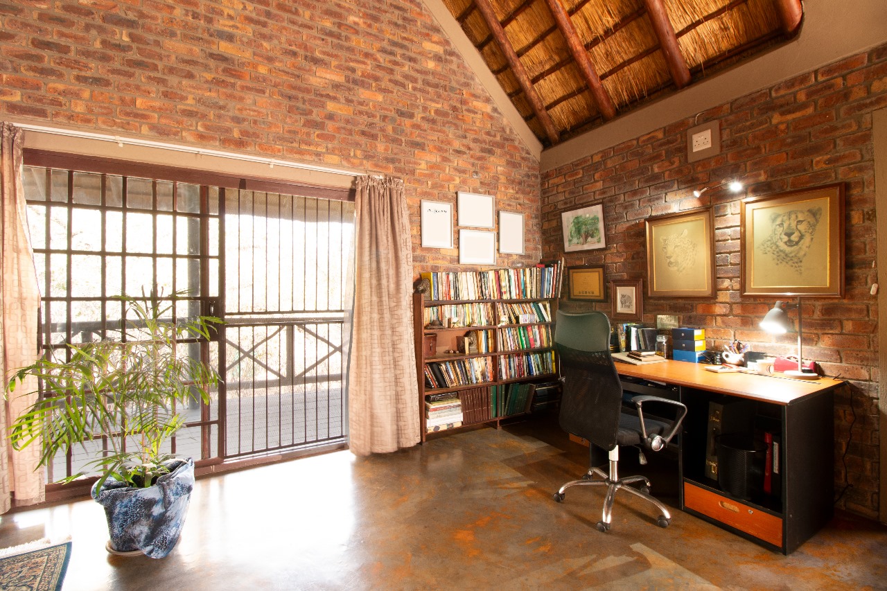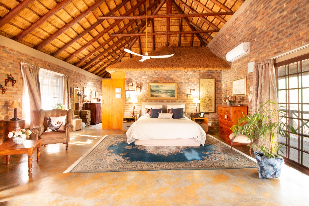 Enter through a charming pergola into a sundrenched sunroom, now used as a welcoming dining space. The fun part of the home is the kitchen that flows seamlessly into the outdoor entertainment area through glass doors. Whether it is for morning coffee with the birds or sundowners while watching the free roaming animals or making memories with family and friends under the stars around the boma or braai, here it feels like a private safari.