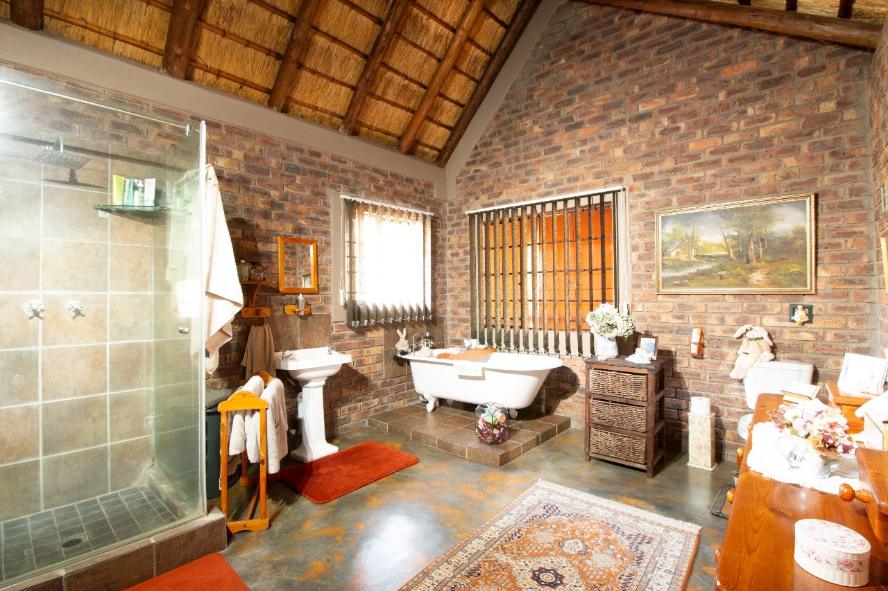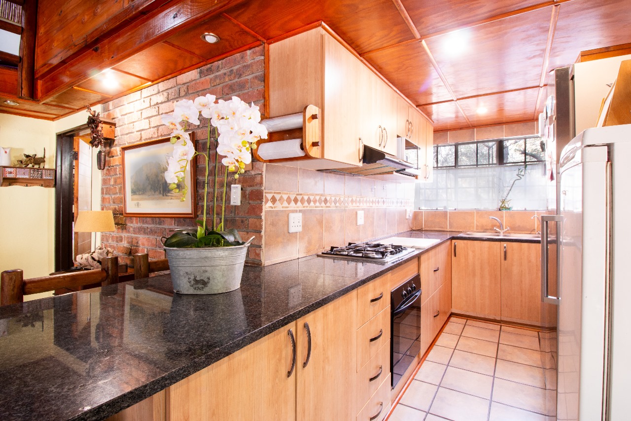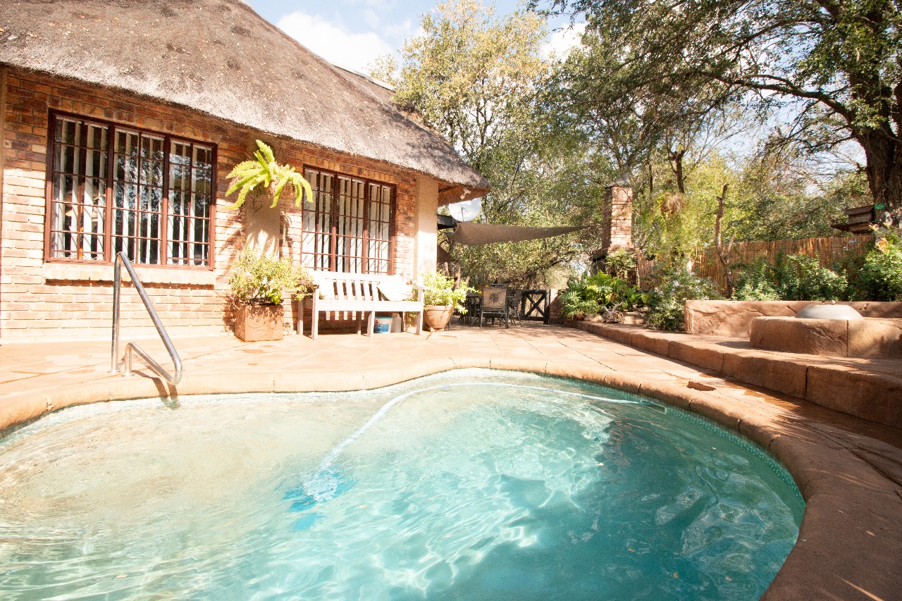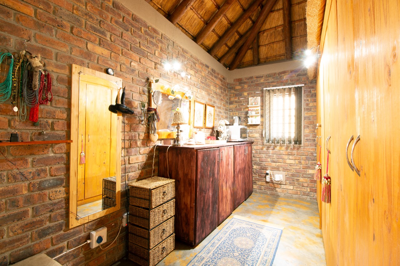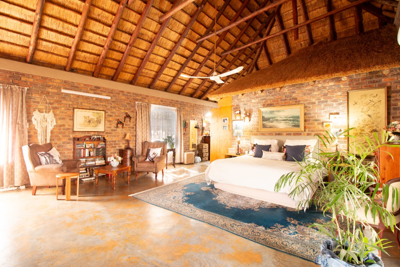 Enter through a charming pergola into a sundrenched sunroom, now used as a welcoming dining space. The fun part of the home is the kitchen that flows seamlessly into the outdoor entertainment area through glass doors. Whether it is for morning coffee with the birds or sundowners while watching the free roaming animals or making memories with family and friends under the stars around the boma or braai, here it feels like a private safari.