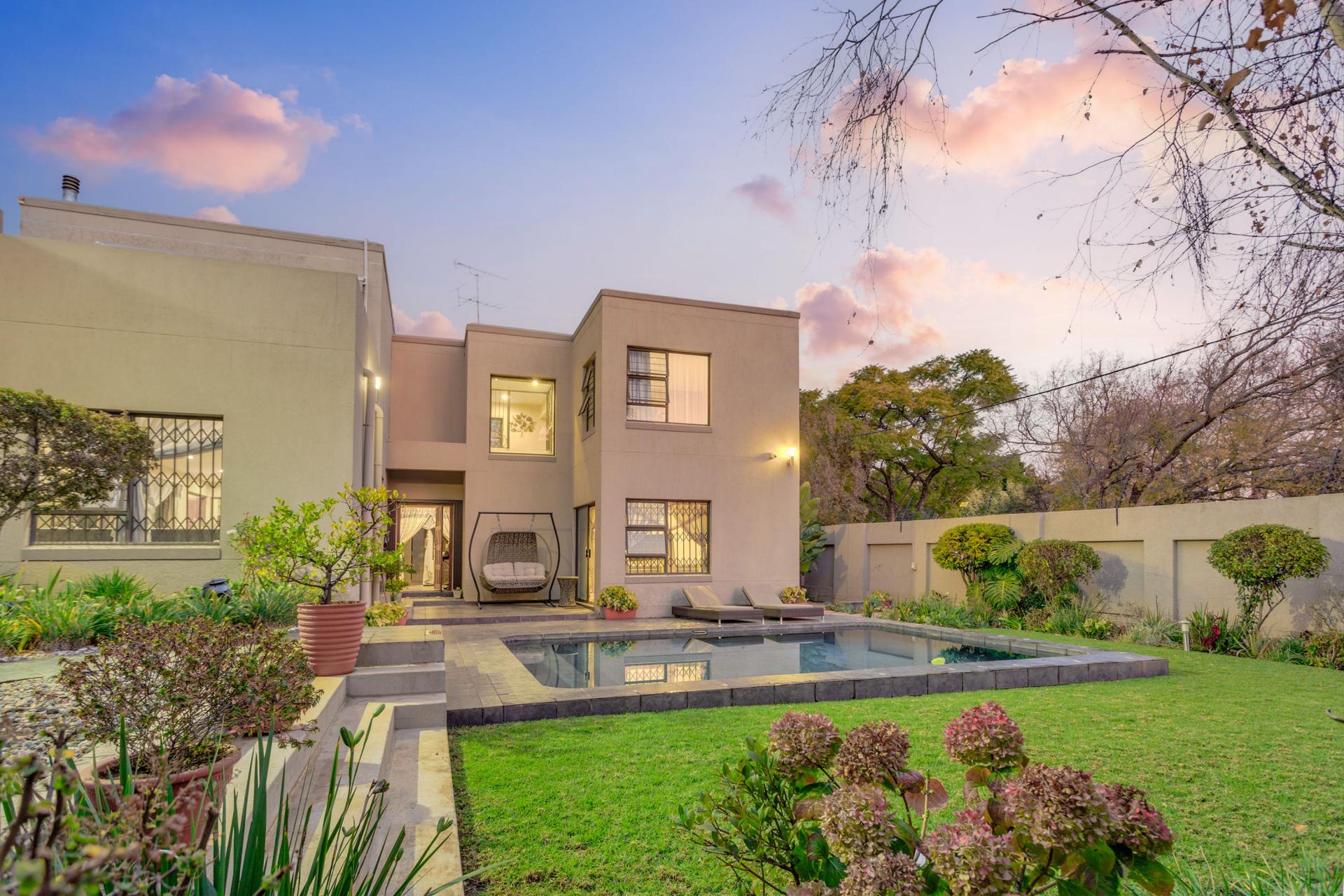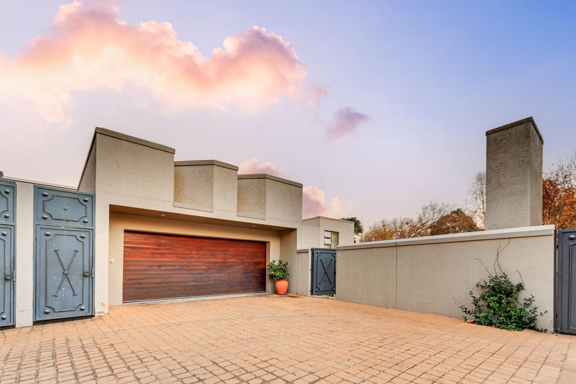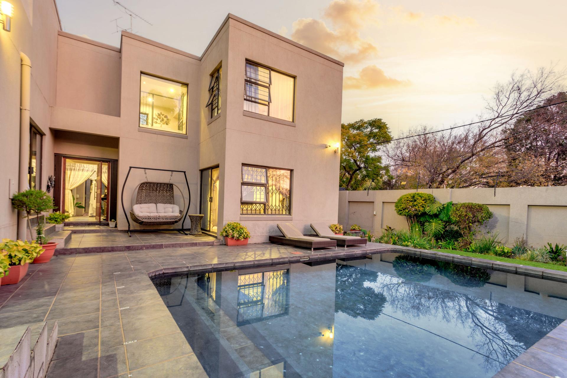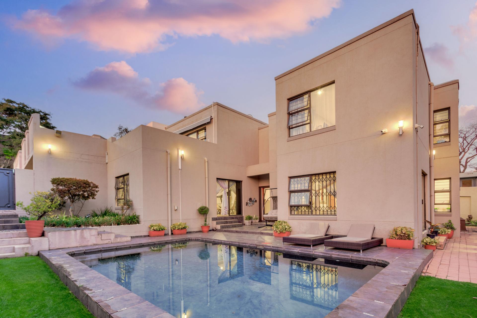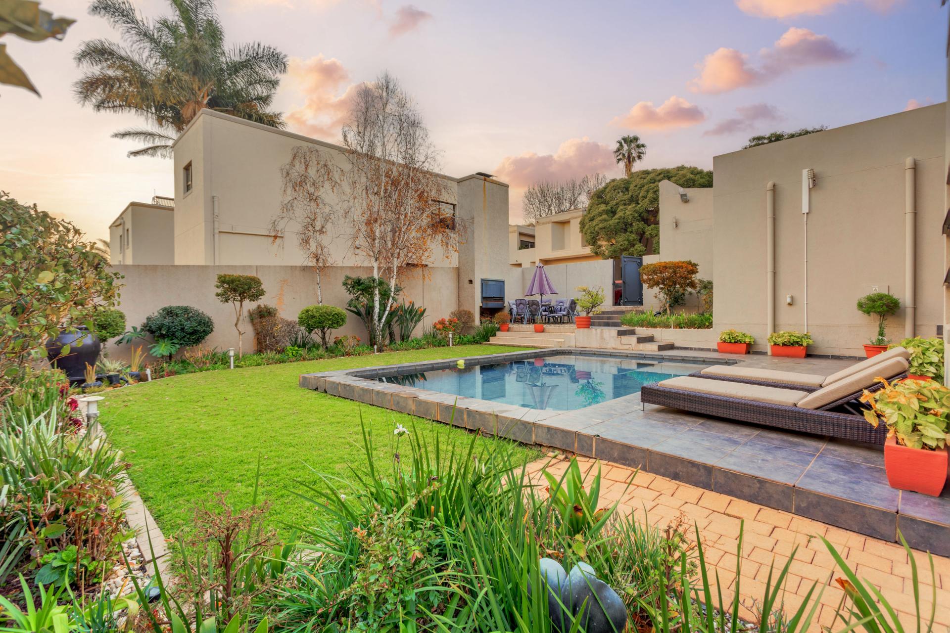 A lovely modern, spacious, and light property with a well-positioned private garden, situated within a secure estate with a backup power system consisting of 12 panels, 4 batteries and a 5 kVa inverter. The property is situated in Bryanston and offers 5 bedrooms. As one enters from the front door you are greeted with a modern, tiled, open plan lounge (with morso fire place) and dining room area with an easy flow into the modern granite top kitchen. The kitchen has a built-in stove, ample cupboard space, and an additional space ideal for a laundry. Adjacent to the kitchen area is a bar and entertainment area blending indoor and outdoor entertaining. There is also a staircase leading up to a private 5th bedroom, ideal for guests or adult children. Downstairs has an additional 2 bedrooms, sharing a guest bathroom. The home leads out seamlessly to a lovely entertainment area comprising a courtyard and swimming pool with a level garden. Upstairs boast 3 spacious bedrooms, all with built in cupboards offering a spacious environment. The main bedroom has a full en-suite, walk in closet and a spacious balcony. This stunning home has aircons in every room, CCTV, a double garage and staff accommodation, making it an ideal fit for any family with ample extras.