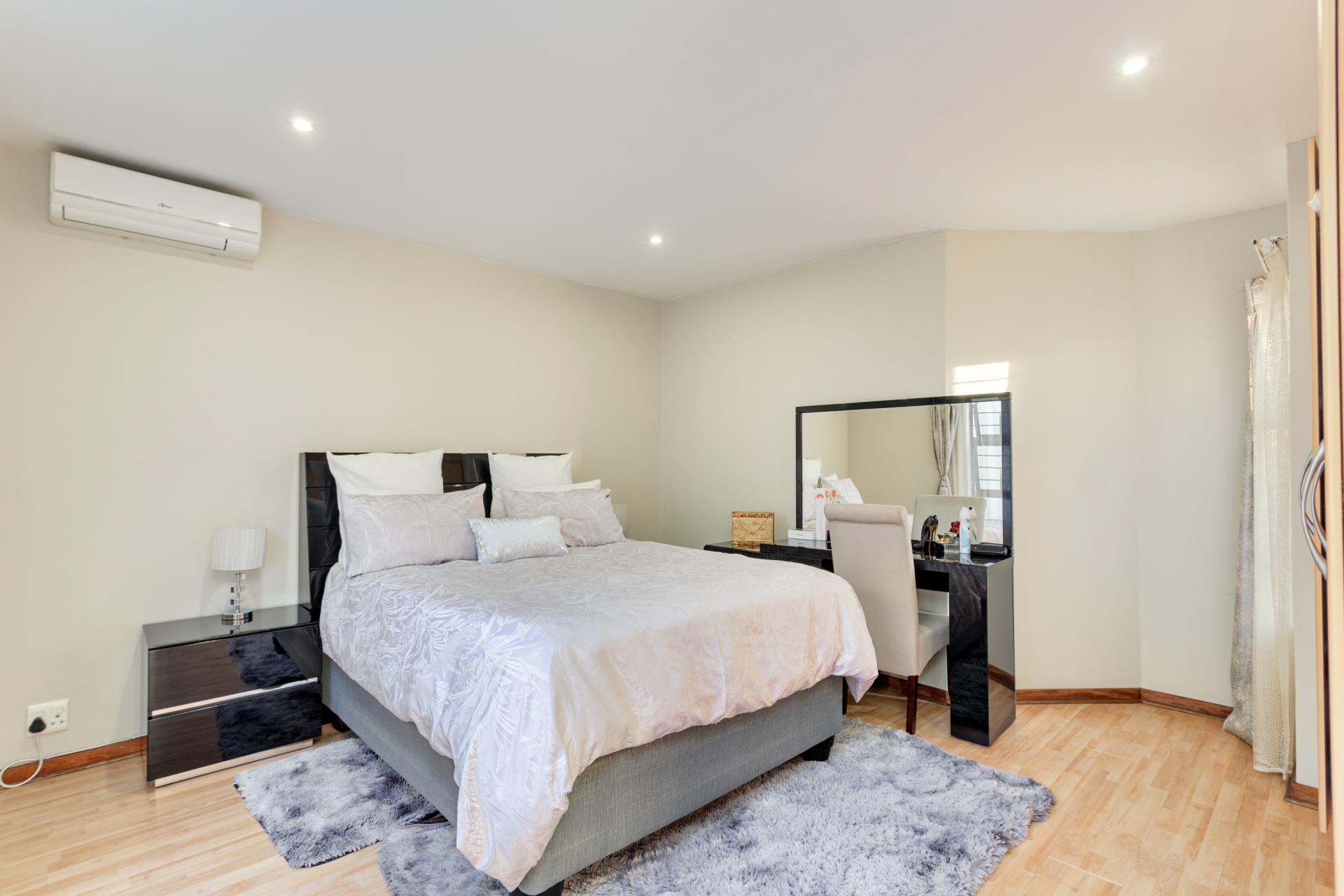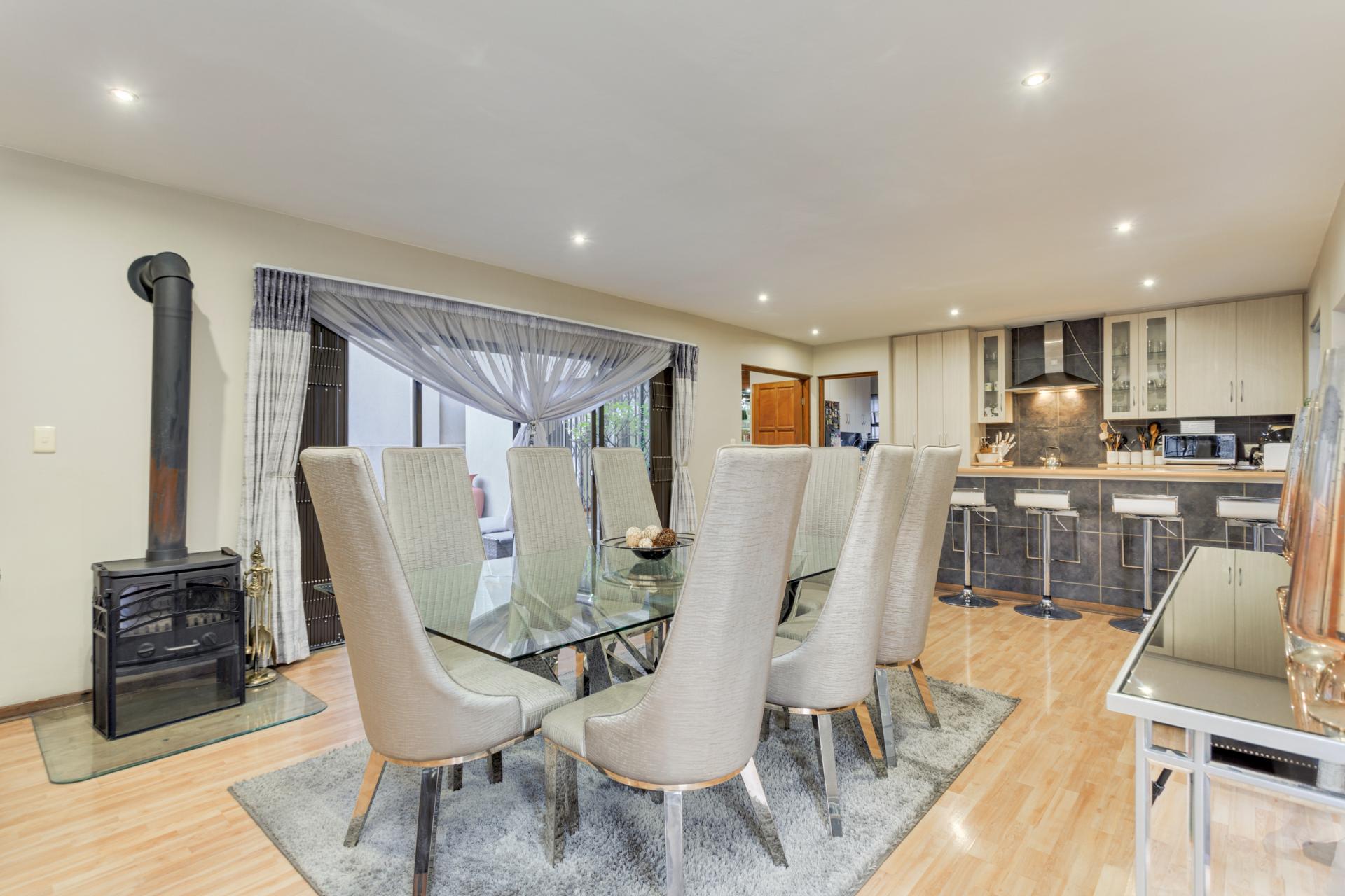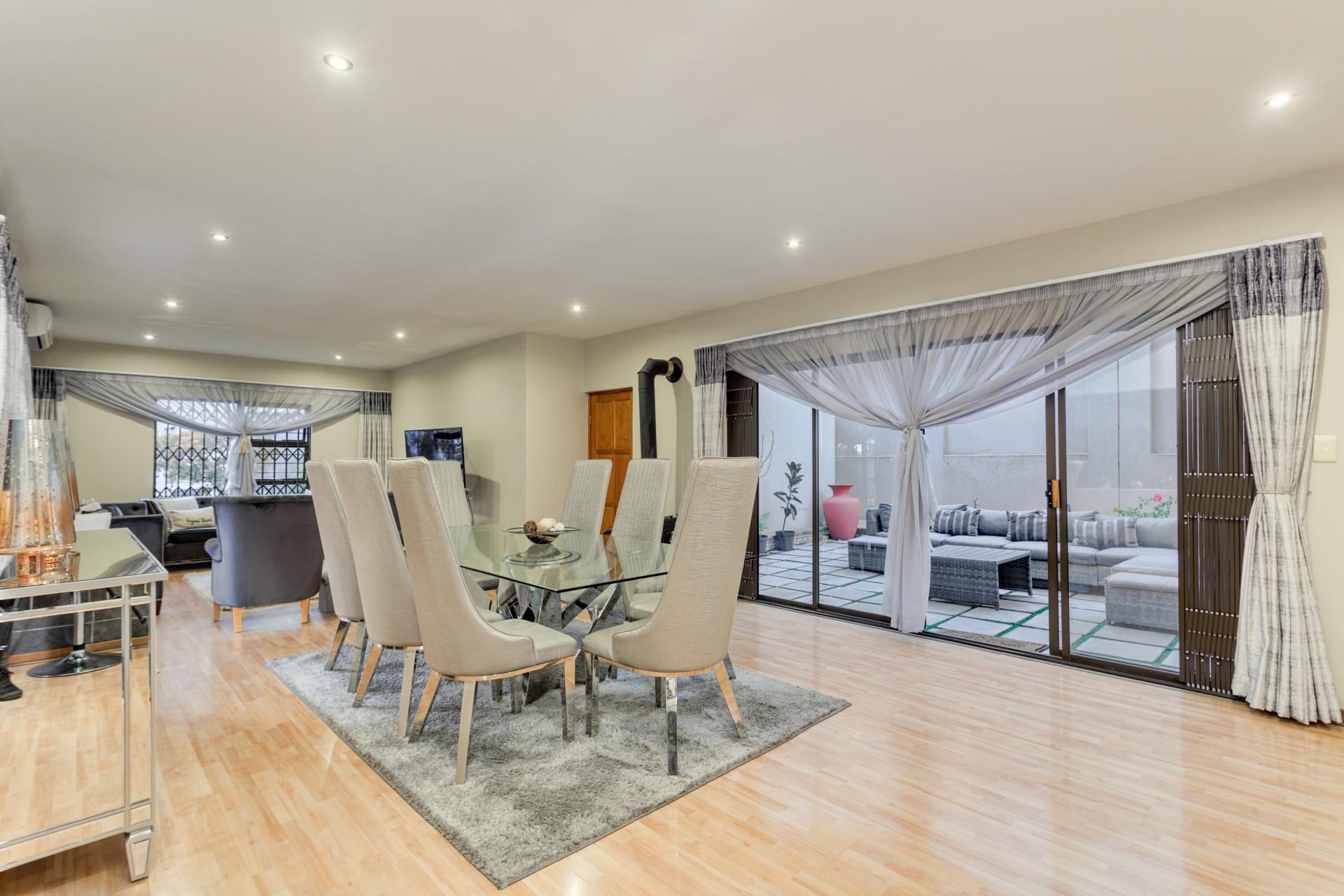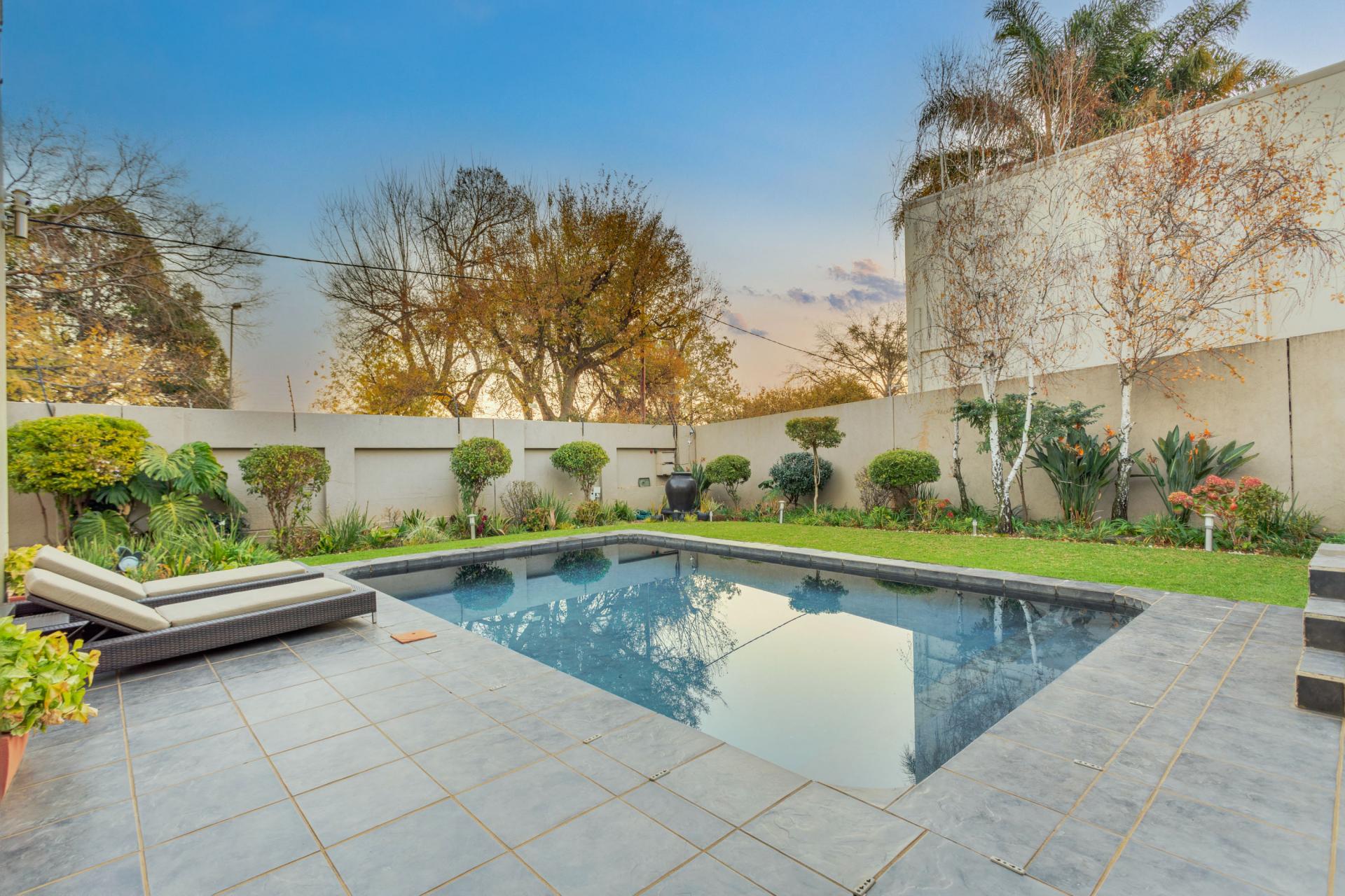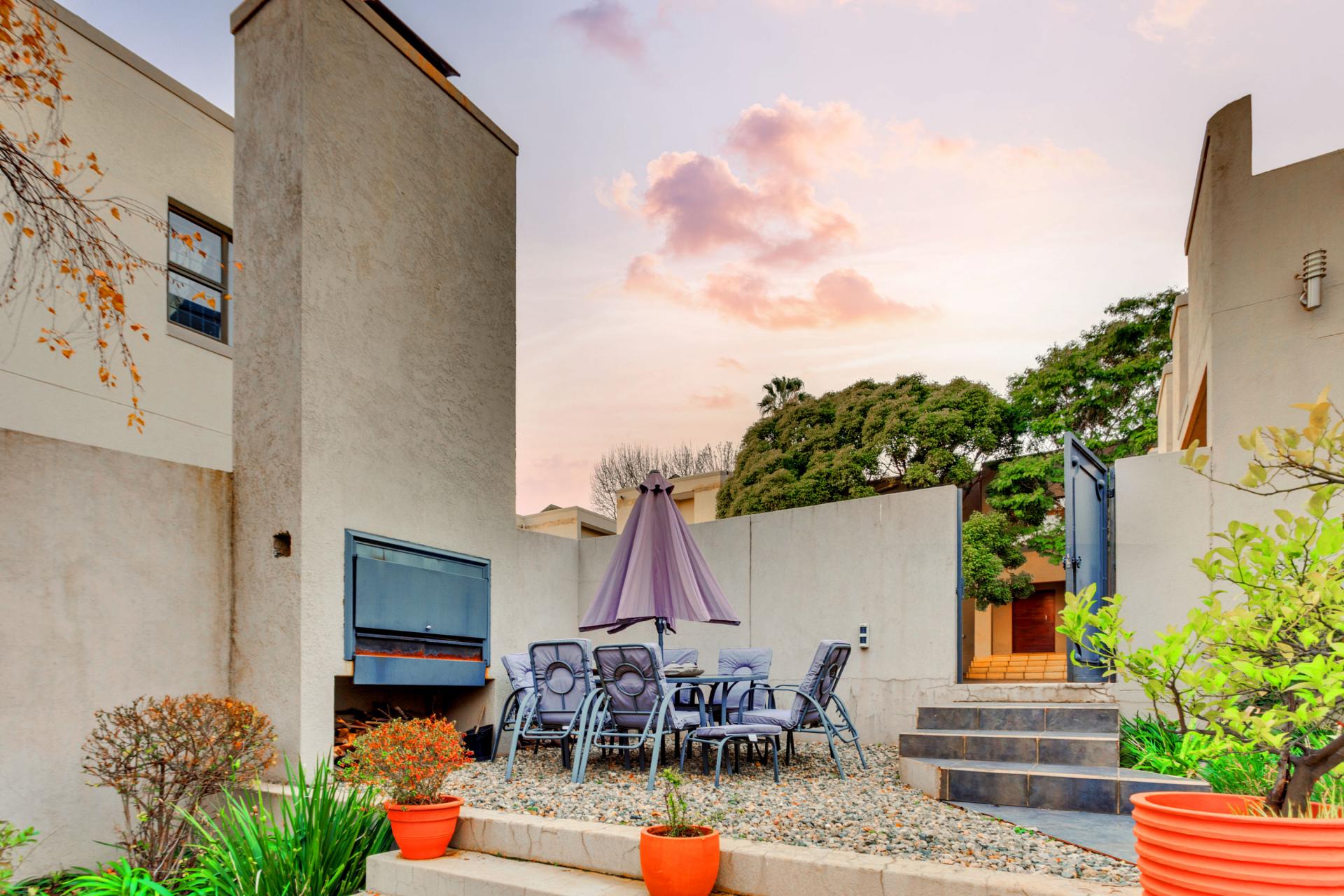 A lovely modern, spacious, and light property with a well-positioned private garden, situated within a secure estate with a backup power system consisting of 12 panels, 4 batteries and a 5 kVa inverter. The property is situated in Bryanston and offers 5 bedrooms. As one enters from the front door you are greeted with a modern, tiled, open plan lounge (with morso fire place) and dining room area with an easy flow into the modern granite top kitchen. The kitchen has a built-in stove, ample cupboard space, and an additional space ideal for a laundry. Adjacent to the kitchen area is a bar and entertainment area blending indoor and outdoor entertaining. There is also a staircase leading up to a private 5th bedroom, ideal for guests or adult children. Downstairs has an additional 2 bedrooms, sharing a guest bathroom. The home leads out seamlessly to a lovely entertainment area comprising a courtyard and swimming pool with a level garden. Upstairs boast 3 spacious bedrooms, all with built in cupboards offering a spacious environment. The main bedroom has a full en-suite, walk in closet and a spacious balcony. This stunning home has aircons in every room, CCTV, a double garage and staff accommodation, making it an ideal fit for any family with ample extras.