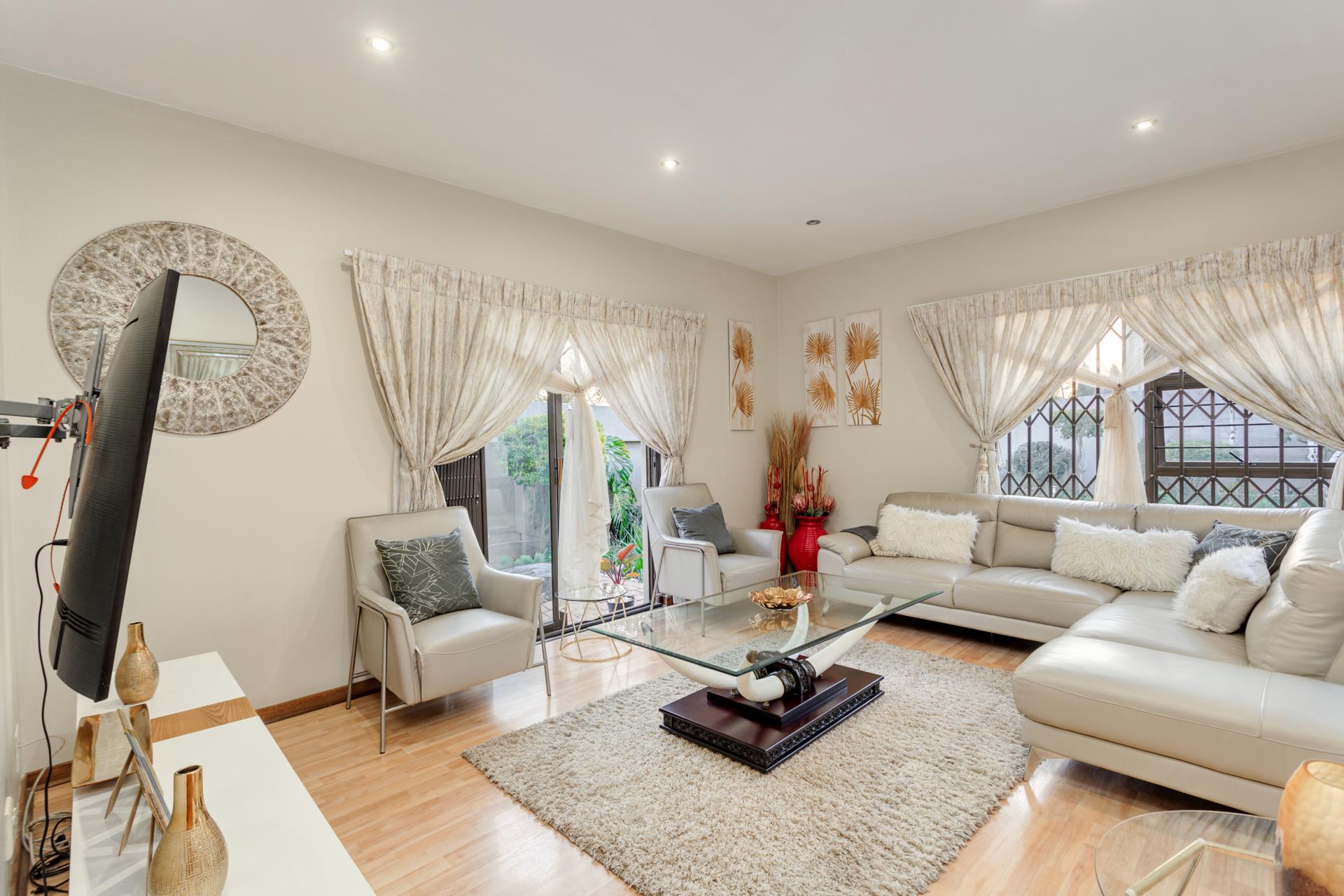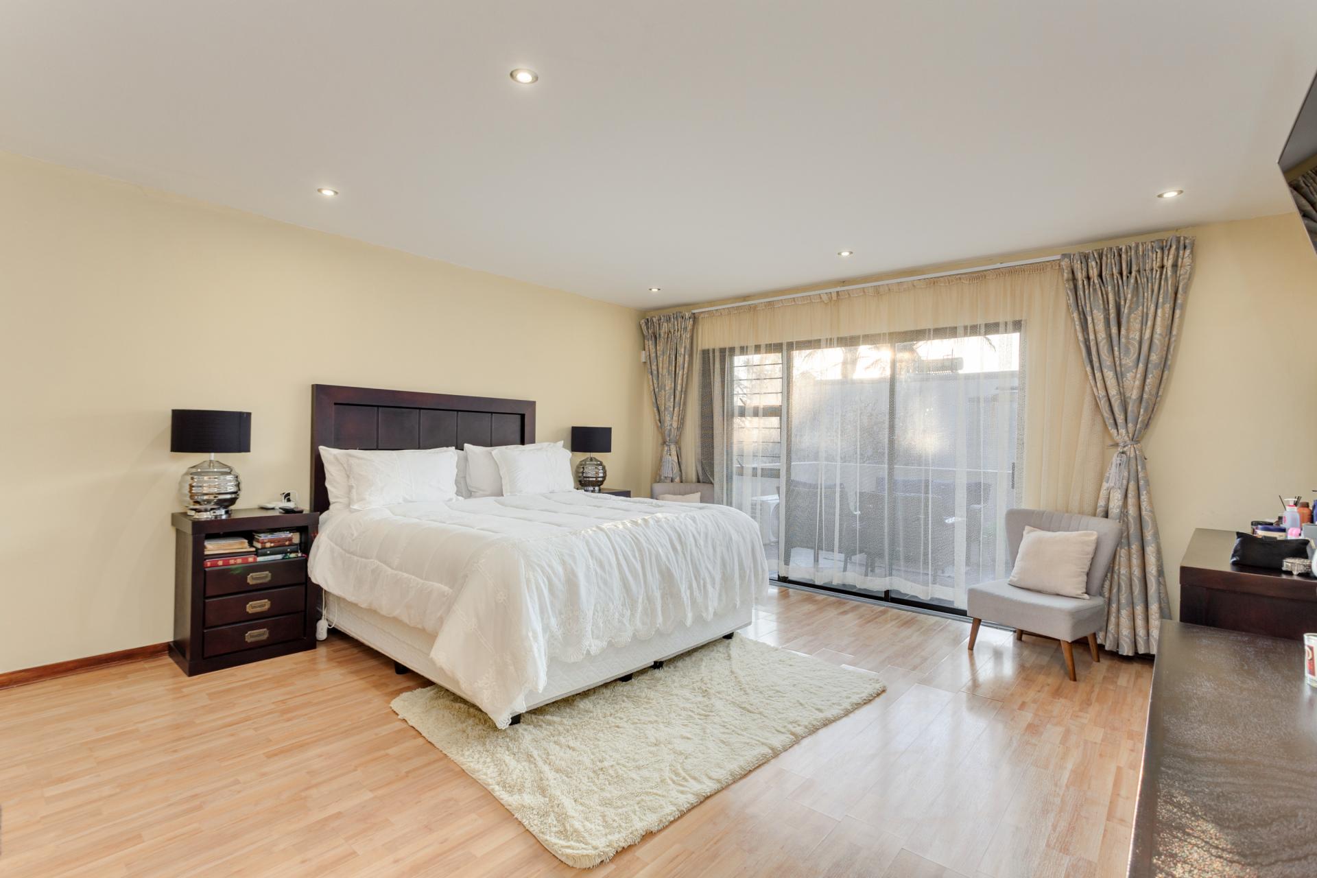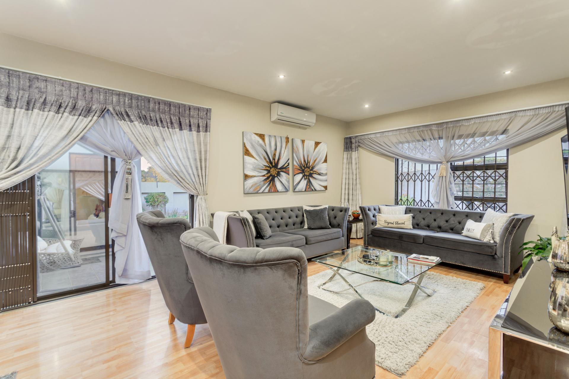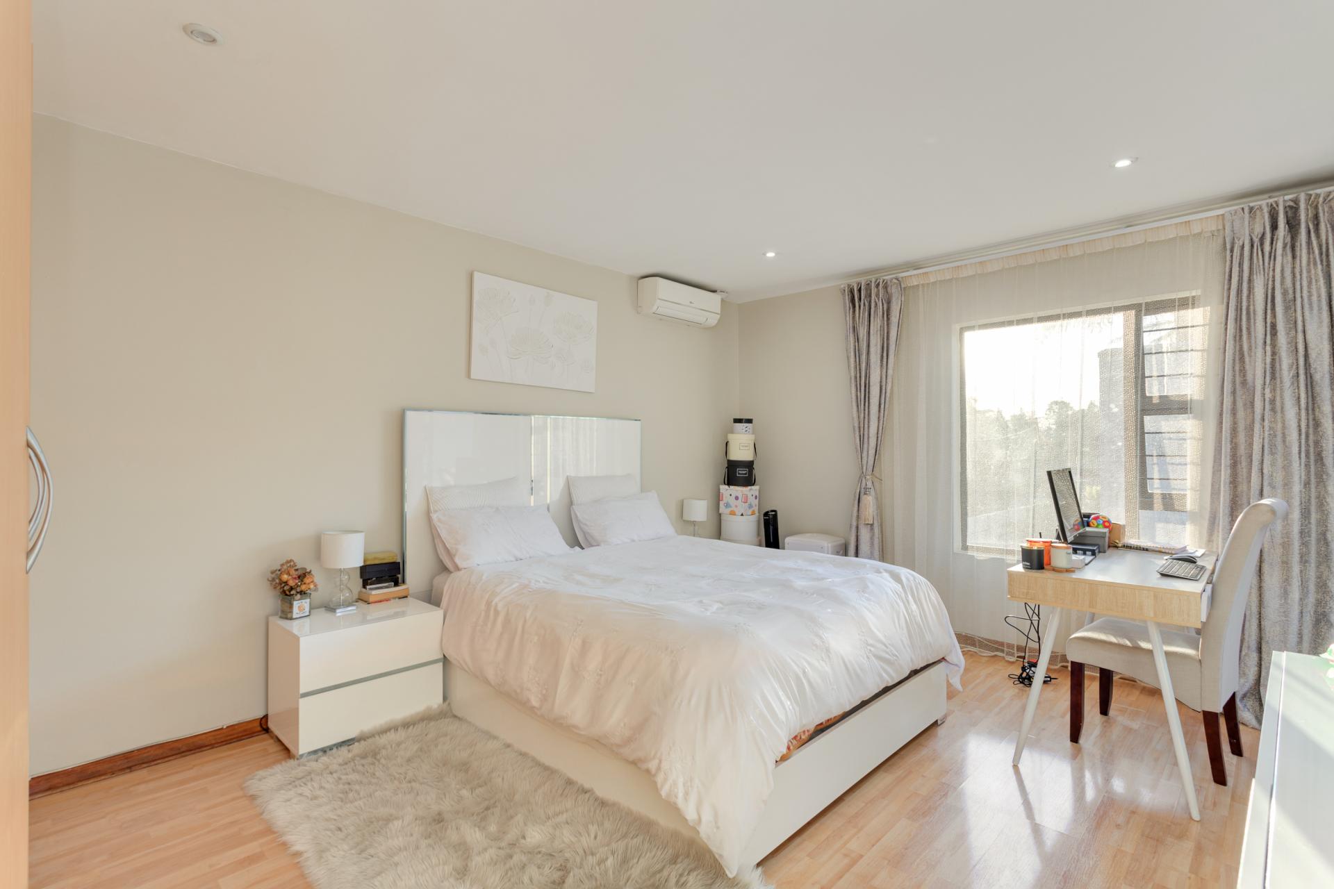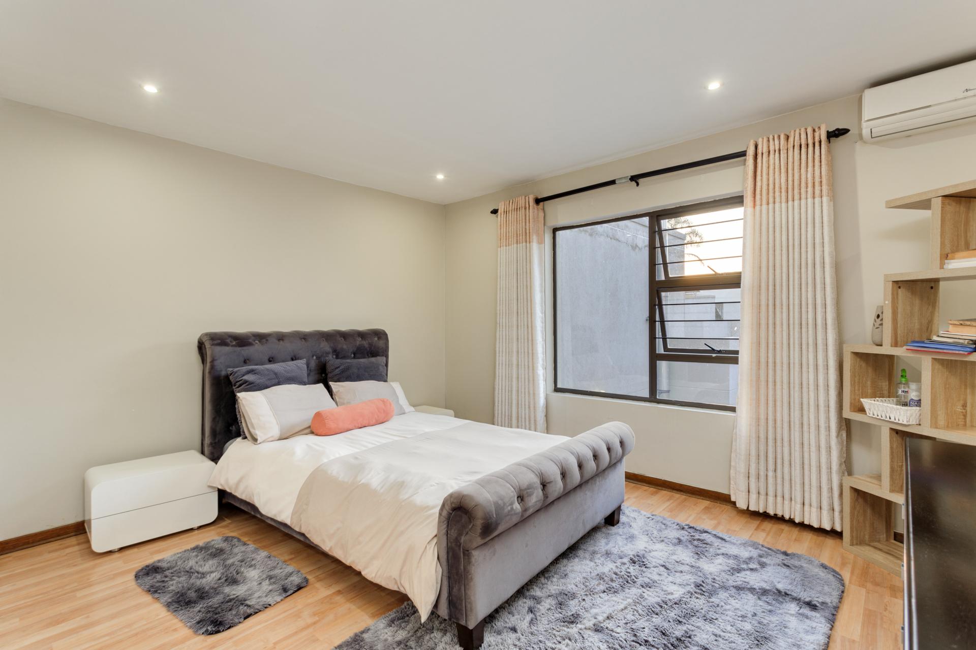 A lovely modern, spacious, and light property with a well-positioned private garden, situated within a secure estate with a backup power system consisting of 12 panels, 4 batteries and a 5 kVa inverter. The property is situated in Bryanston and offers 5 bedrooms. As one enters from the front door you are greeted with a modern, tiled, open plan lounge (with morso fire place) and dining room area with an easy flow into the modern granite top kitchen. The kitchen has a built-in stove, ample cupboard space, and an additional space ideal for a laundry. Adjacent to the kitchen area is a bar and entertainment area blending indoor and outdoor entertaining. There is also a staircase leading up to a private 5th bedroom, ideal for guests or adult children. Downstairs has an additional 2 bedrooms, sharing a guest bathroom. The home leads out seamlessly to a lovely entertainment area comprising a courtyard and swimming pool with a level garden. Upstairs boast 3 spacious bedrooms, all with built in cupboards offering a spacious environment. The main bedroom has a full en-suite, walk in closet and a spacious balcony. This stunning home has aircons in every room, CCTV, a double garage and staff accommodation, making it an ideal fit for any family with ample extras.
