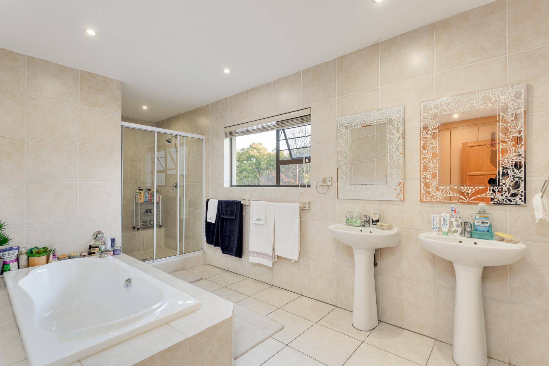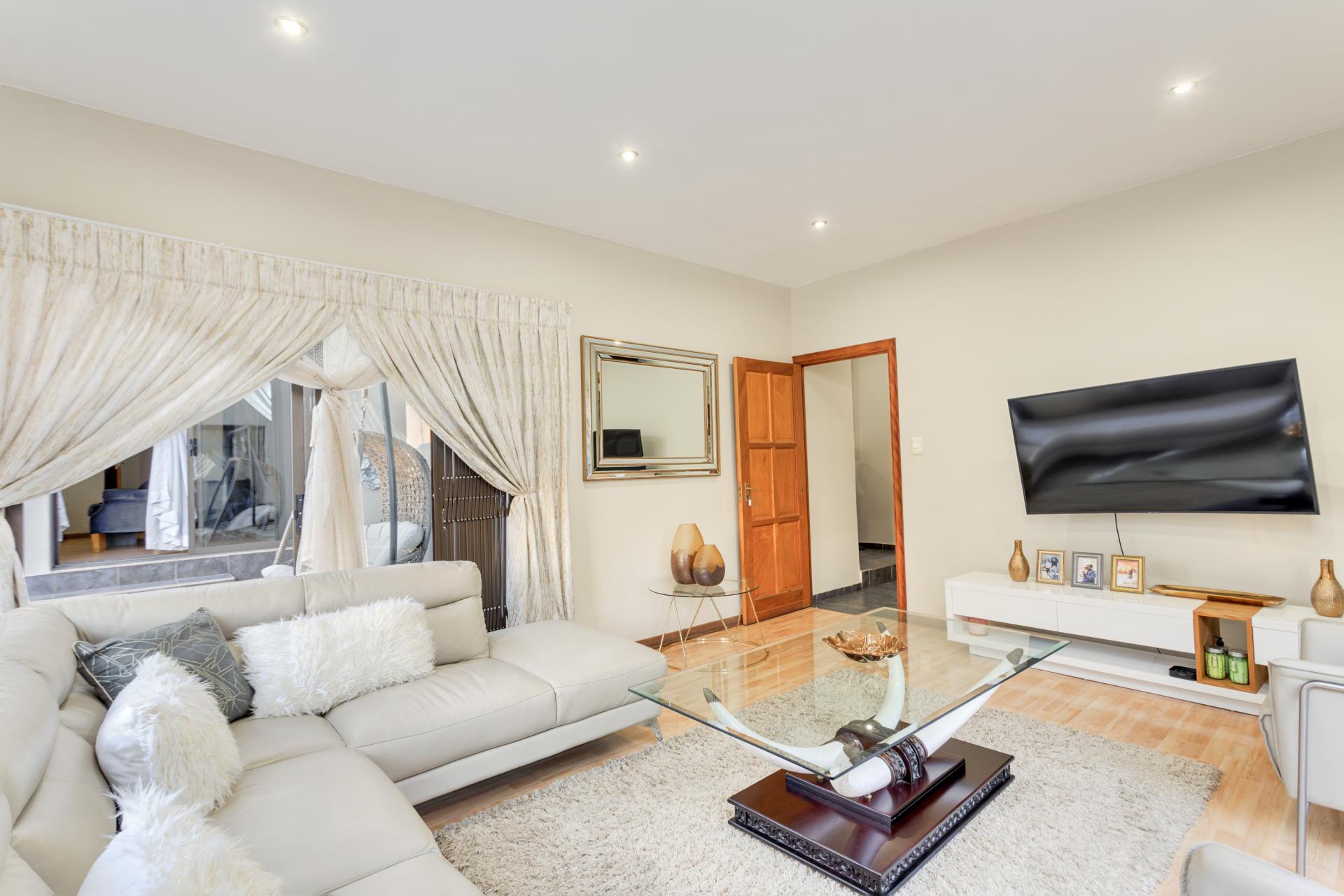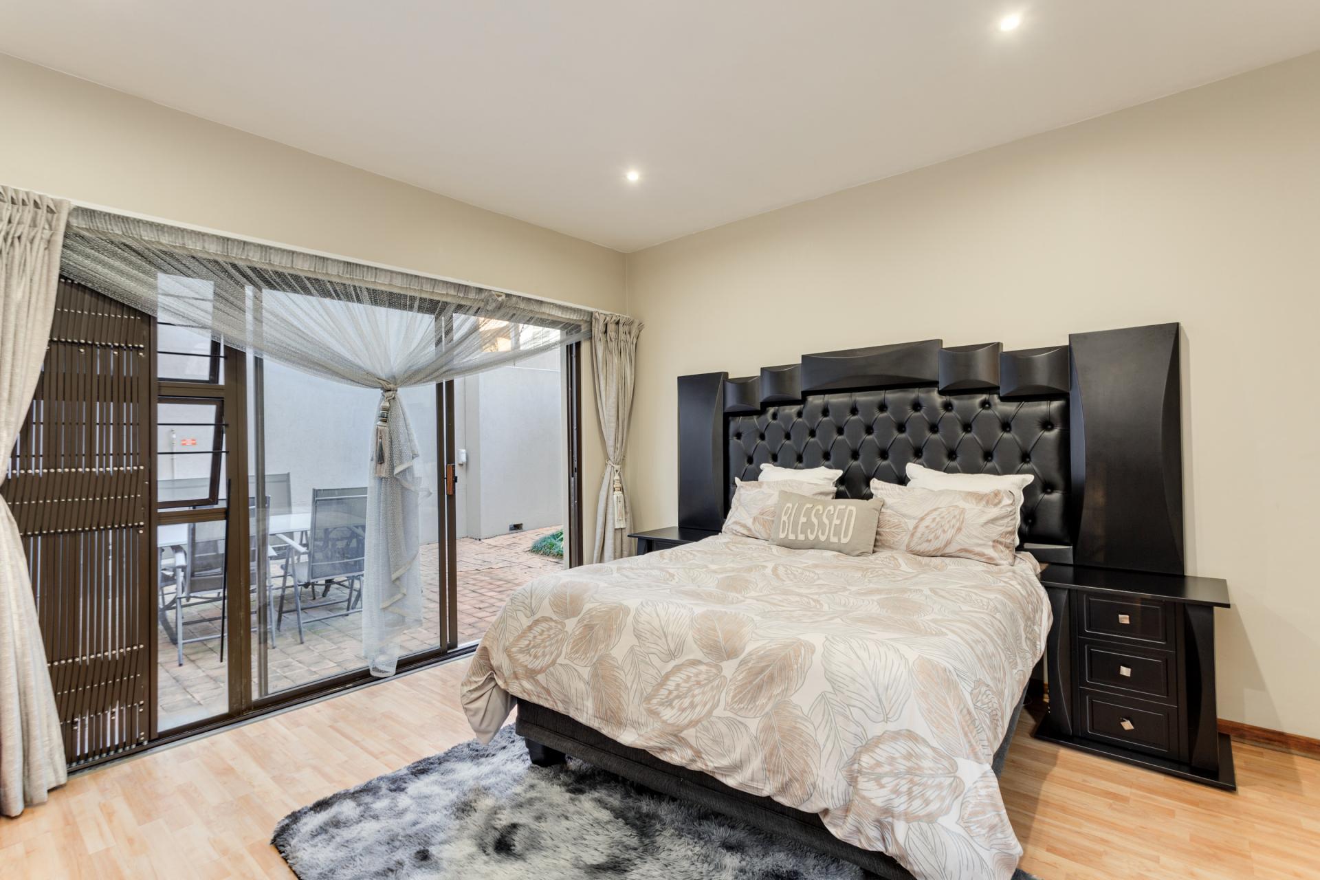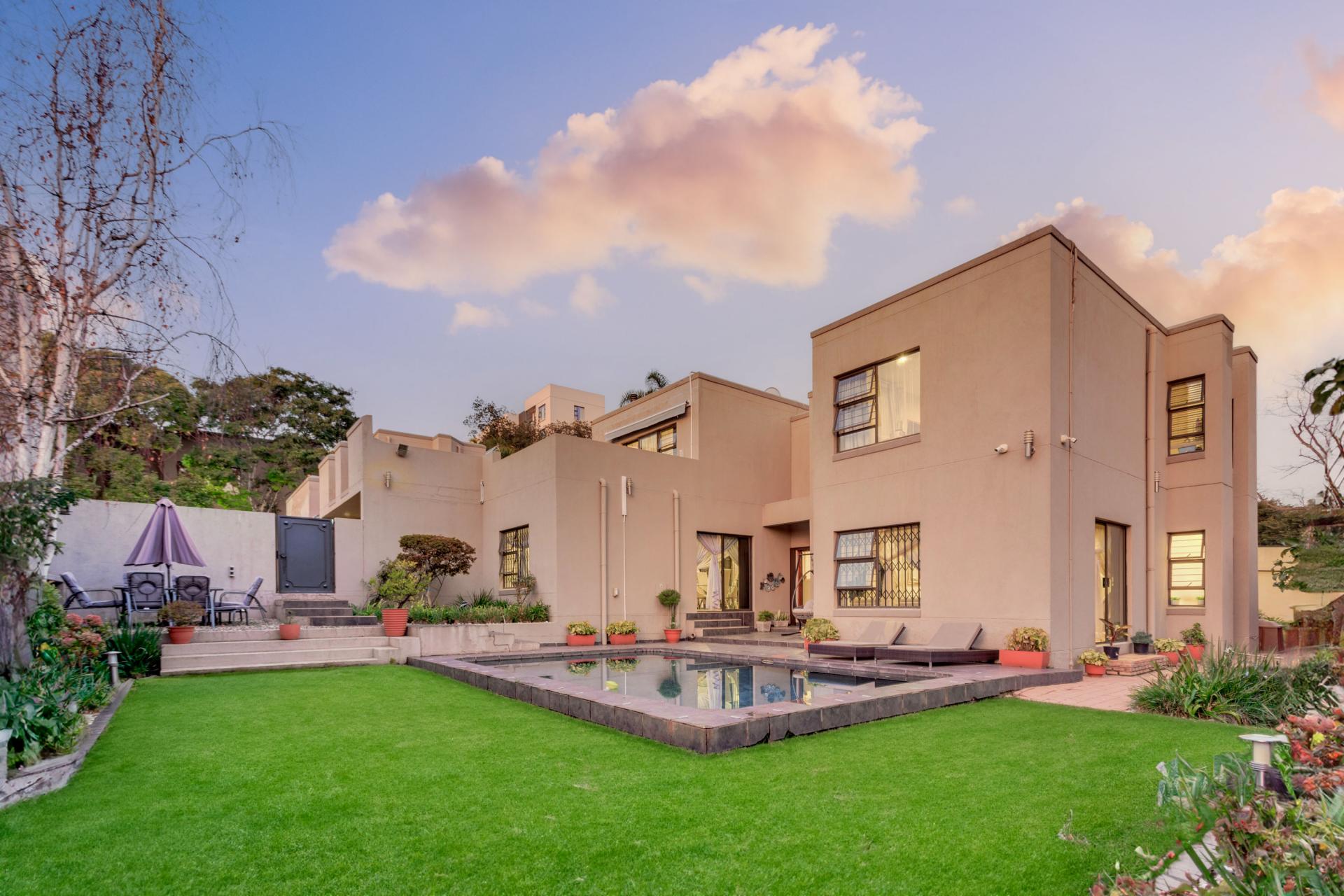 A lovely modern, spacious, and light property with a well-positioned private garden, situated within a secure estate with a backup power system consisting of 12 panels, 4 batteries and a 5 kVa inverter. The property is situated in Bryanston and offers 5 bedrooms. As one enters from the front door you are greeted with a modern, tiled, open plan lounge (with morso fire place) and dining room area with an easy flow into the modern granite top kitchen. The kitchen has a built-in stove, ample cupboard space, and an additional space ideal for a laundry. Adjacent to the kitchen area is a bar and entertainment area blending indoor and outdoor entertaining. There is also a staircase leading up to a private 5th bedroom, ideal for guests or adult children. Downstairs has an additional 2 bedrooms, sharing a guest bathroom. The home leads out seamlessly to a lovely entertainment area comprising a courtyard and swimming pool with a level garden. Upstairs boast 3 spacious bedrooms, all with built in cupboards offering a spacious environment. The main bedroom has a full en-suite, walk in closet and a spacious balcony. This stunning home has aircons in every room, CCTV, a double garage and staff accommodation, making it an ideal fit for any family with ample extras.