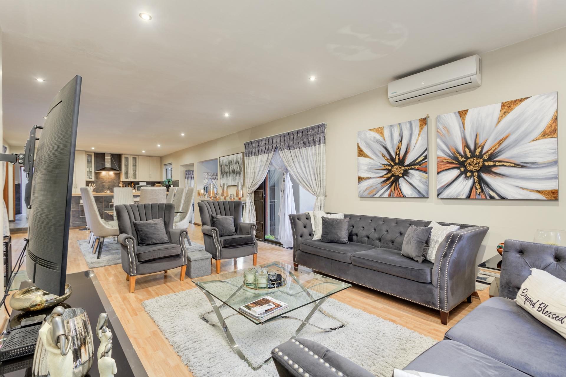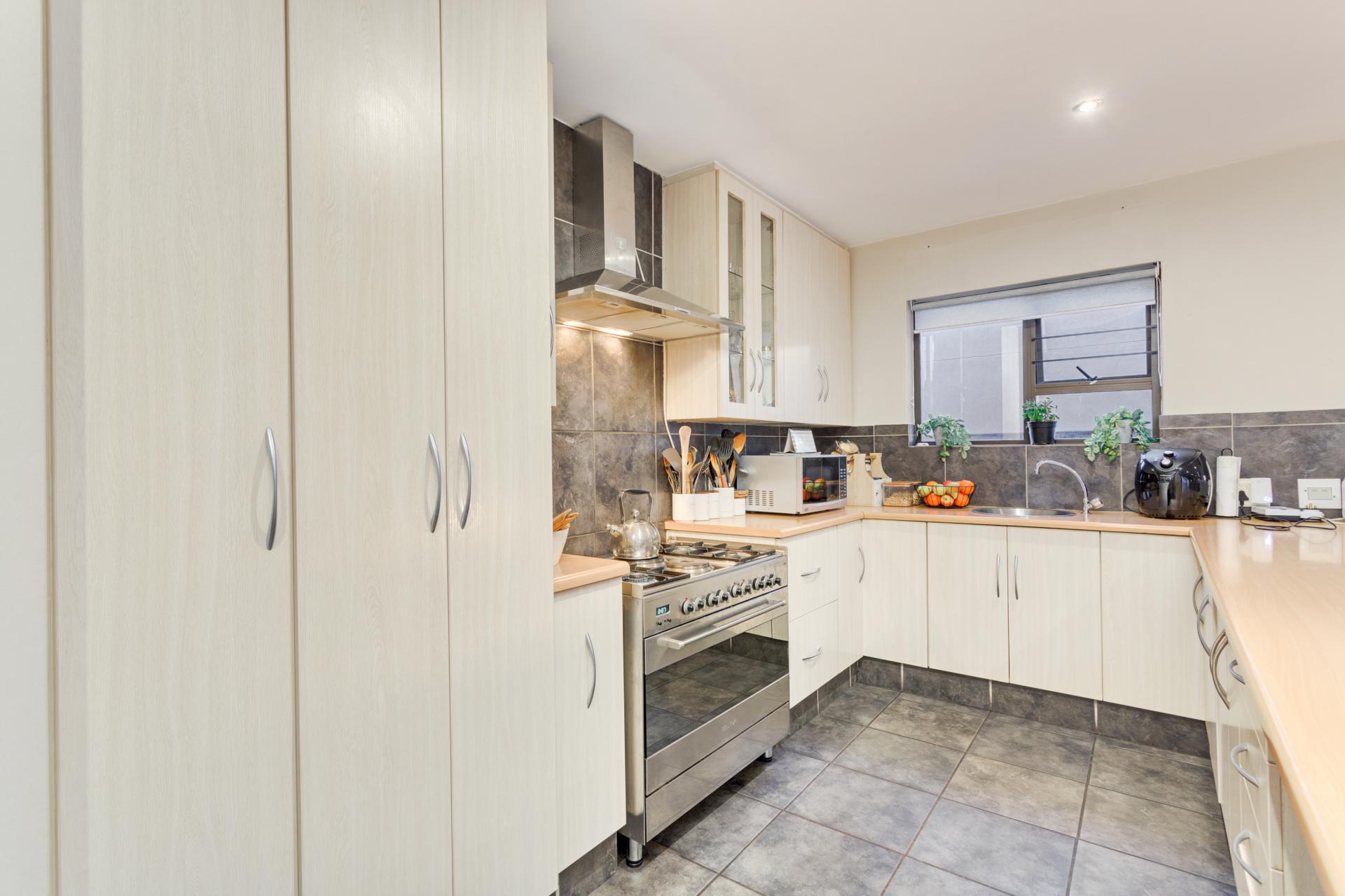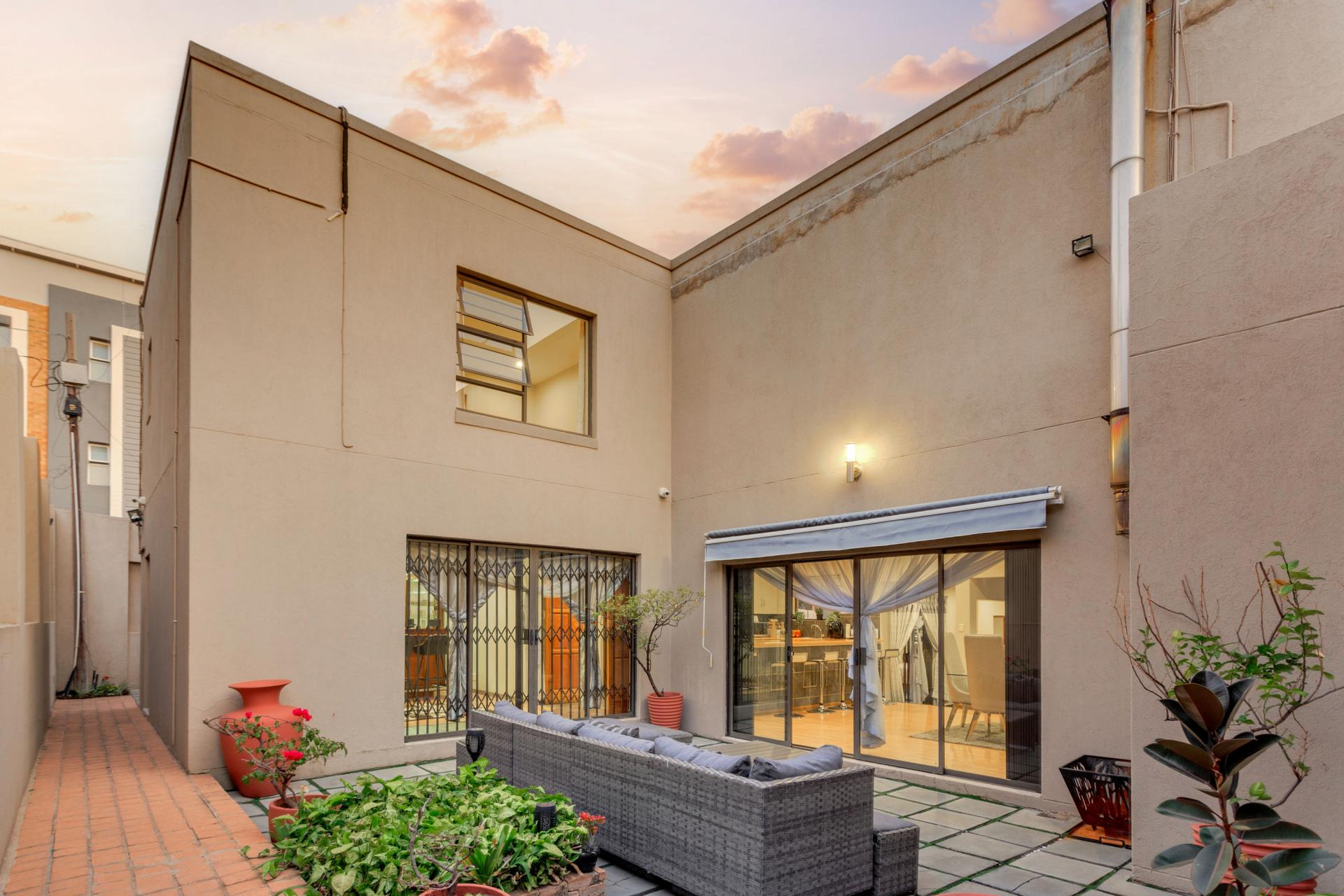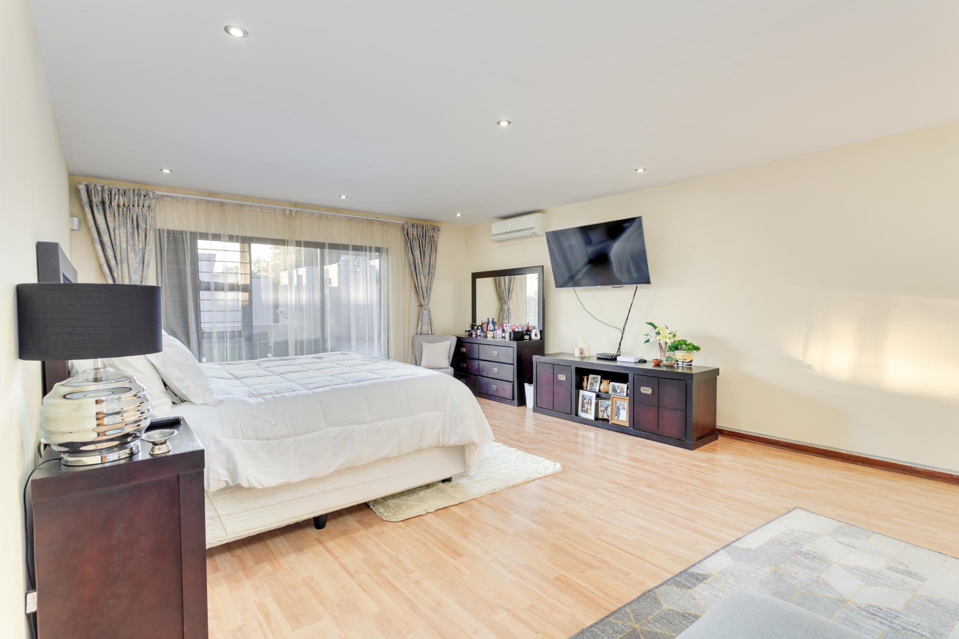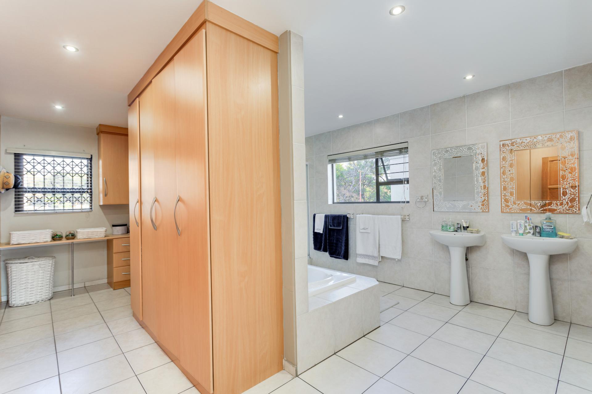 A lovely modern, spacious, and light property with a well-positioned private garden, situated within a secure estate with a backup power system consisting of 12 panels, 4 batteries and a 5 kVa inverter. The property is situated in Bryanston and offers 5 bedrooms. As one enters from the front door you are greeted with a modern, tiled, open plan lounge (with morso fire place) and dining room area with an easy flow into the modern granite top kitchen. The kitchen has a built-in stove, ample cupboard space, and an additional space ideal for a laundry. Adjacent to the kitchen area is a bar and entertainment area blending indoor and outdoor entertaining. There is also a staircase leading up to a private 5th bedroom, ideal for guests or adult children. Downstairs has an additional 2 bedrooms, sharing a guest bathroom. The home leads out seamlessly to a lovely entertainment area comprising a courtyard and swimming pool with a level garden. Upstairs boast 3 spacious bedrooms, all with built in cupboards offering a spacious environment. The main bedroom has a full en-suite, walk in closet and a spacious balcony. This stunning home has aircons in every room, CCTV, a double garage and staff accommodation, making it an ideal fit for any family with ample extras.