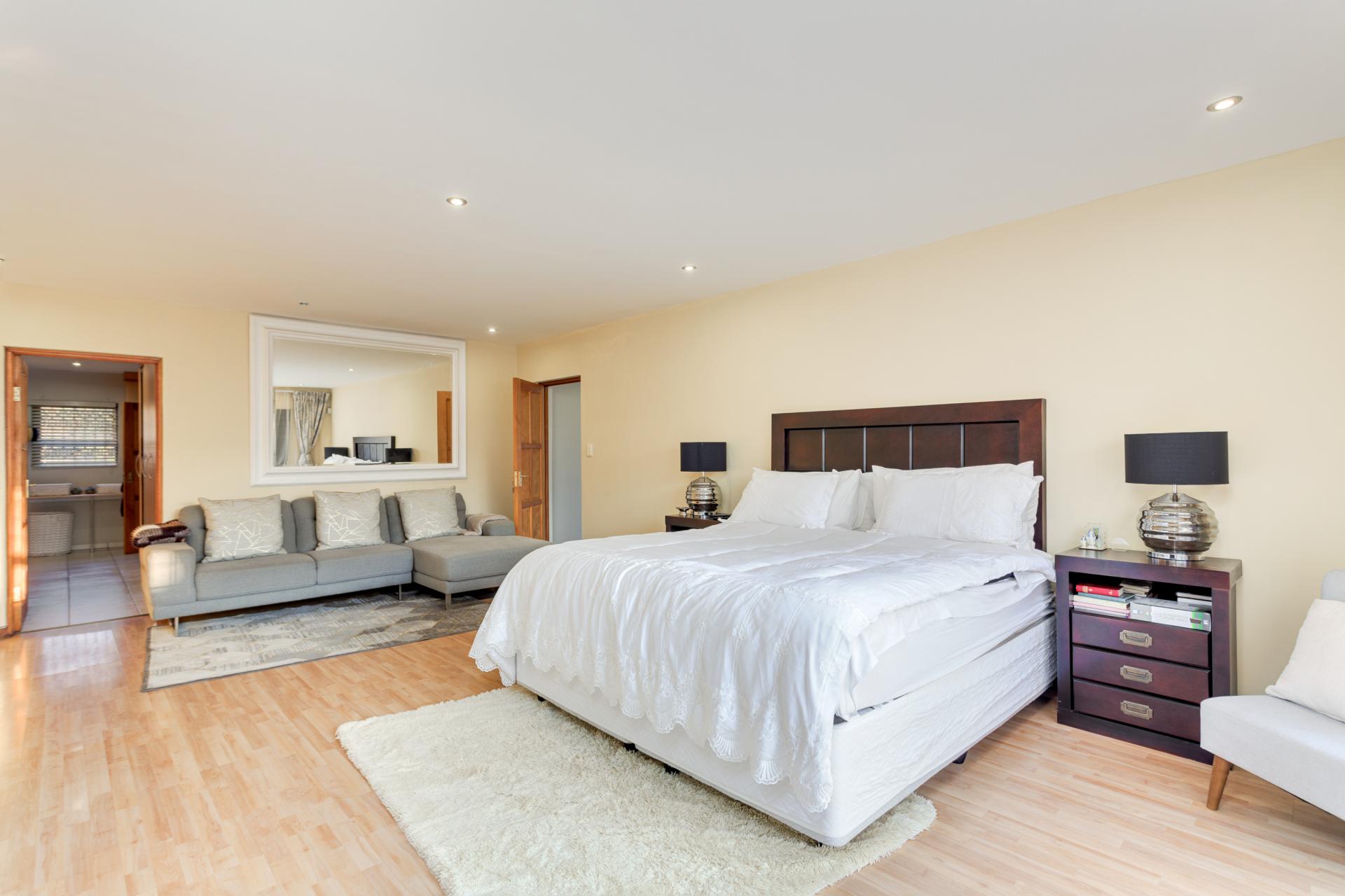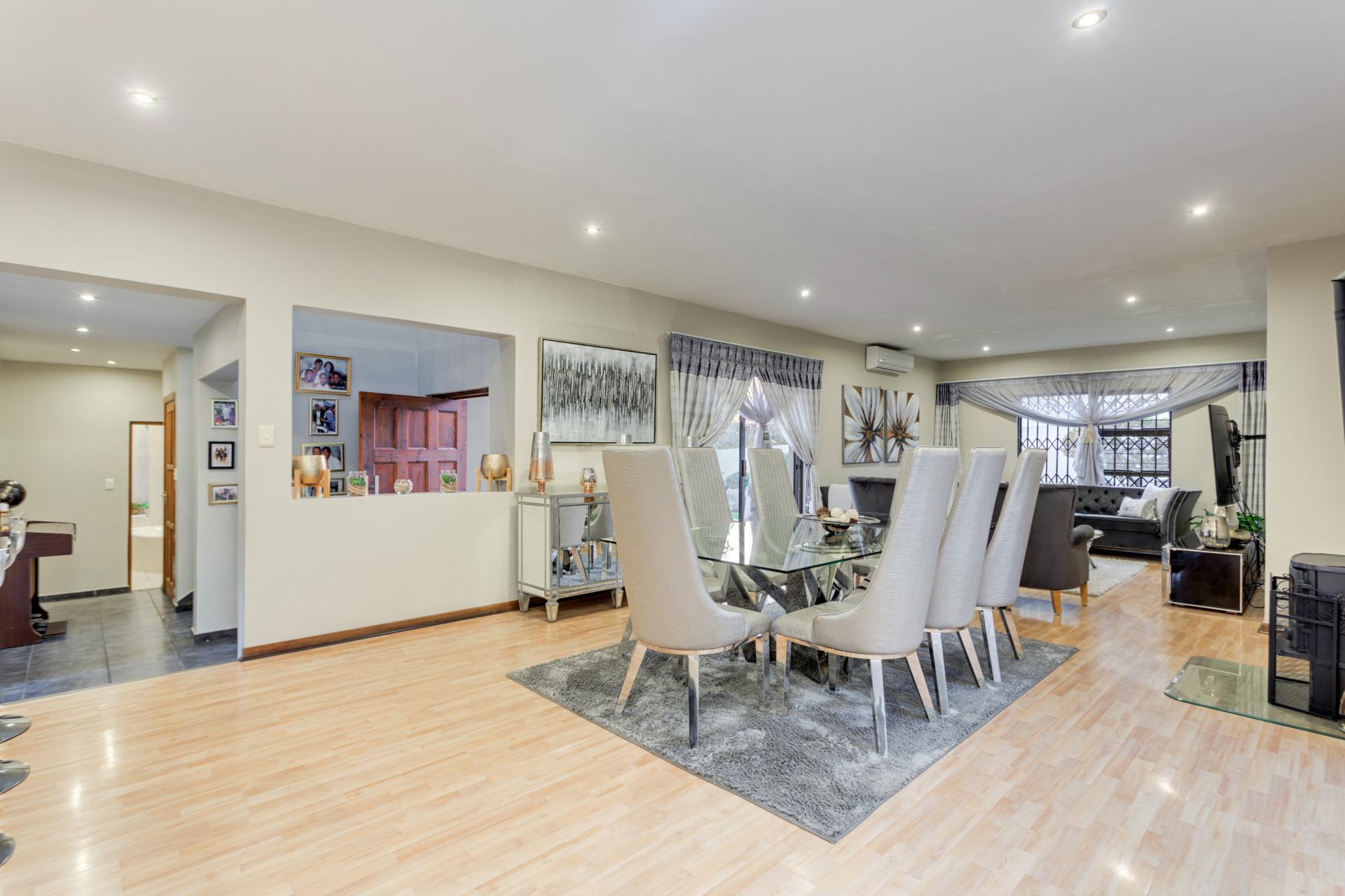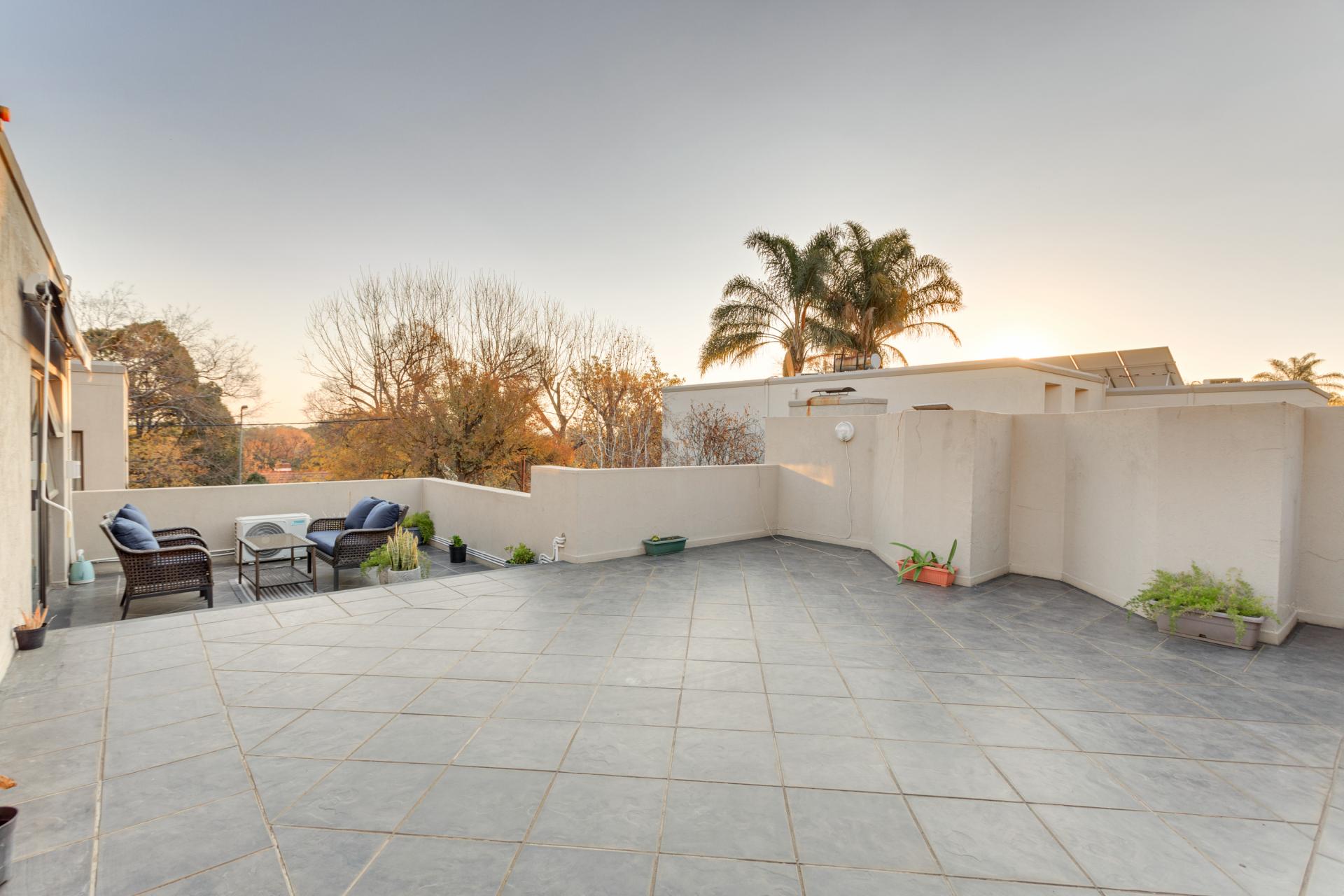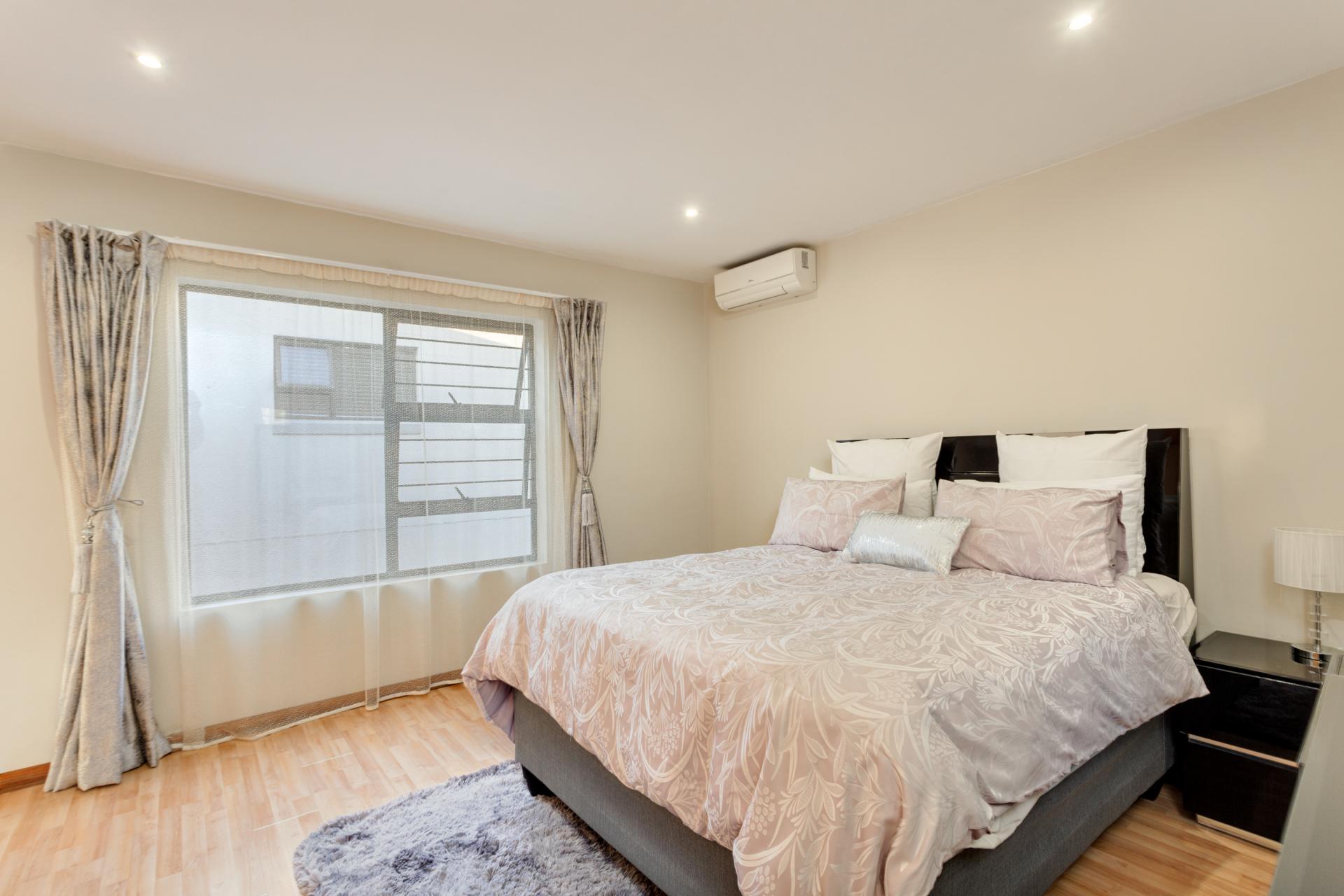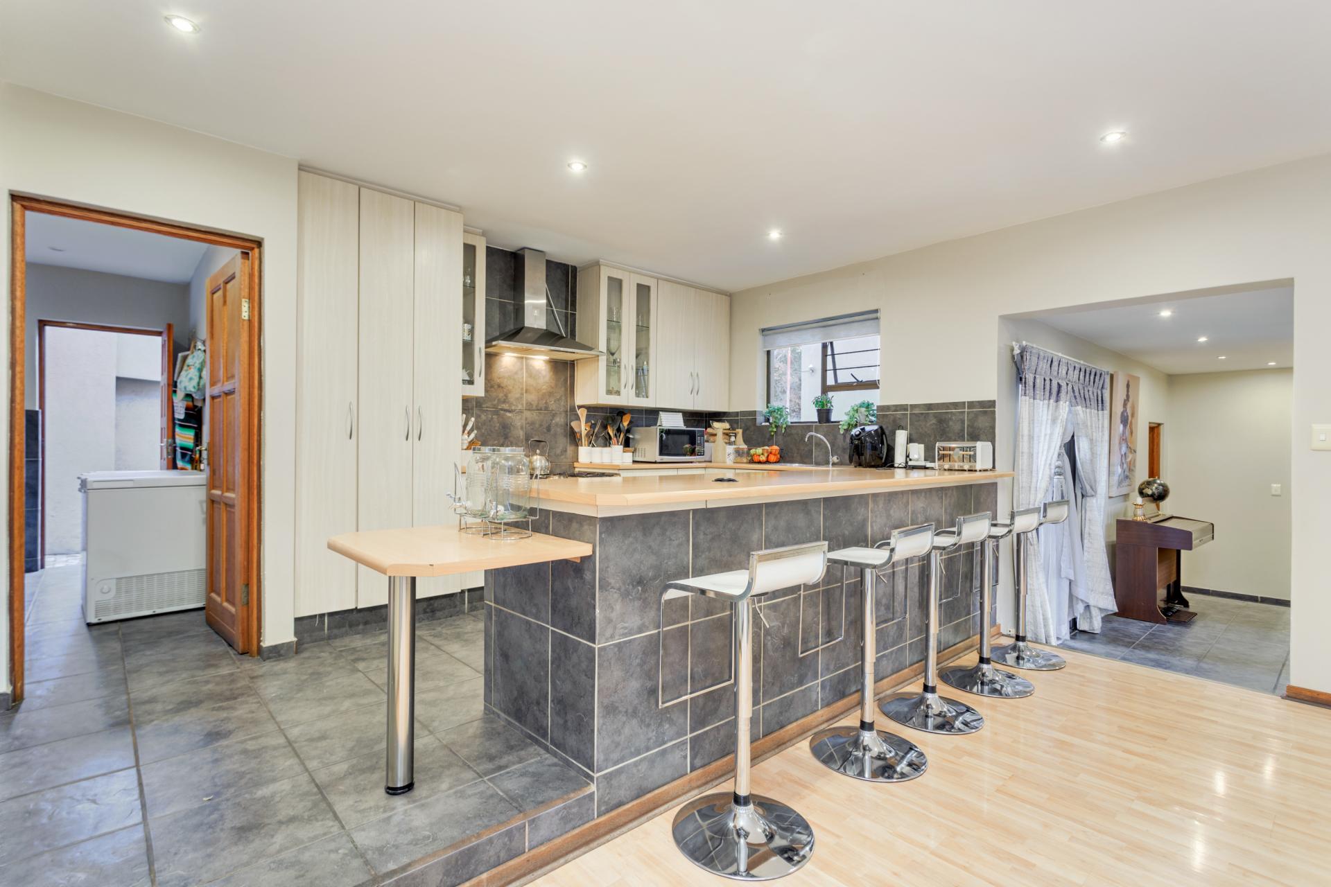 A lovely modern, spacious, and light property with a well-positioned private garden, situated within a secure estate with a backup power system consisting of 12 panels, 4 batteries and a 5 kVa inverter. The property is situated in Bryanston and offers 5 bedrooms. As one enters from the front door you are greeted with a modern, tiled, open plan lounge (with morso fire place) and dining room area with an easy flow into the modern granite top kitchen. The kitchen has a built-in stove, ample cupboard space, and an additional space ideal for a laundry. Adjacent to the kitchen area is a bar and entertainment area blending indoor and outdoor entertaining. There is also a staircase leading up to a private 5th bedroom, ideal for guests or adult children. Downstairs has an additional 2 bedrooms, sharing a guest bathroom. The home leads out seamlessly to a lovely entertainment area comprising a courtyard and swimming pool with a level garden. Upstairs boast 3 spacious bedrooms, all with built in cupboards offering a spacious environment. The main bedroom has a full en-suite, walk in closet and a spacious balcony. This stunning home has aircons in every room, CCTV, a double garage and staff accommodation, making it an ideal fit for any family with ample extras.
