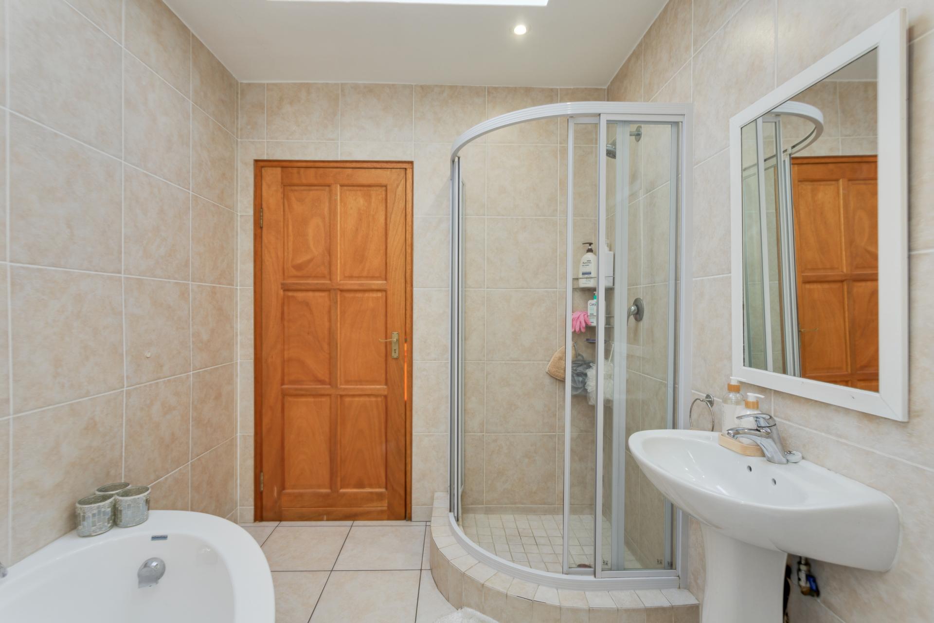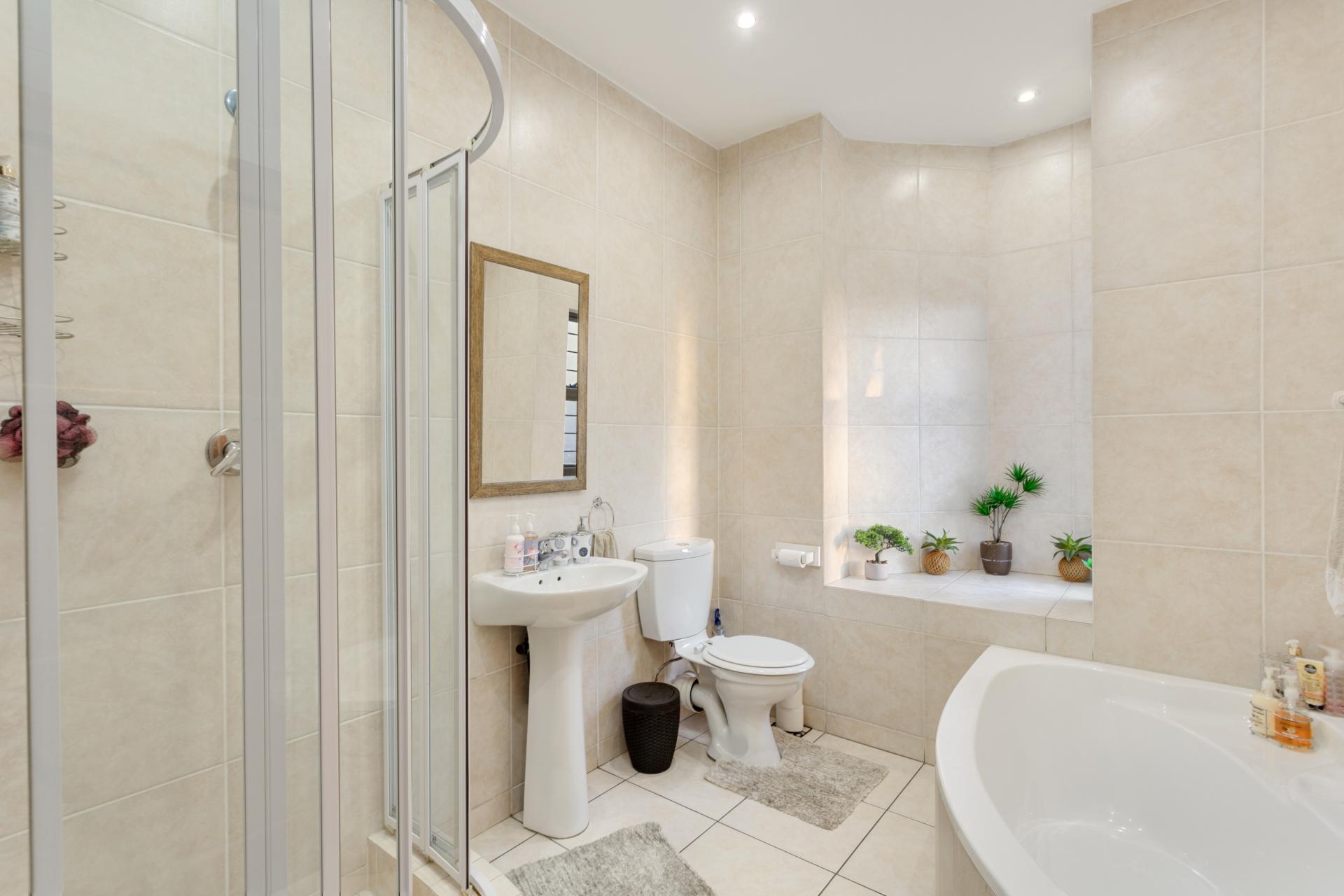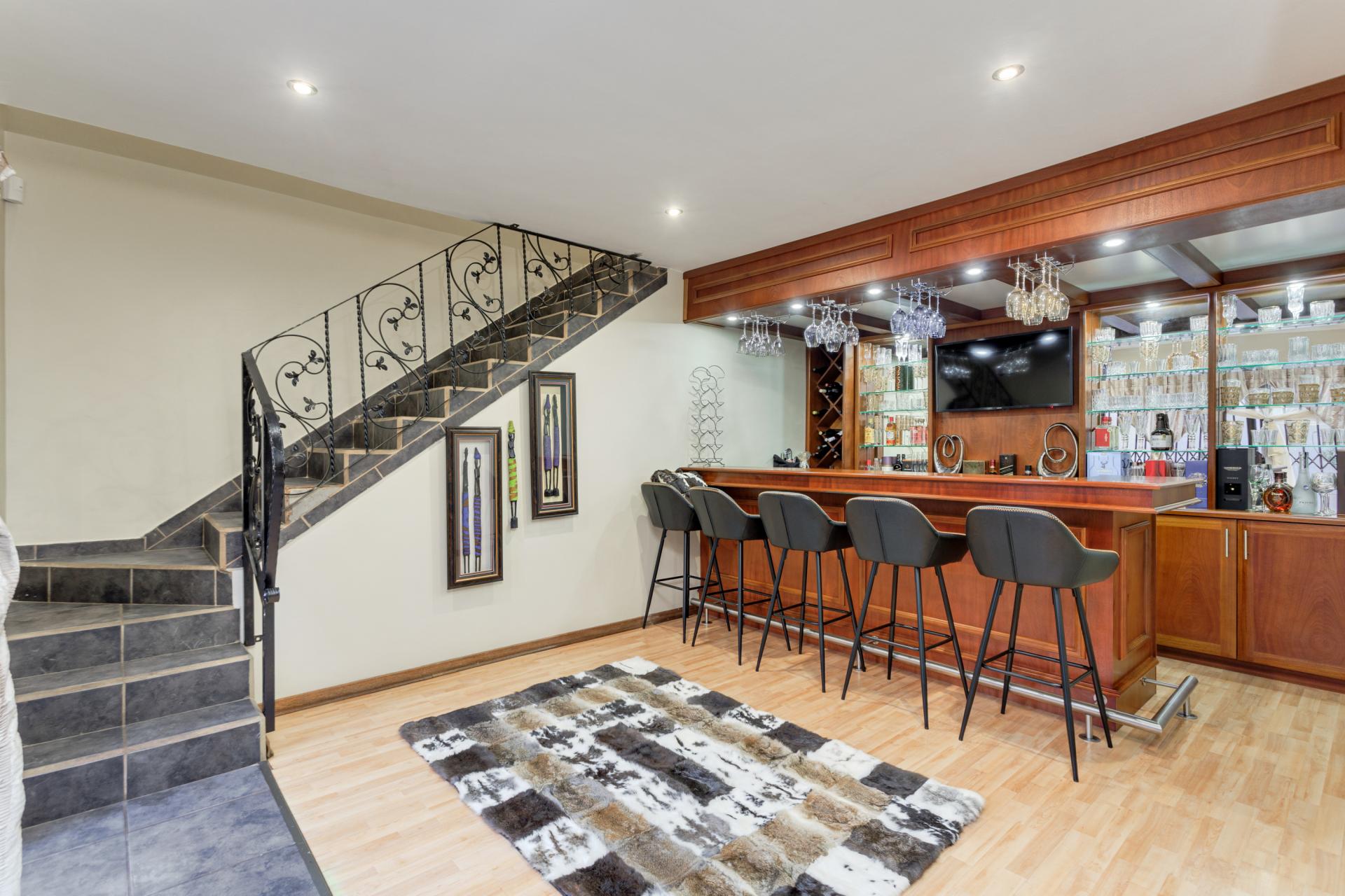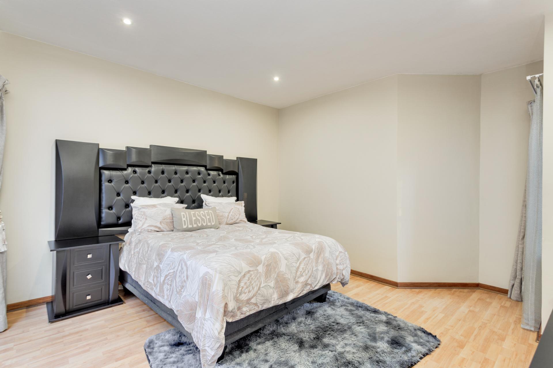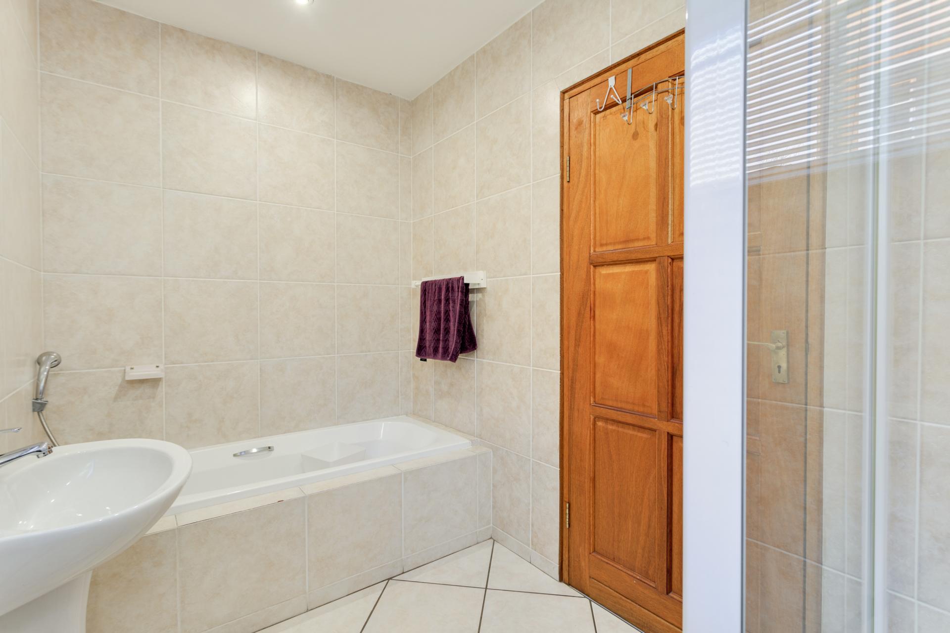 A lovely modern, spacious, and light property with a well-positioned private garden, situated within a secure estate with a backup power system consisting of 12 panels, 4 batteries and a 5 kVa inverter. The property is situated in Bryanston and offers 5 bedrooms. As one enters from the front door you are greeted with a modern, tiled, open plan lounge (with morso fire place) and dining room area with an easy flow into the modern granite top kitchen. The kitchen has a built-in stove, ample cupboard space, and an additional space ideal for a laundry. Adjacent to the kitchen area is a bar and entertainment area blending indoor and outdoor entertaining. There is also a staircase leading up to a private 5th bedroom, ideal for guests or adult children. Downstairs has an additional 2 bedrooms, sharing a guest bathroom. The home leads out seamlessly to a lovely entertainment area comprising a courtyard and swimming pool with a level garden. Upstairs boast 3 spacious bedrooms, all with built in cupboards offering a spacious environment. The main bedroom has a full en-suite, walk in closet and a spacious balcony. This stunning home has aircons in every room, CCTV, a double garage and staff accommodation, making it an ideal fit for any family with ample extras.