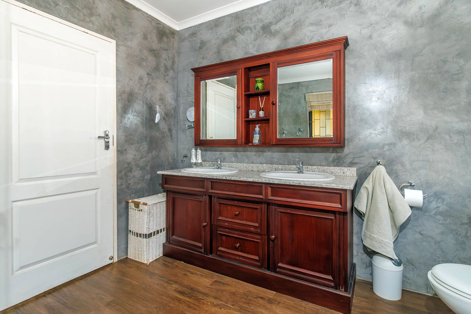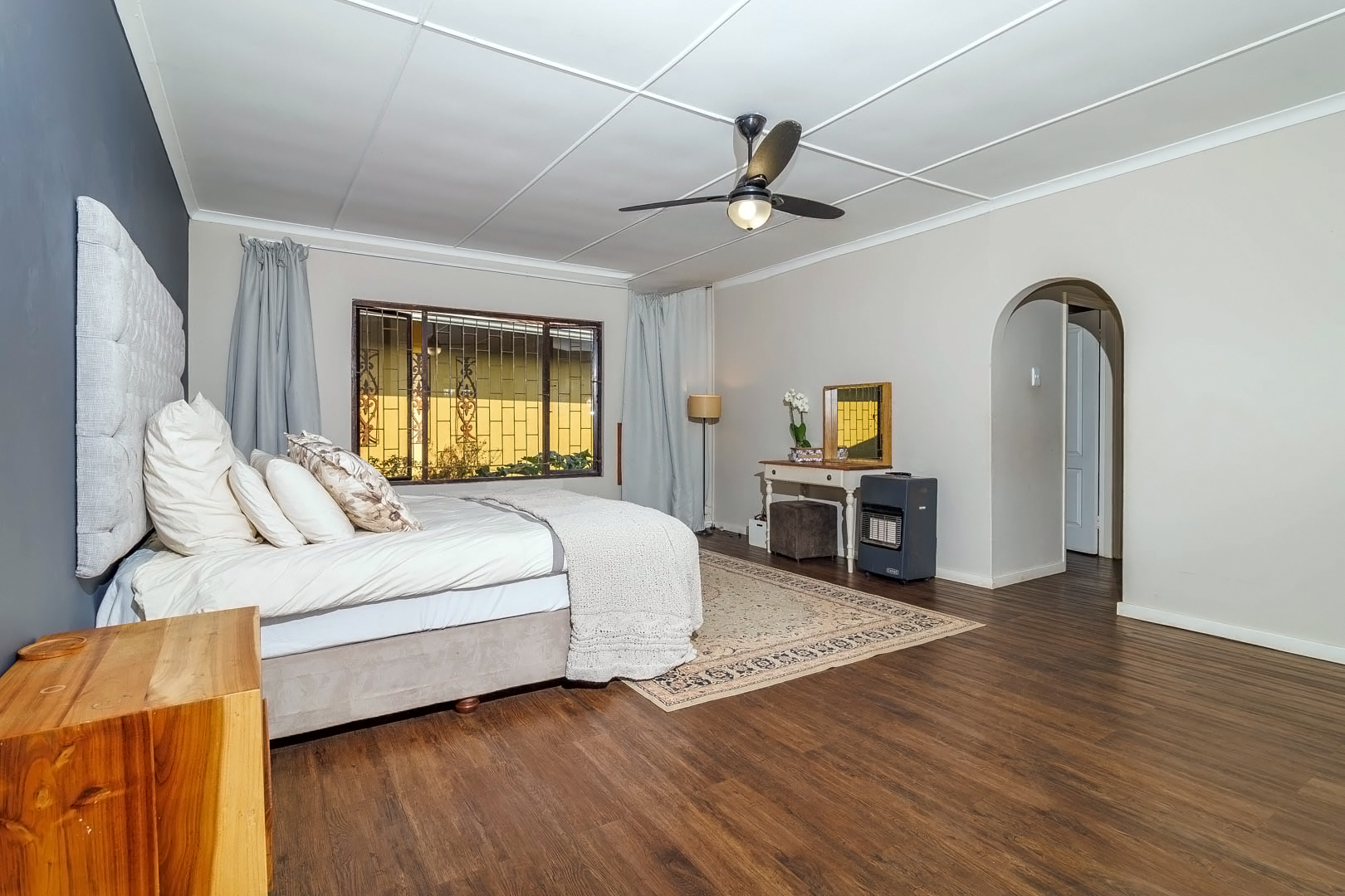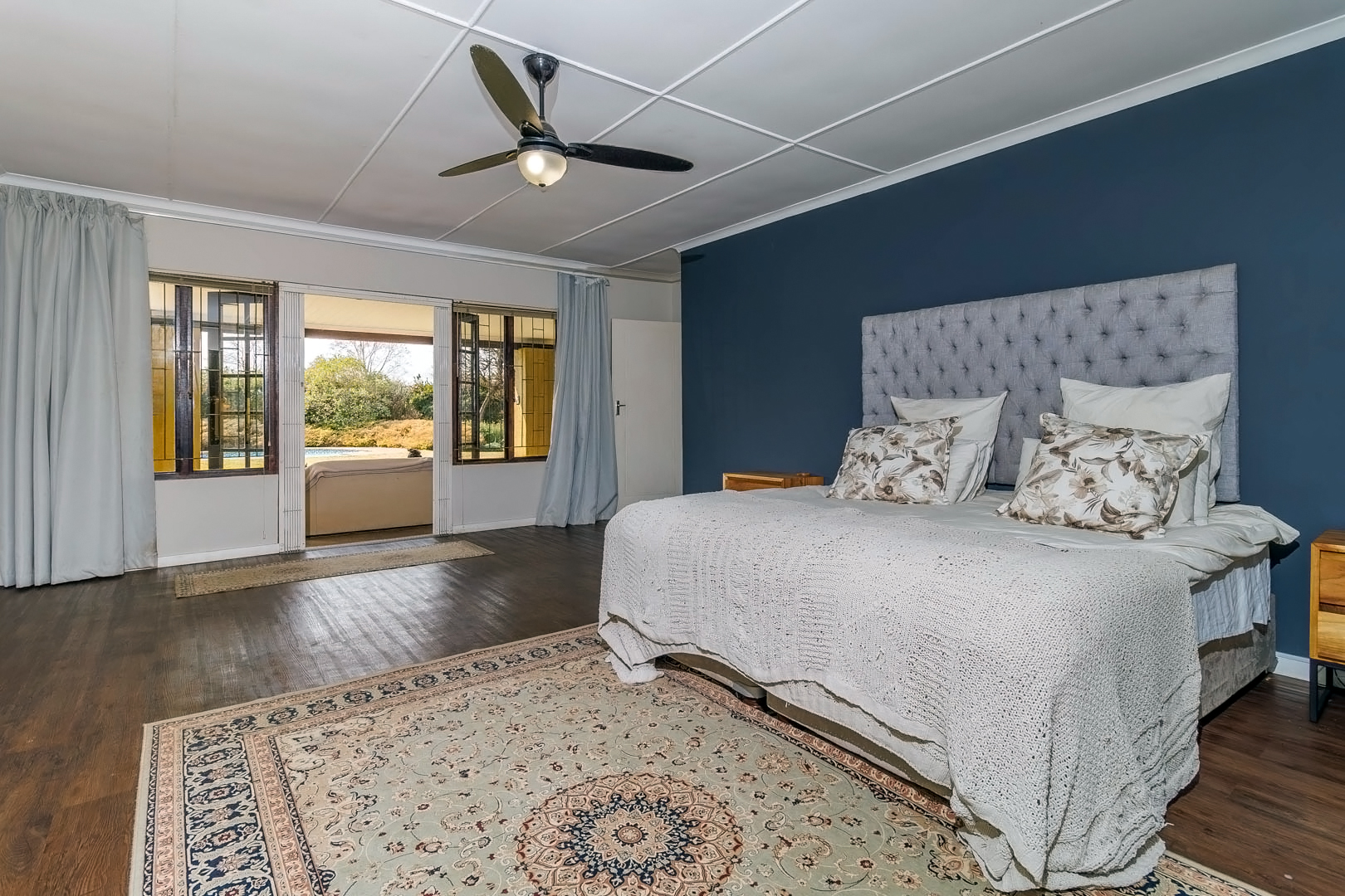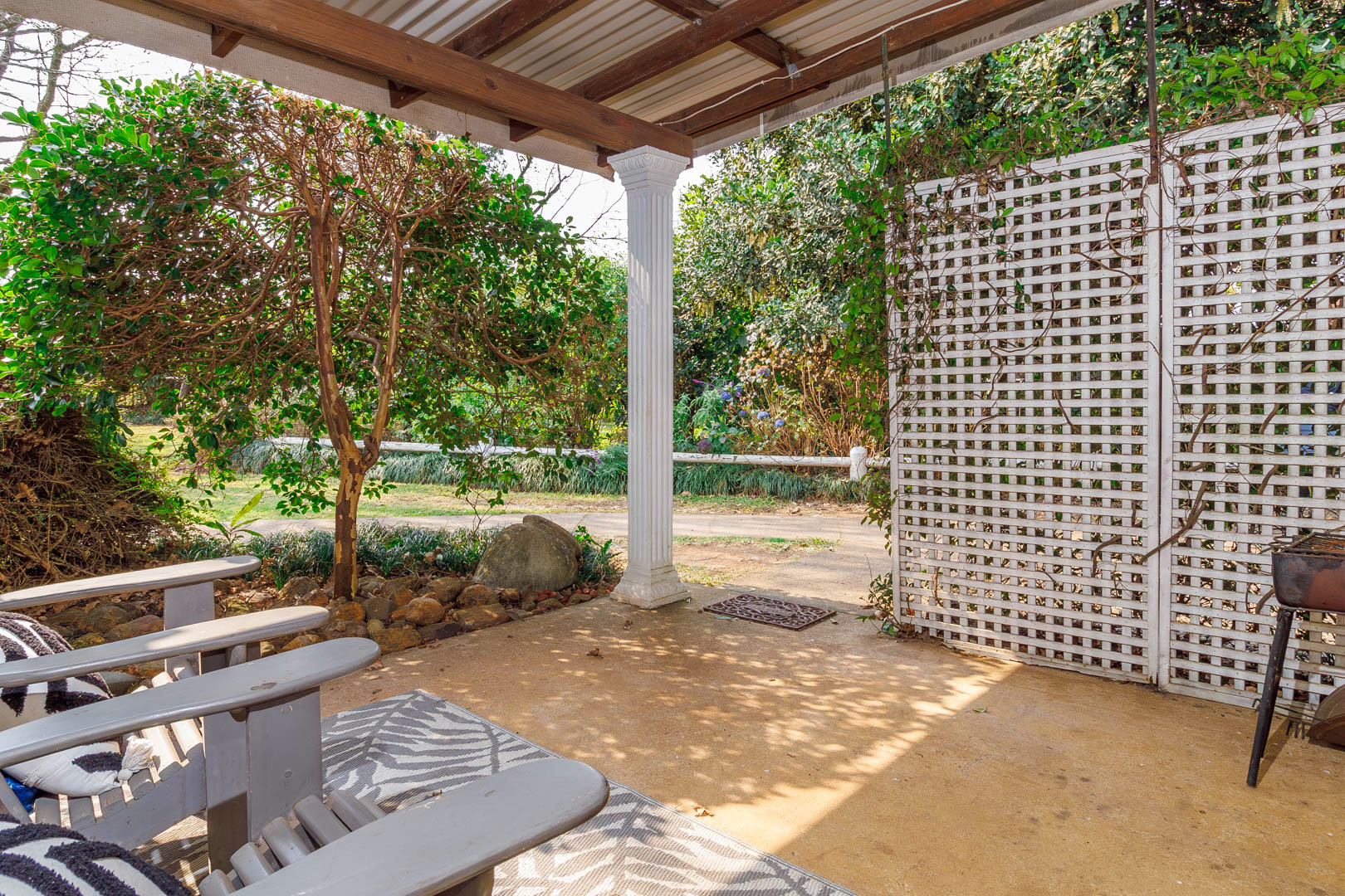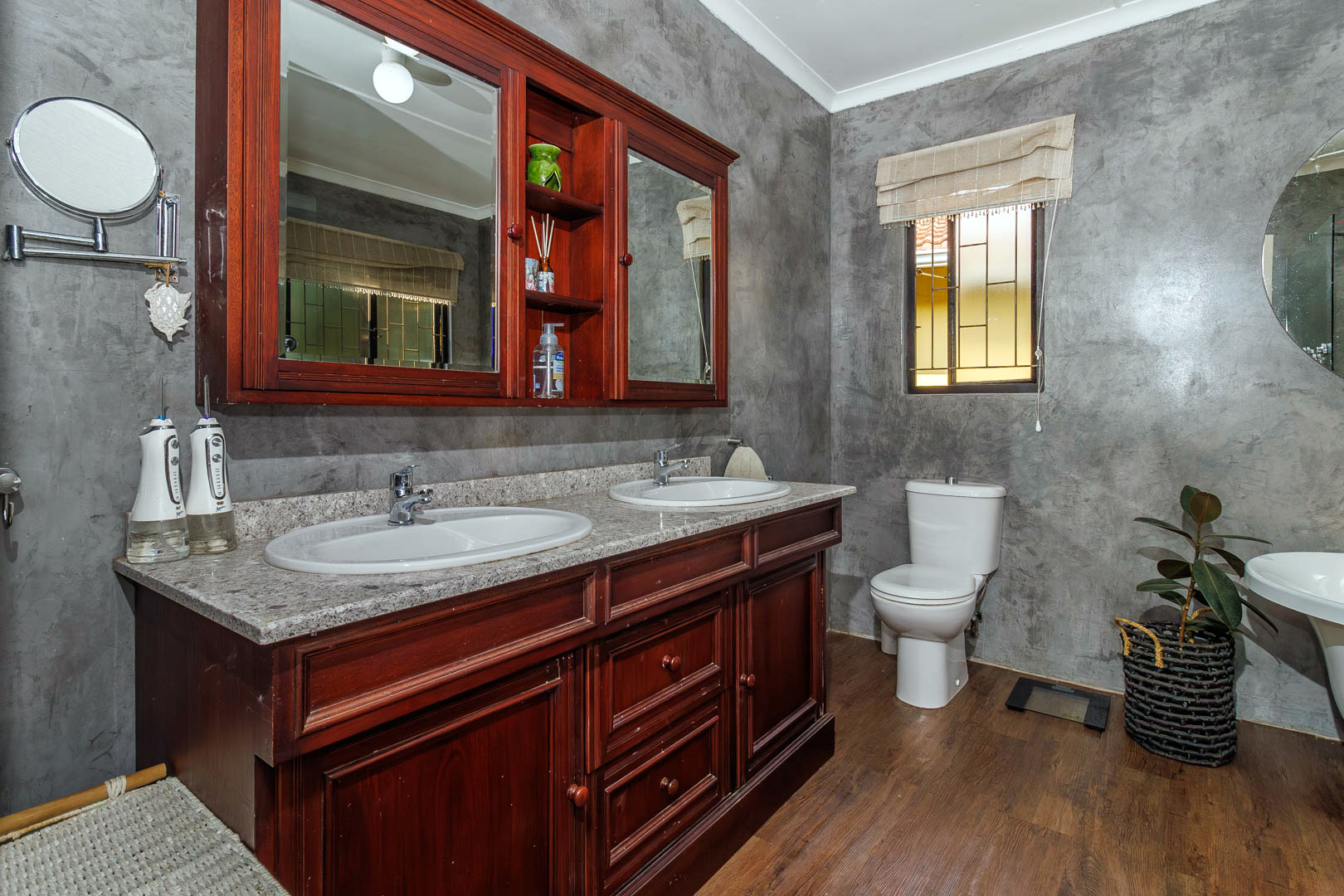 Practical extras include a three-car carport, double garage with secure storage, domestic quarters, and a sophisticated rainwater storage and solar heating system, ensuring efficient water use and cost savings.
