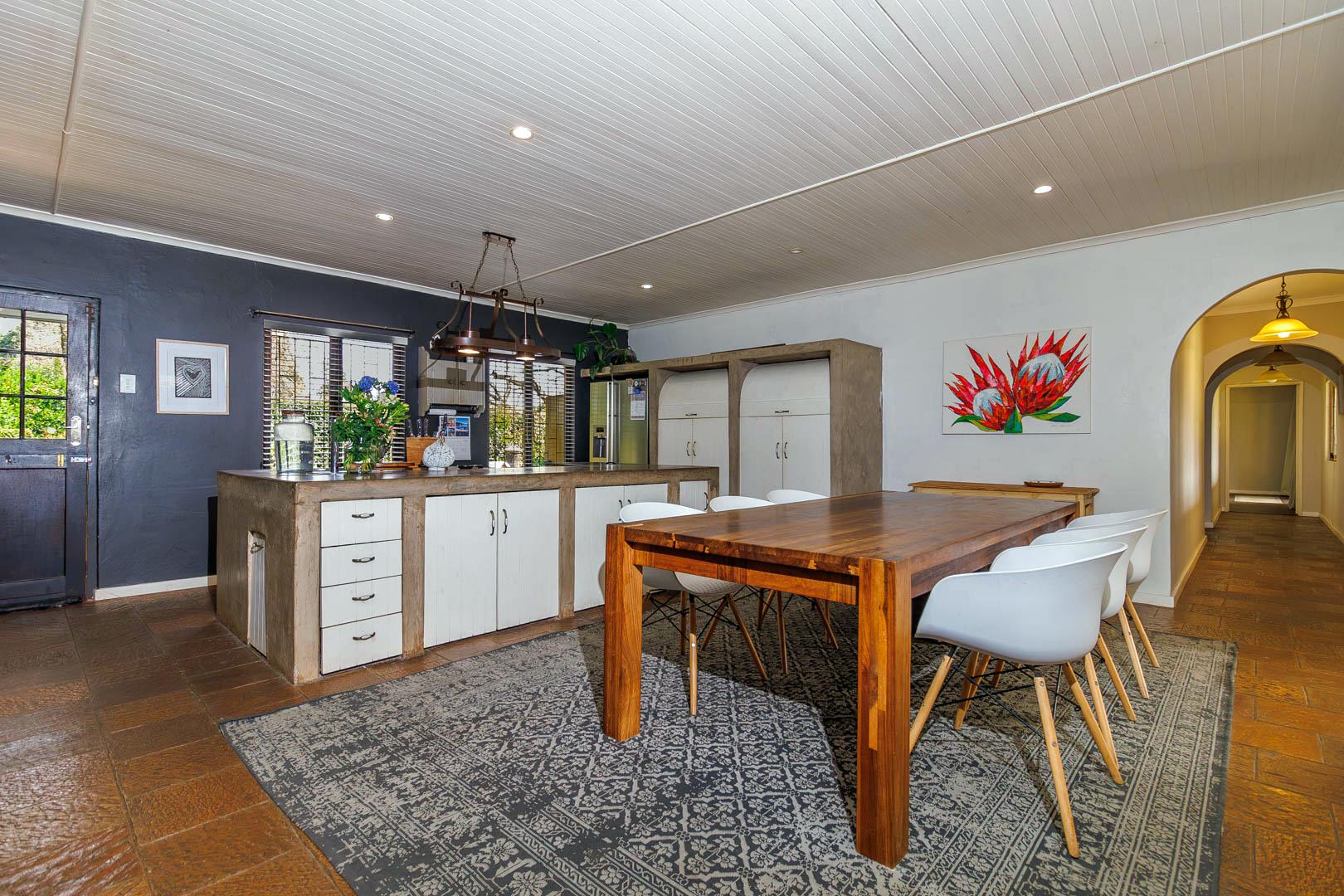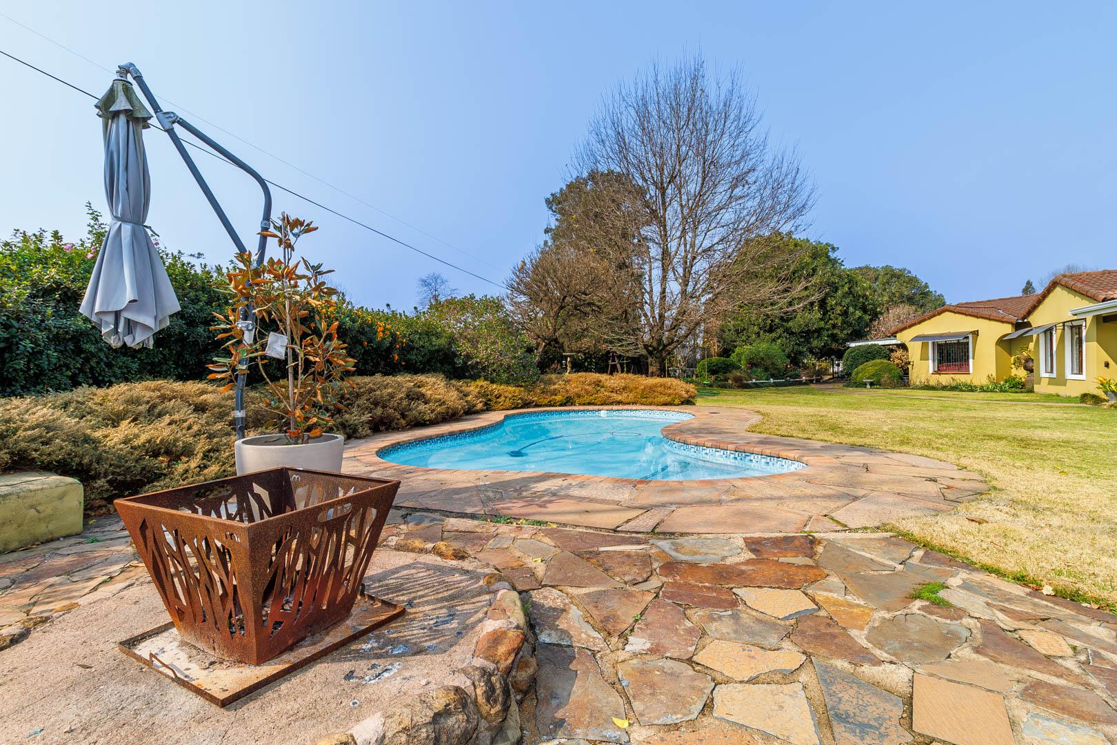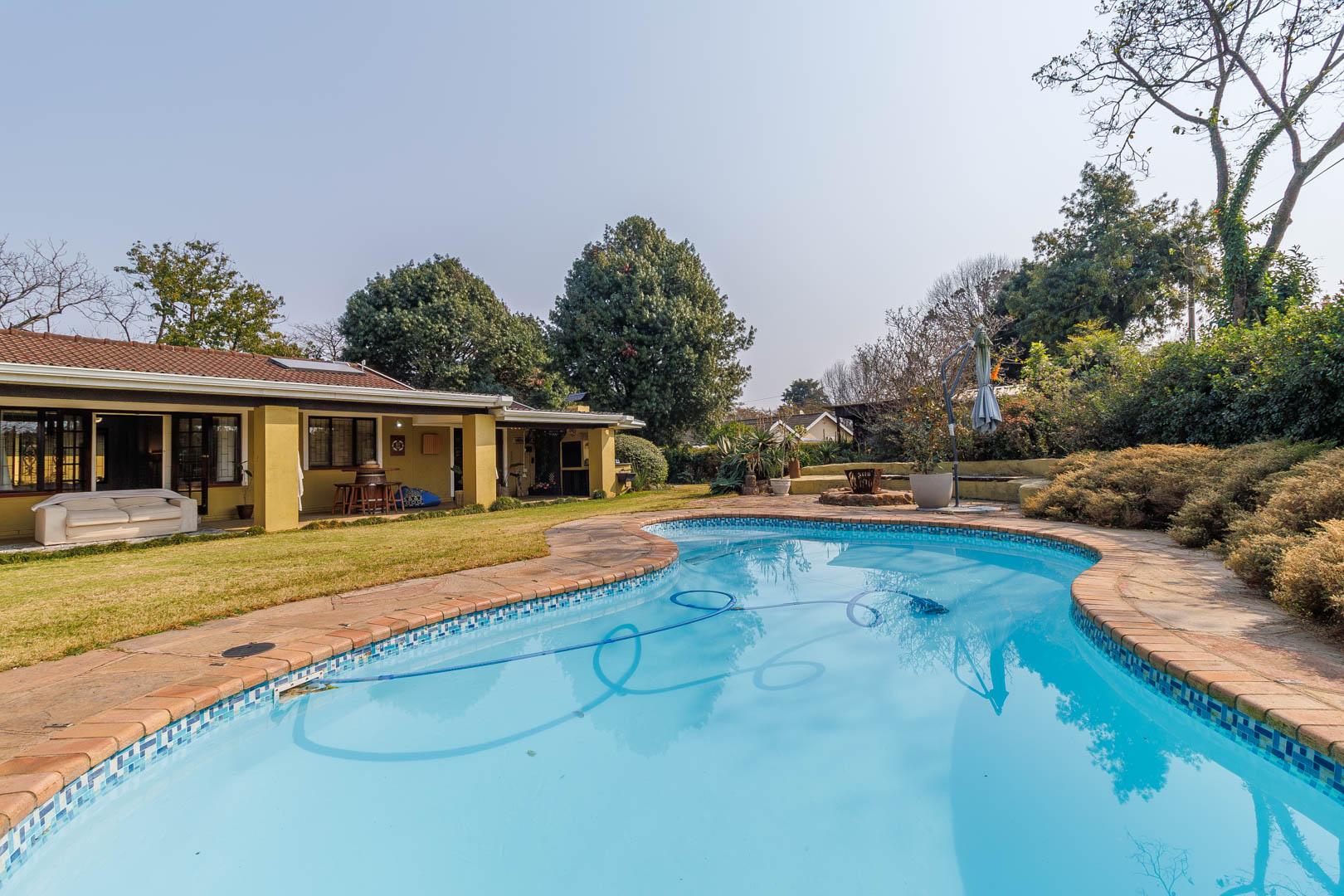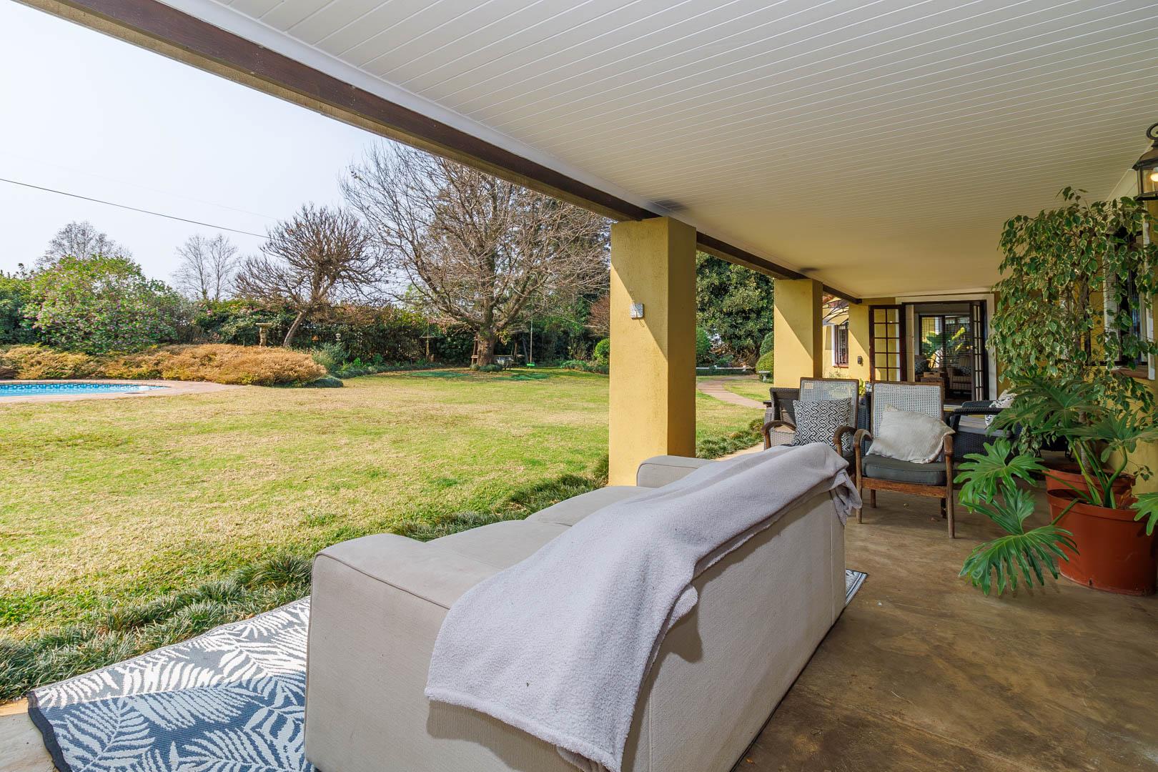 Step outside to find a generous, covered veranda with a built-in braai, overlooking a sparkling pool and beautifully manicured garden—a perfect setting for outdoor entertaining. The property is also equipped with innovative water-saving features, including a greywater system and solar technology, ensuring significant monthly savings.