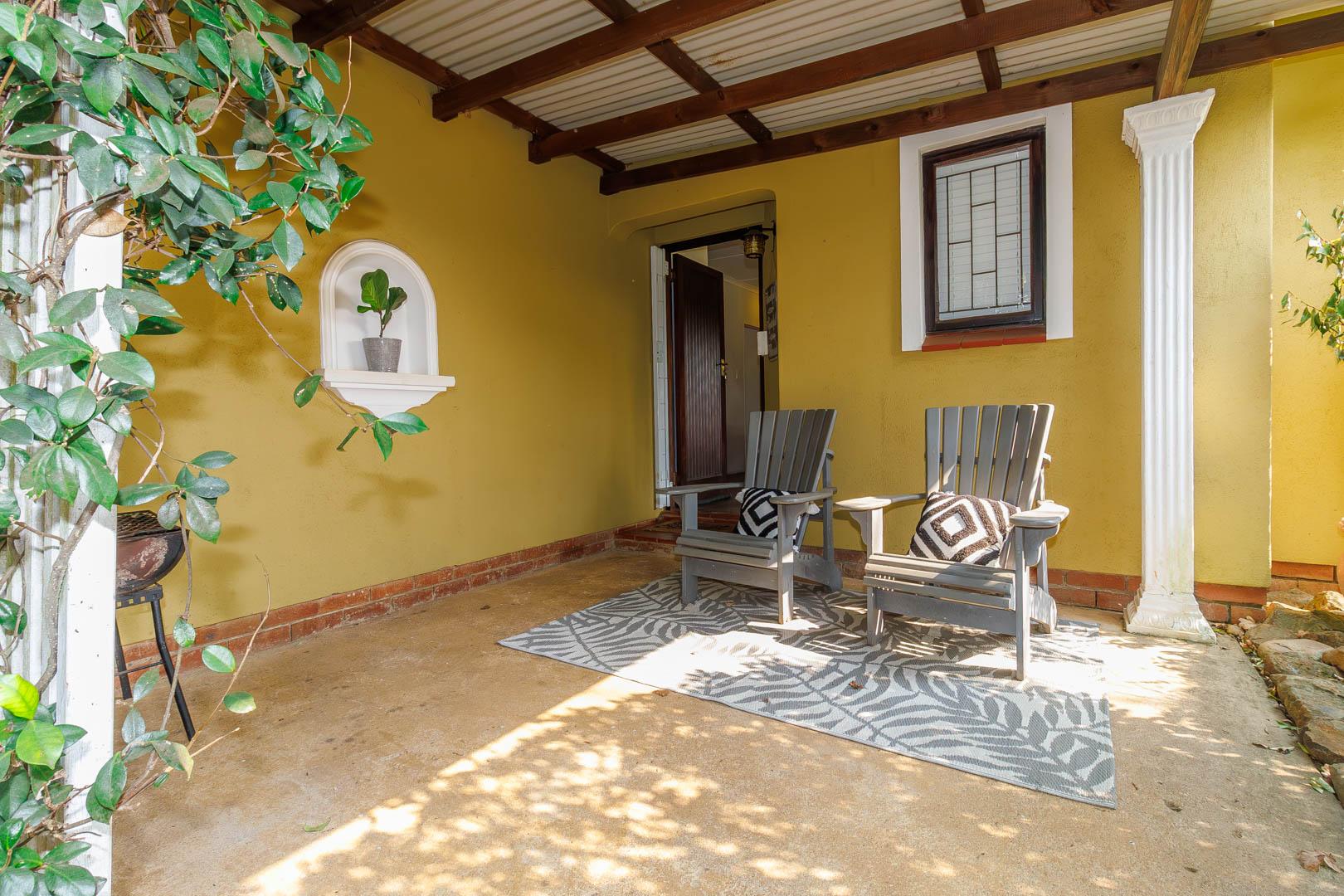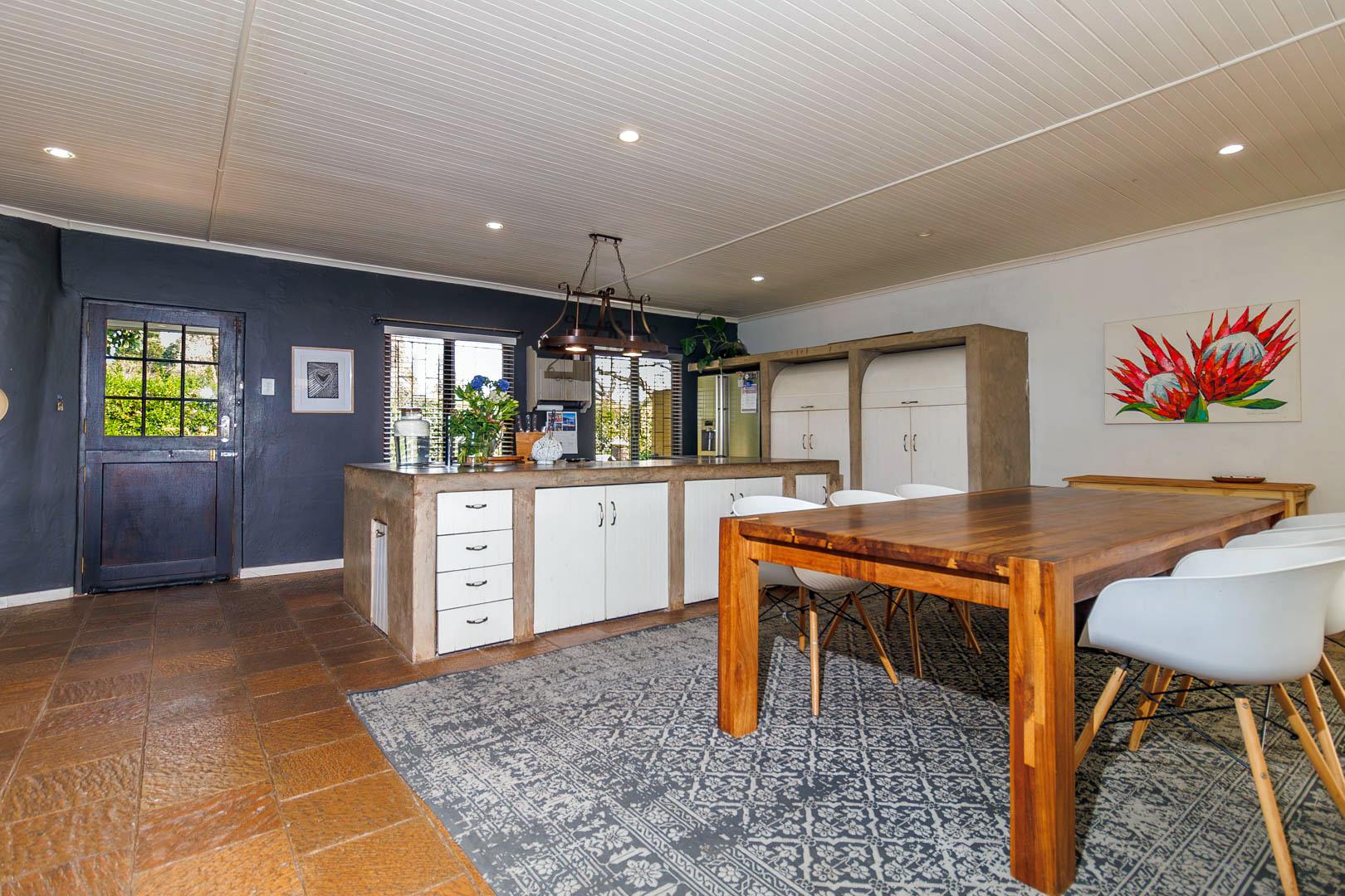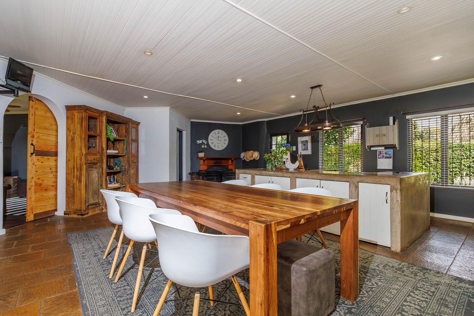 Step outside to find a generous, covered veranda with a built-in braai, overlooking a sparkling pool and beautifully manicured garden—a perfect setting for outdoor entertaining. The property is also equipped with innovative water-saving features, including a greywater system and solar technology, ensuring significant monthly savings.