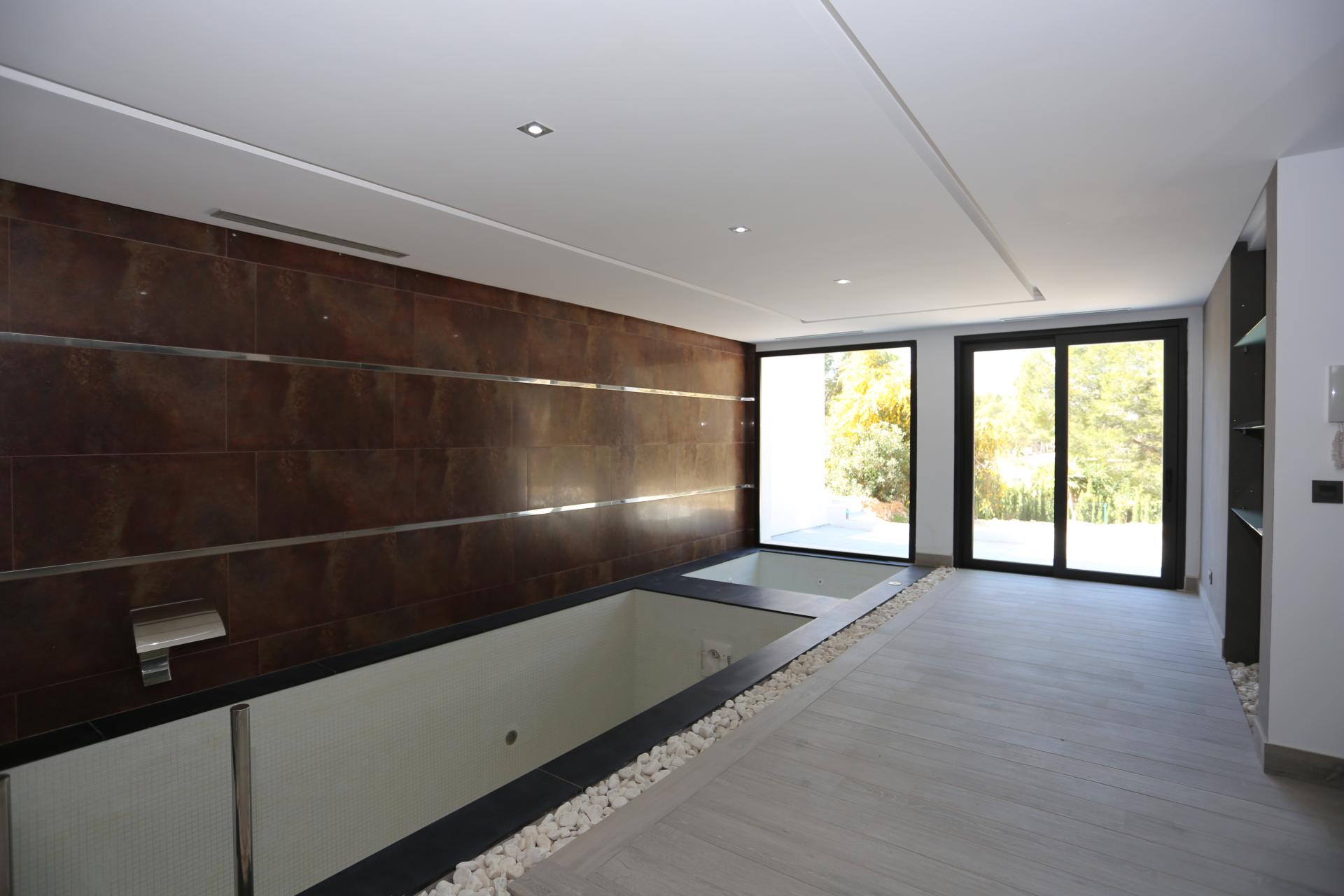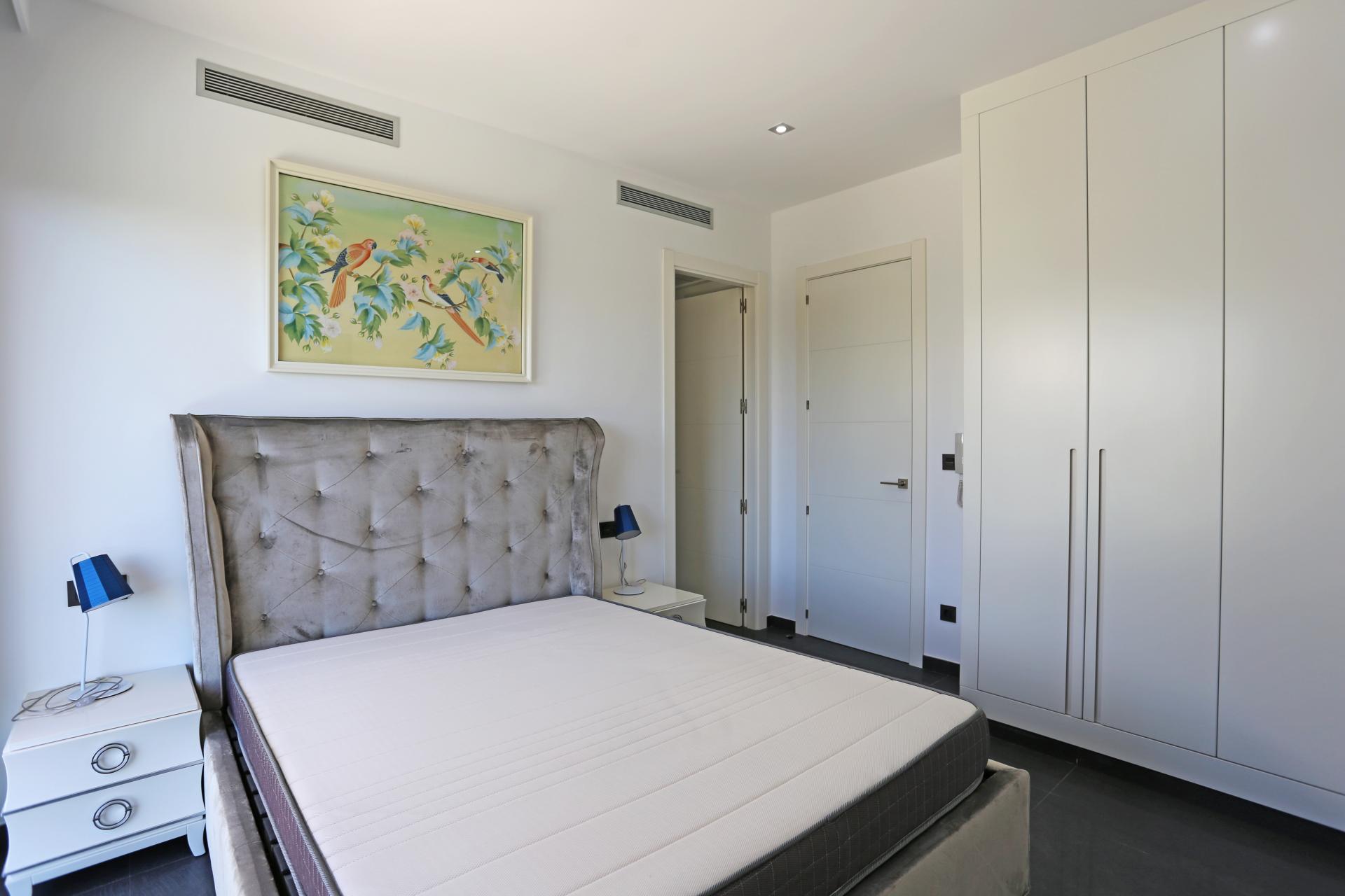On the upper floor, there are three bedrooms, each with its own en-suite bathroom, a large walk-in closet, and a storage room. The master bedroom has a private terrace. All floors are connected by an elevator. The villa has top-quality finishes like the brand PORCELANOSA, it has underfloor heating and integrated air conditioning with independent control in each room.