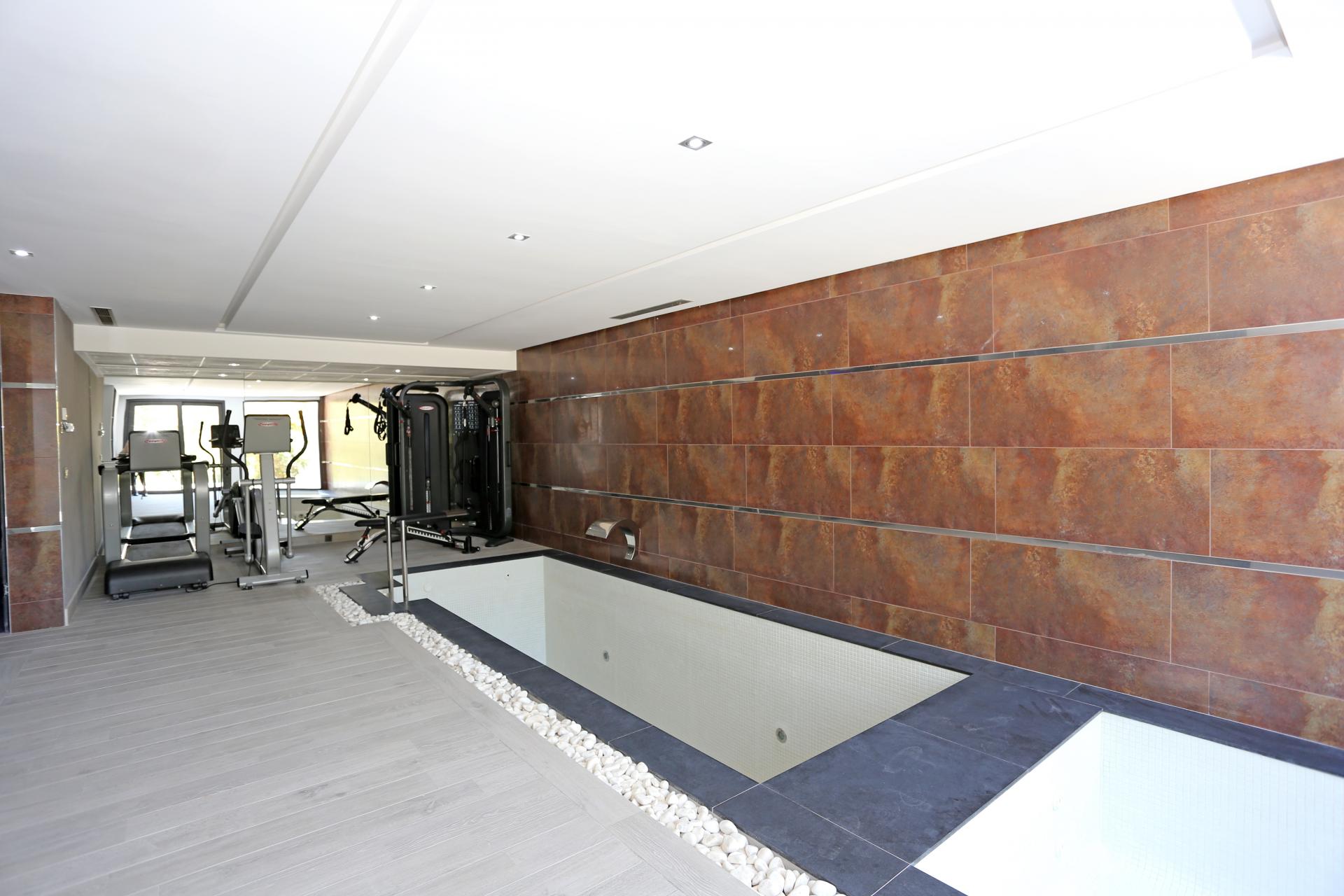 Externally the sun drenched 10m x 4m infinity pool enjoys at one end a built-in sunken seating area with bar top perfect to enjoy a refreshing chilled drink whilst cooling off in the water plus at the other end an integrated heated Jacuzzi. Internally there is an elevator for ease of transport and for all year round well being there is an indoor spa area with heated pool & Jacuzzi, a gym area and a hamman and sauna.