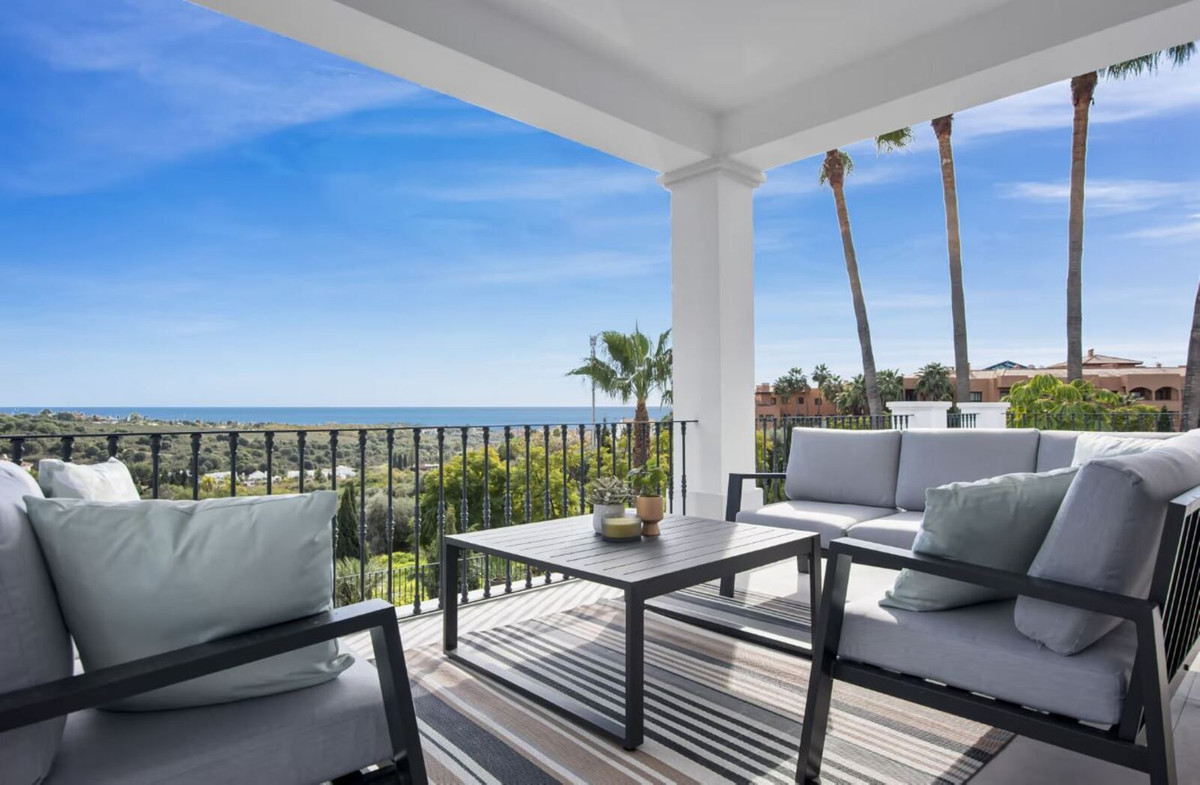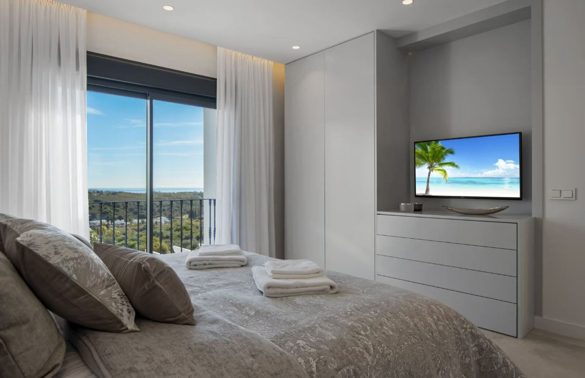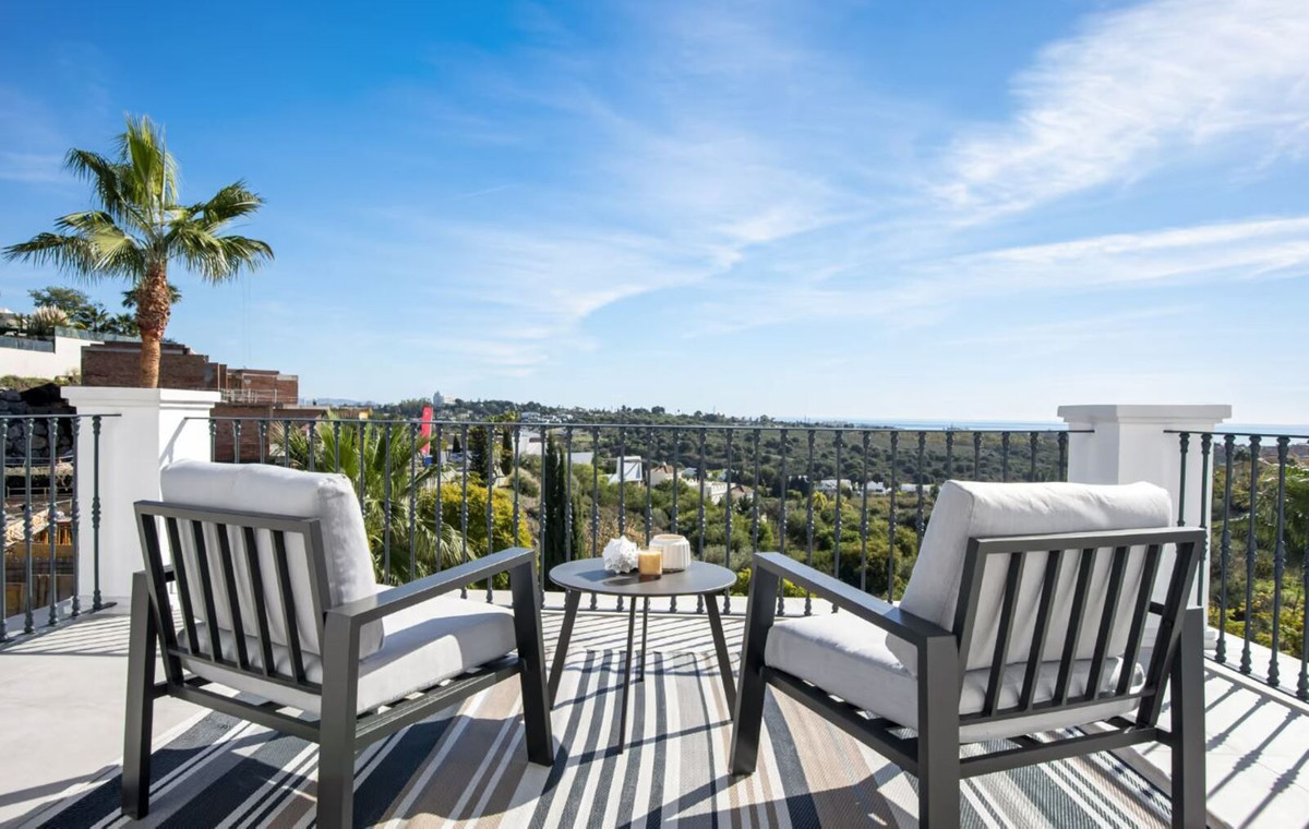 Fully renovated Los Flamingos villa featuring panoramic sea views, infinity pool, five en-suite bedrooms, cinema and games rooms, spacious terraces, modern interiors by Marbella Interiors, and a prime location near Malaga Airport, Puerto Banús, and Costa del Sol beaches.