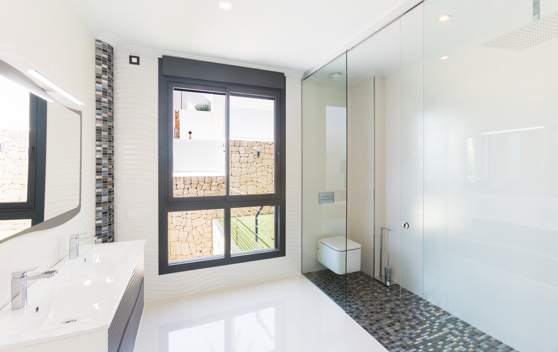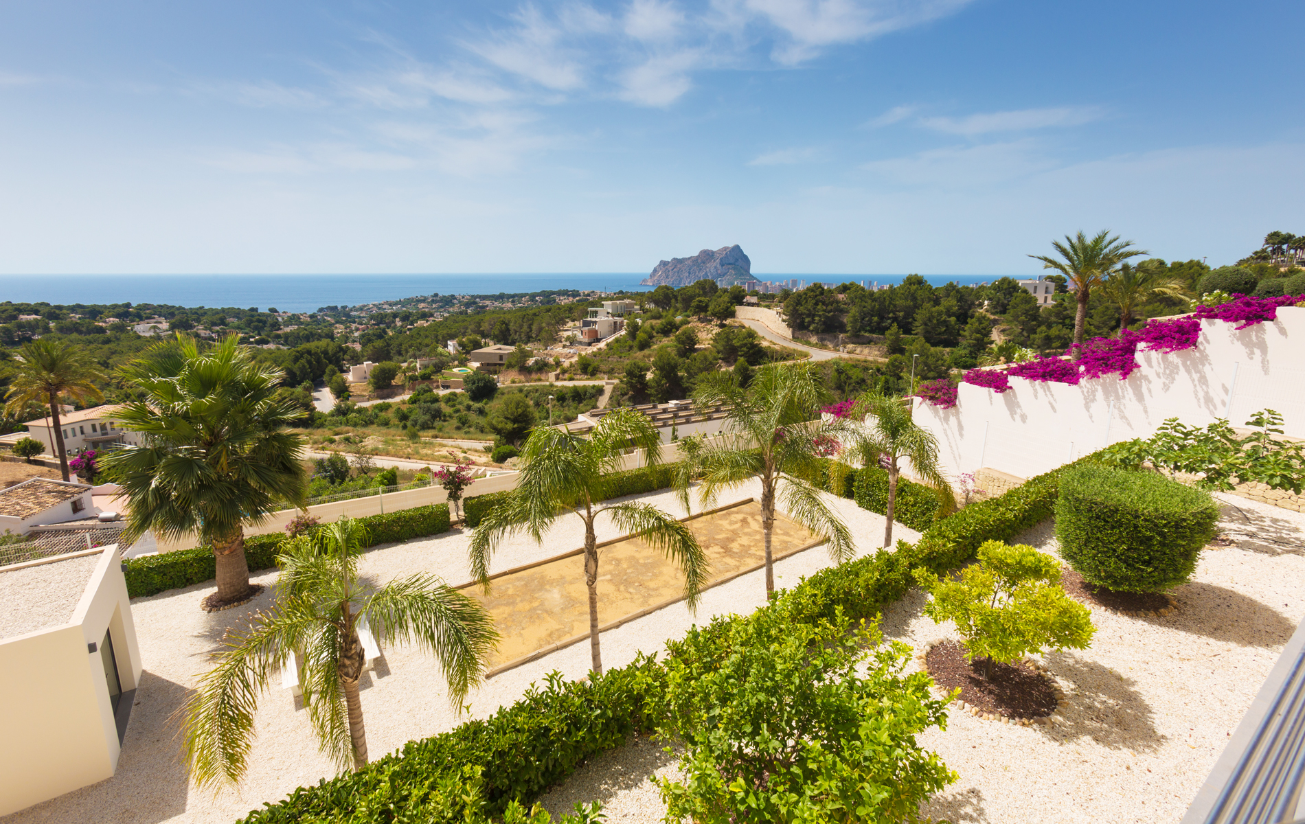 Externally large outdoor areas on different levels that includes the infinity pool, sunken chillout lounge, a bioclimatic pergola with a large table for 12 people for alfresco dining, a ZEN area with water feature and on the land in front of the villa there is a large space with a petanque court that can be transformed into a paddle court.