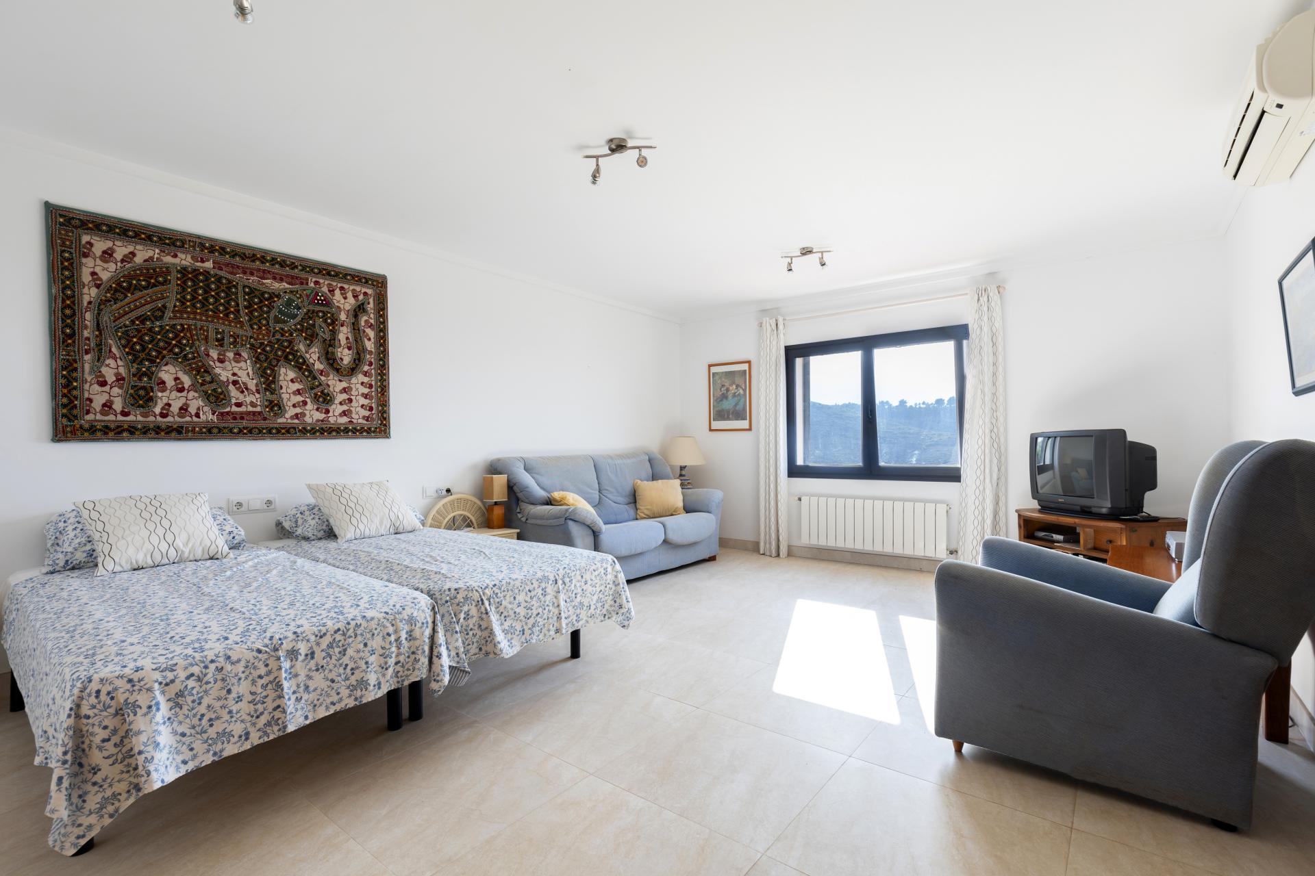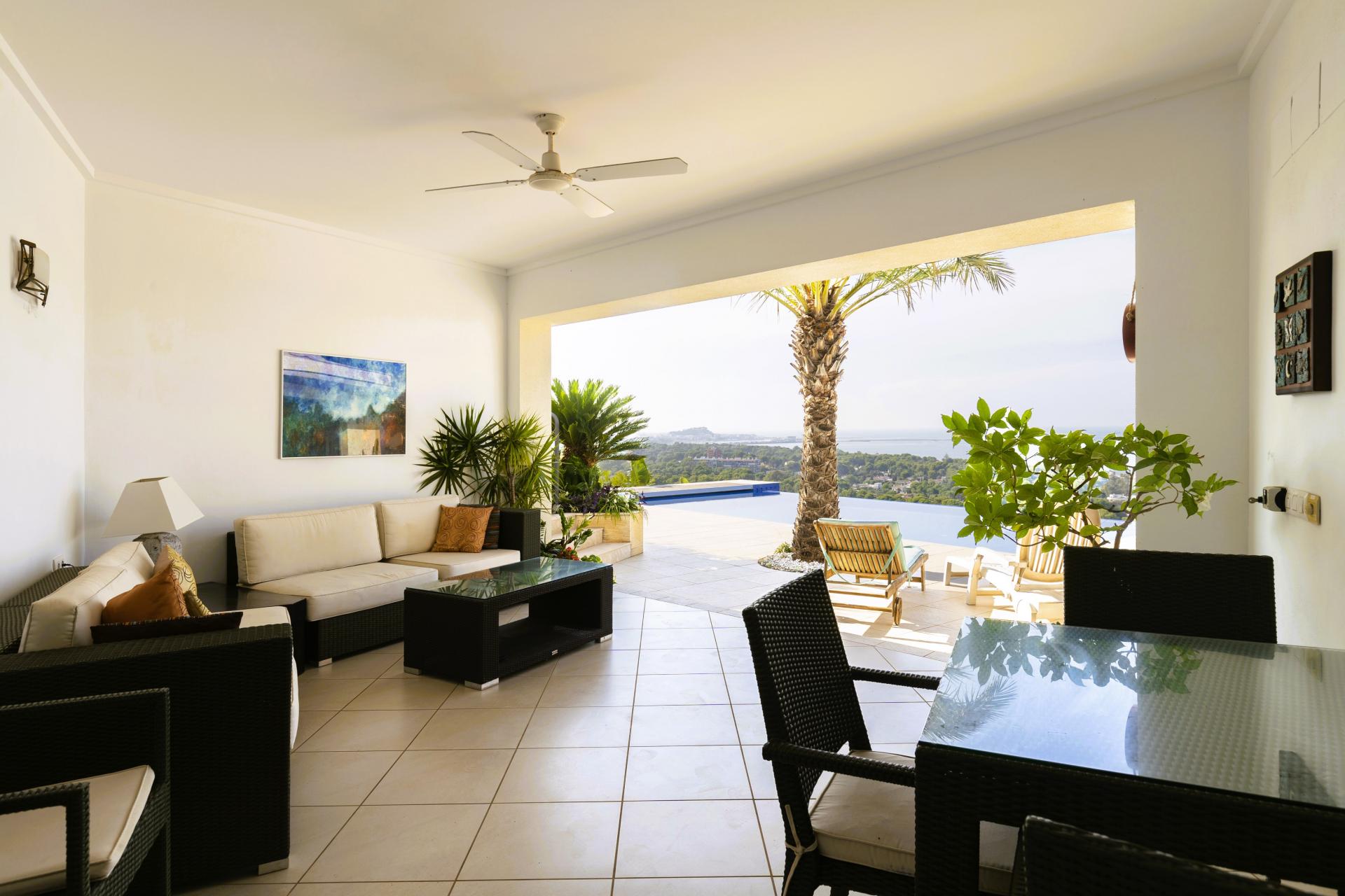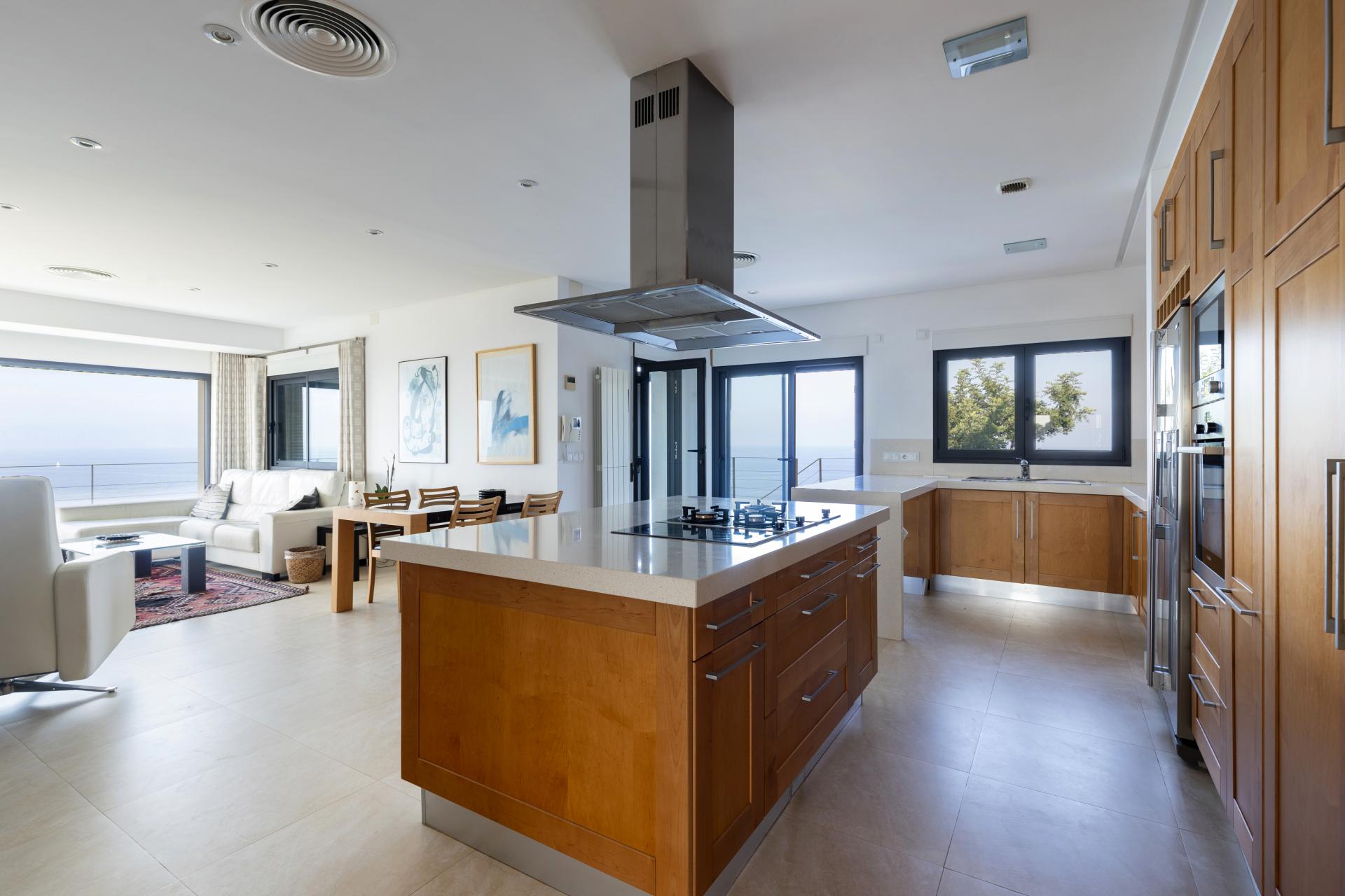 Lastly, the ground floor presents two living rooms, a fully equipped kitchen, and a complete bathroom with a shower. One living room is an open fronted summer chillout/relax lounge leading to the pool and terracing and from which to enjoy the sea views, the second lounge with folding glass doors to also allow for indoor/outdoor consists of a lounge, dining area and kitchen, areas created to enjoy a spectacular Mediterranean lifestyle where the glittering infinity pool is the main focal point and from which to enjoy the panoramic views as they stretch along the coast to Denia castle and beyond and with the backdrop of the Montgó mountain.