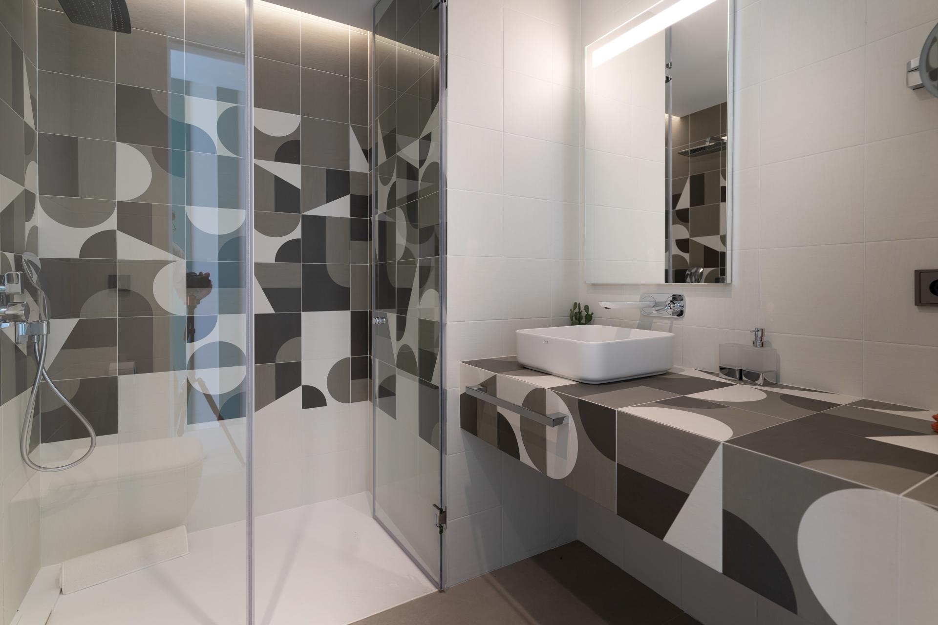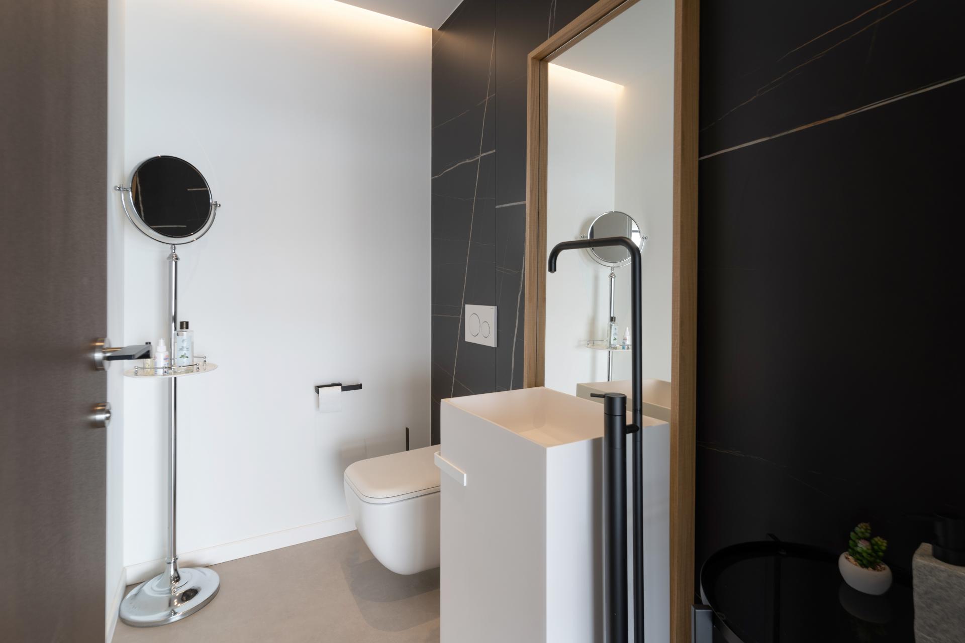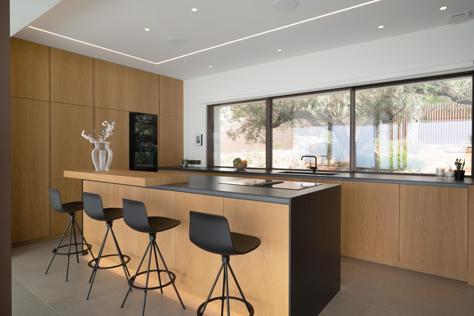 Upon entering, you will be captivated by the abundant space and natural light flooding the ground floor through floor-to-ceiling windows. These state-of-the-art windows, controlled by an advanced home automation system, bathe the interior in natural light, creating a bright and inviting atmosphere throughout the day. The spacious living-dining area, featuring a glass wine cellar, is perfect for entertaining and social gatherings. The modern, fully equipped kitchen is a gourmet's dream come true.