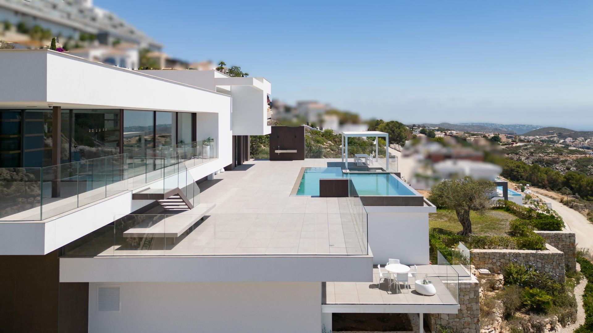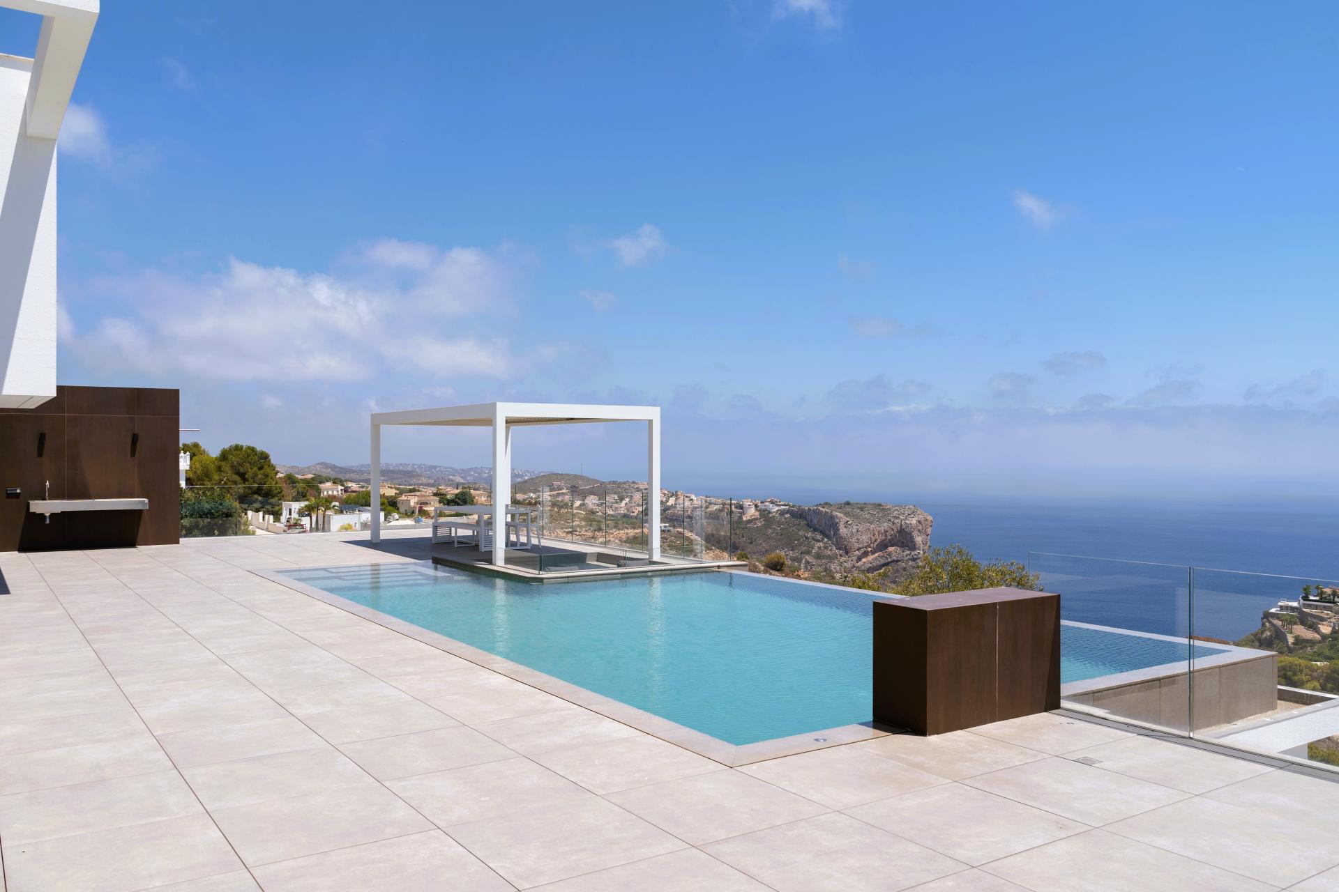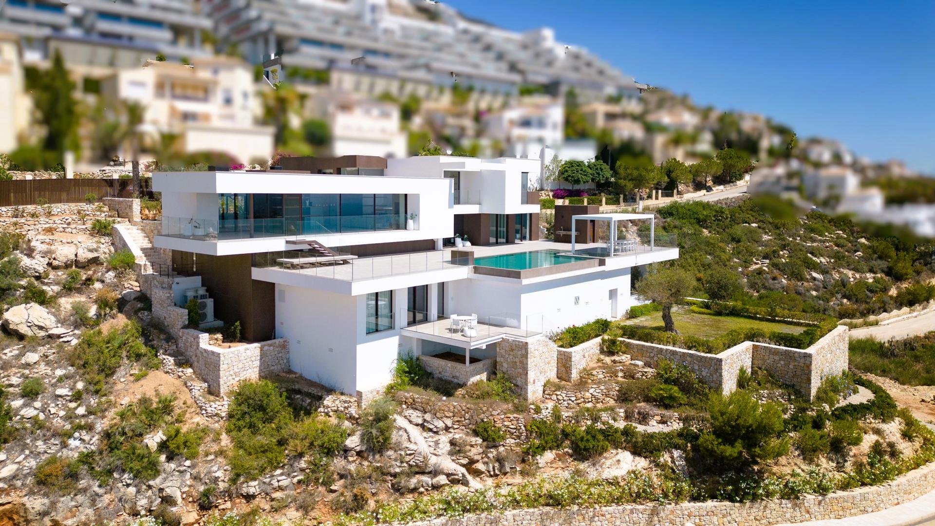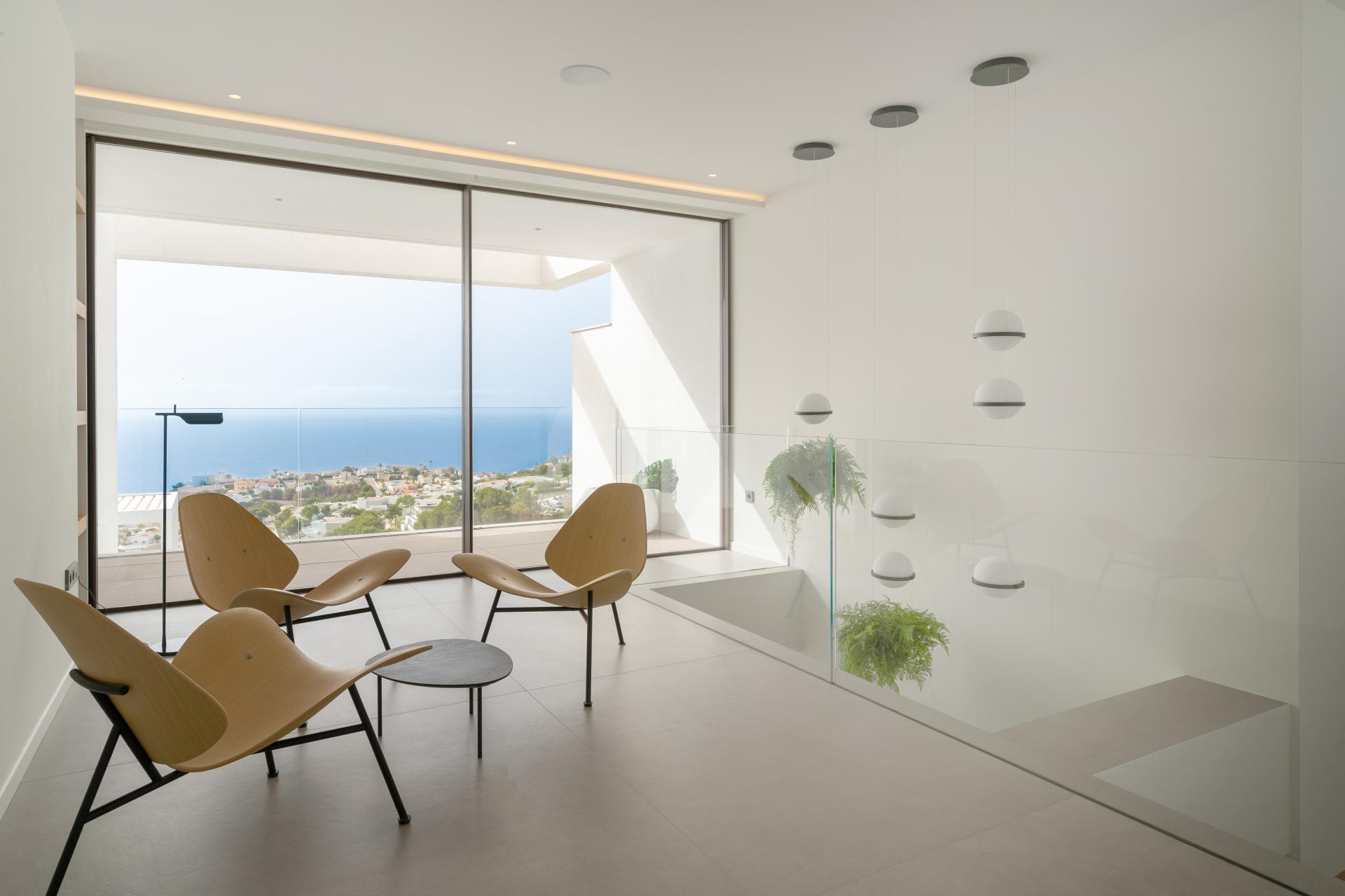 PROPERTY AT A GLANCE A unique south facing property located in an exclusive area of large luxury villas that elegantly overlook the Mediterranean Sea. A stunning modern property in the Spanish Mediterranean, on the Costa Blanca North, this property boasts a living area of 1085 m², five double bedrooms, and seven bathrooms, a luxurious spa area with heated indoor pool with a waterfall and hydromassage shower, a sauna for 4 people, and a fully equipped private cinema. If garaging and parking is a of the highest priority then this property has a double garage with a charging station for electric cars, a gigantic independent garage, accommodating up to ten vehicles converted from the adjacent villa has an impressive gym, accessible by an elevator and internal stairs above it.