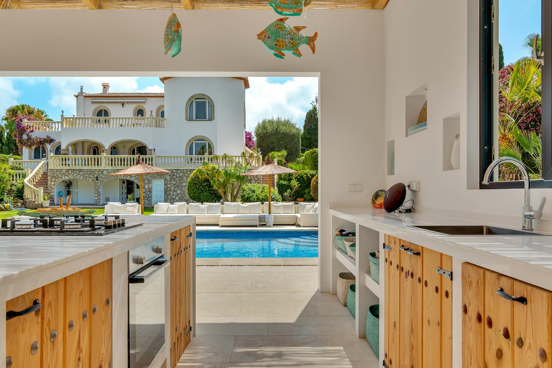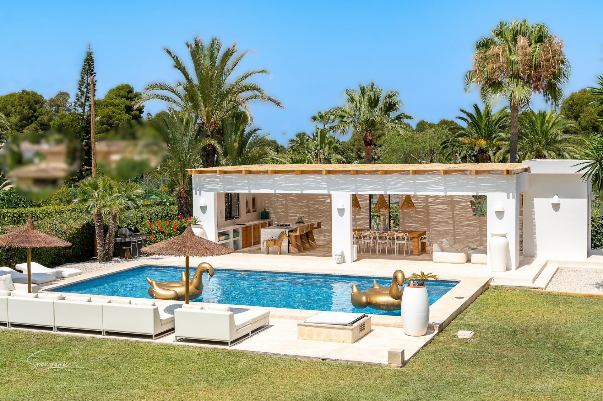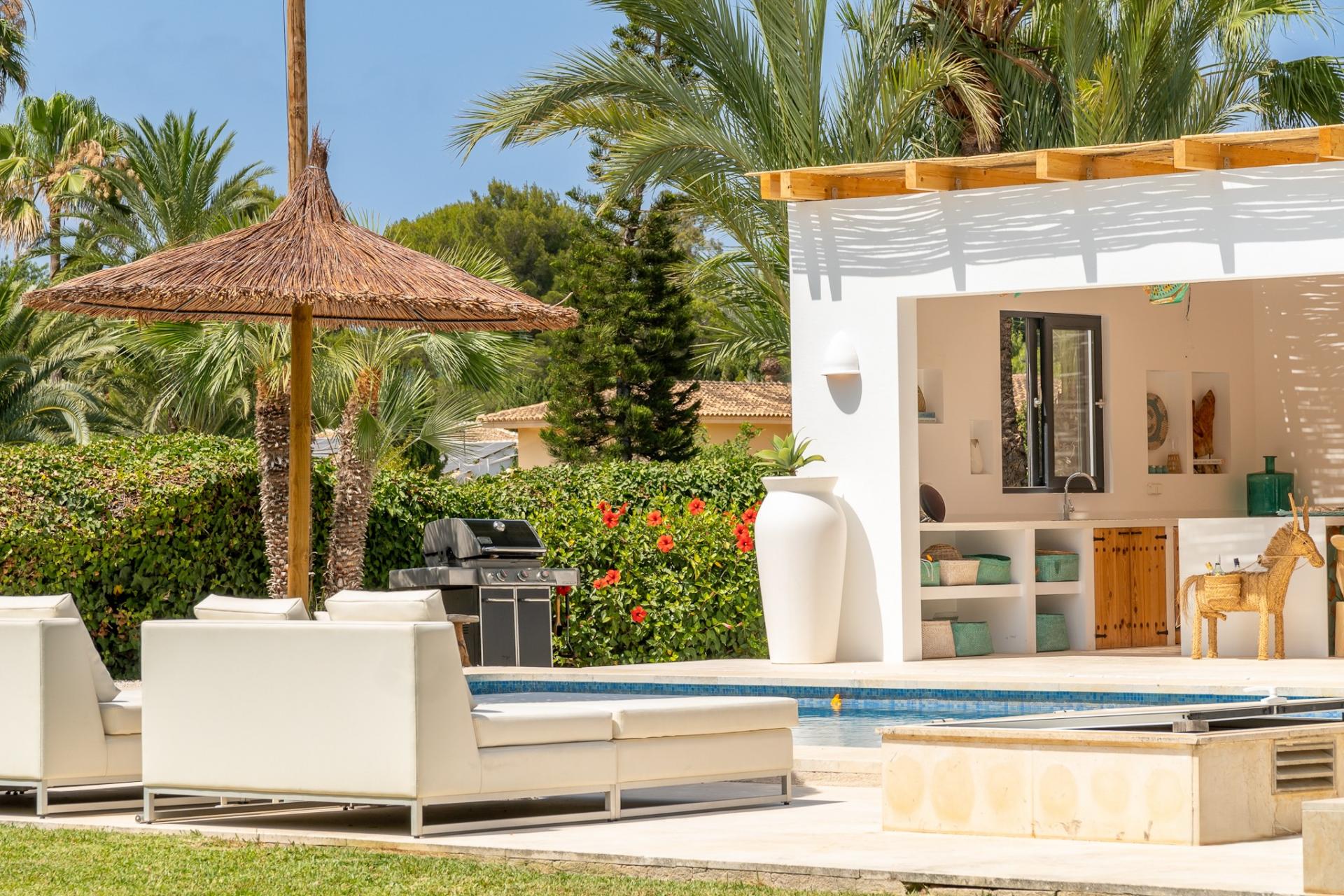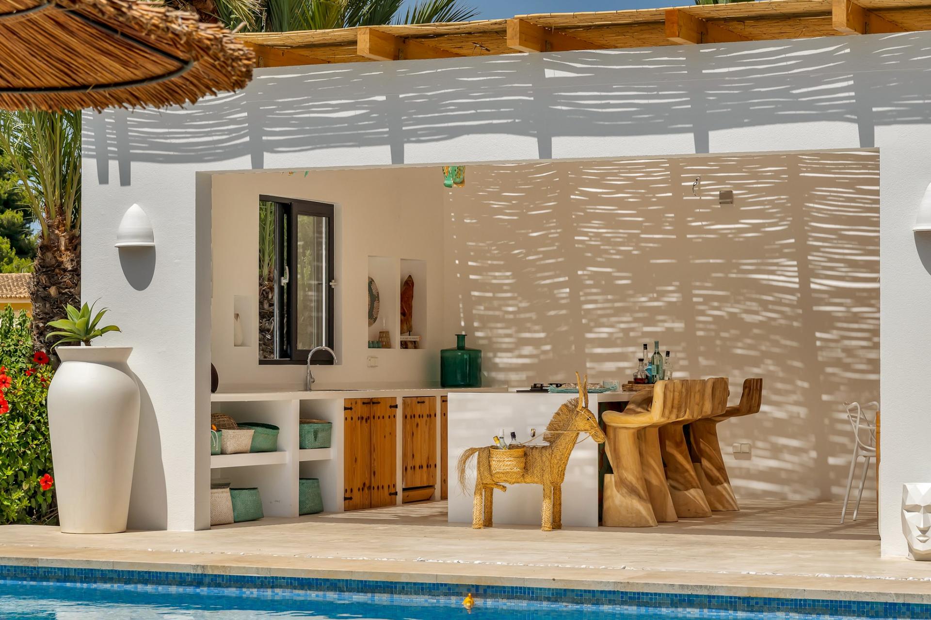 Resort-Style Outdoor Living The exterior of this villa has been meticulously redesigned to embrace the Mediterranean lifestyle. The beautifully maintained lush gardens provide privacy and a tranquil ambiance. At the heart of the outdoor oasis is a large swimming pool with easy-access steps, complemented by an expansive sun deck with sofas and loungers. A bespoke shaded pergola serves as an entertainment hub, featuring a fully equipped summer kitchen with a counter island, hob, bar seating, an adjacent dining area, and a chic chillout lounge with an overhead ceiling fan. Additional garden features include a BBQ area, an outdoor shower, a children’s play zone, and an external toilet.