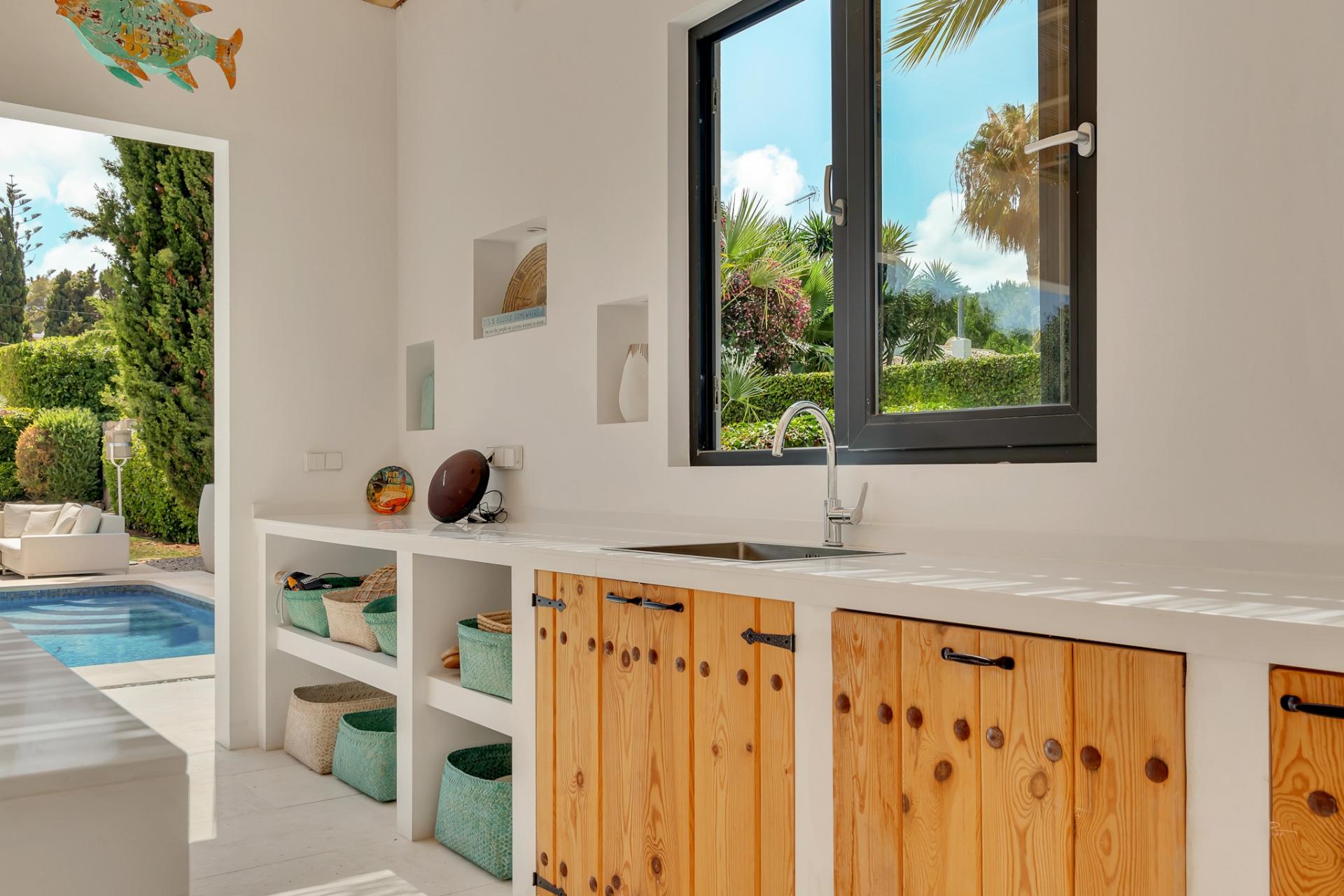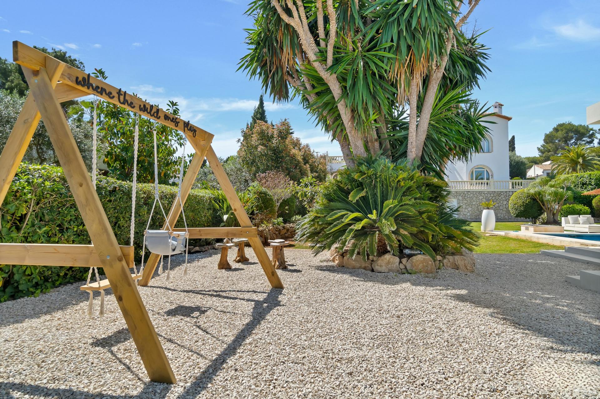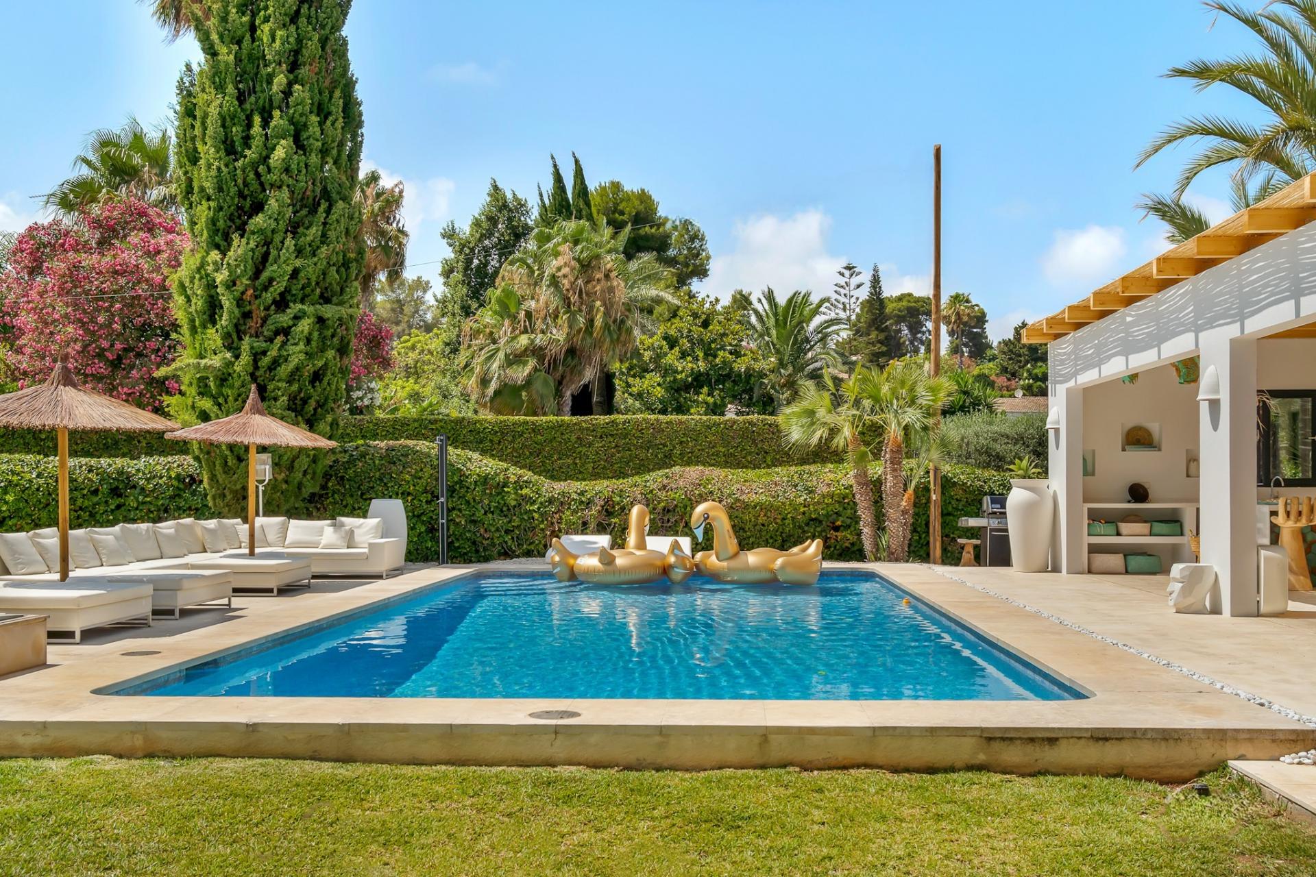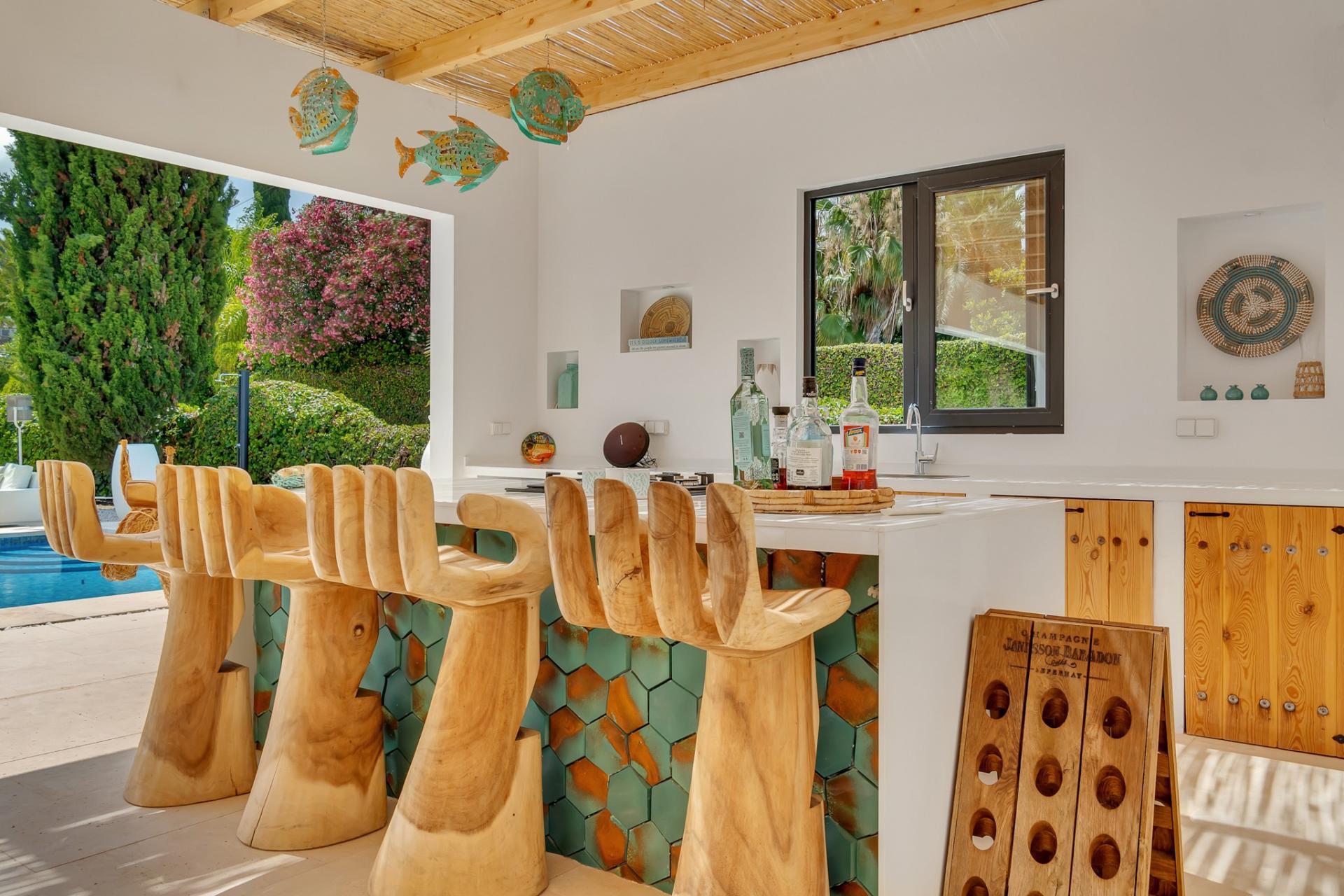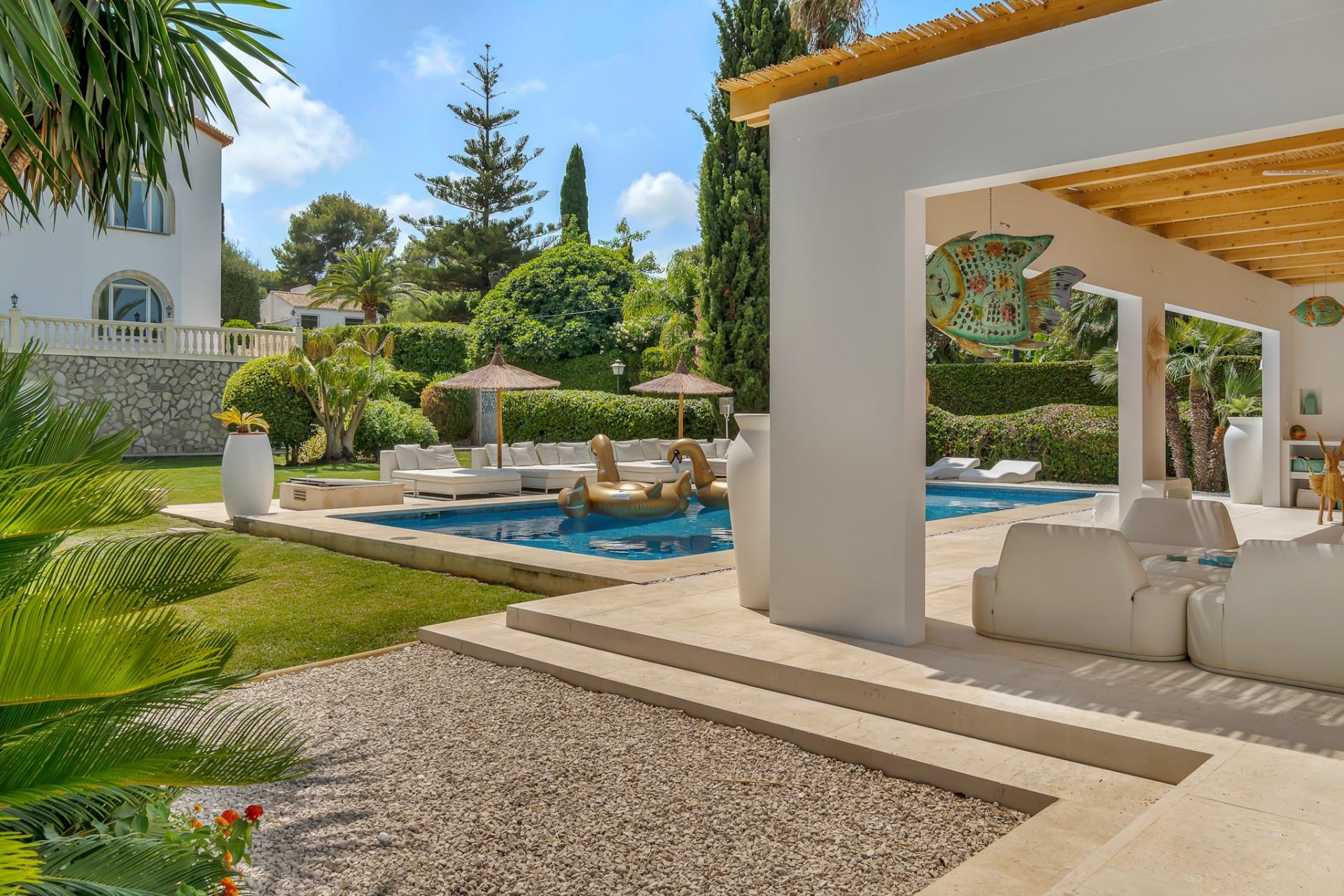 Resort-Style Outdoor Living The exterior of this villa has been meticulously redesigned to embrace the Mediterranean lifestyle. The beautifully maintained lush gardens provide privacy and a tranquil ambiance. At the heart of the outdoor oasis is a large swimming pool with easy-access steps, complemented by an expansive sun deck with sofas and loungers. A bespoke shaded pergola serves as an entertainment hub, featuring a fully equipped summer kitchen with a counter island, hob, bar seating, an adjacent dining area, and a chic chillout lounge with an overhead ceiling fan. Additional garden features include a BBQ area, an outdoor shower, a children’s play zone, and an external toilet.