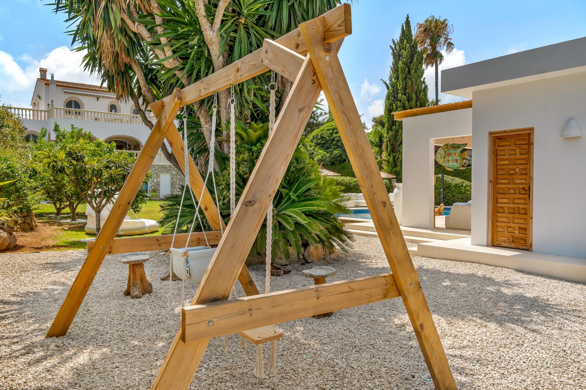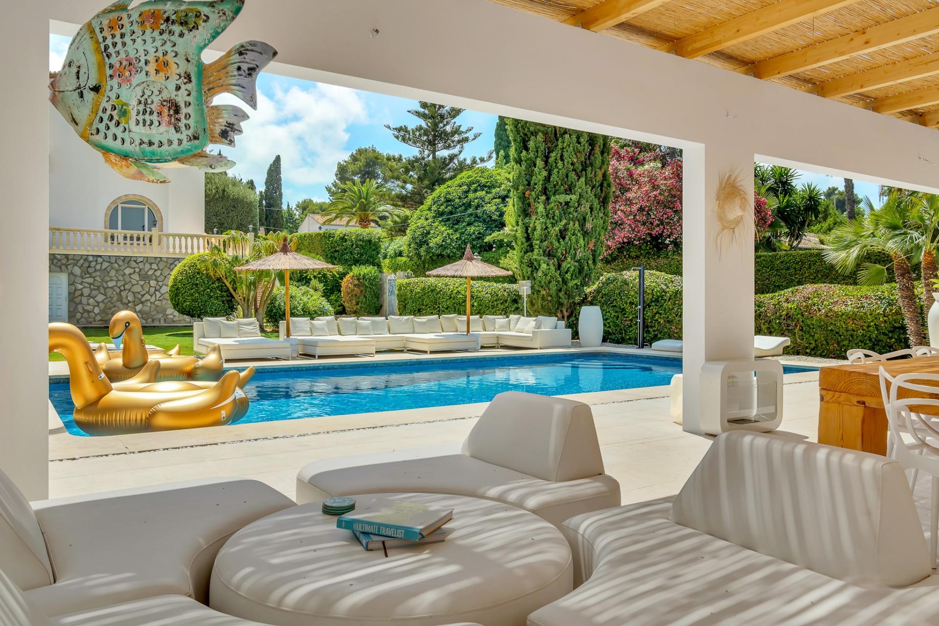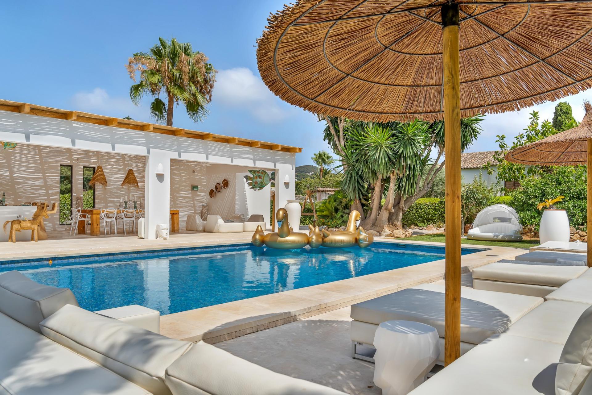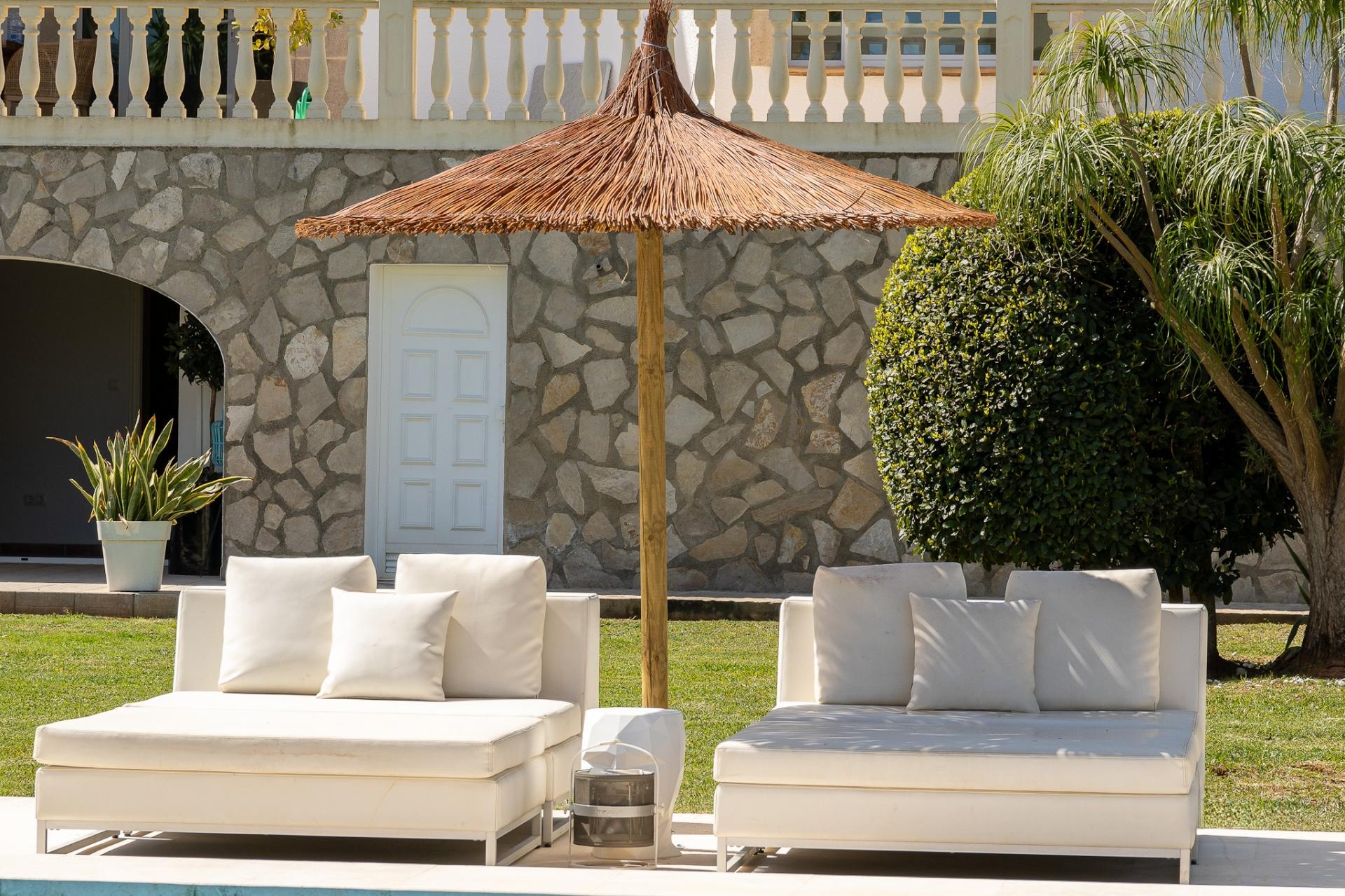 Resort-Style Outdoor Living The exterior of this villa has been meticulously redesigned to embrace the Mediterranean lifestyle. The beautifully maintained lush gardens provide privacy and a tranquil ambiance. At the heart of the outdoor oasis is a large swimming pool with easy-access steps, complemented by an expansive sun deck with sofas and loungers. A bespoke shaded pergola serves as an entertainment hub, featuring a fully equipped summer kitchen with a counter island, hob, bar seating, an adjacent dining area, and a chic chillout lounge with an overhead ceiling fan. Additional garden features include a BBQ area, an outdoor shower, a children’s play zone, and an external toilet.