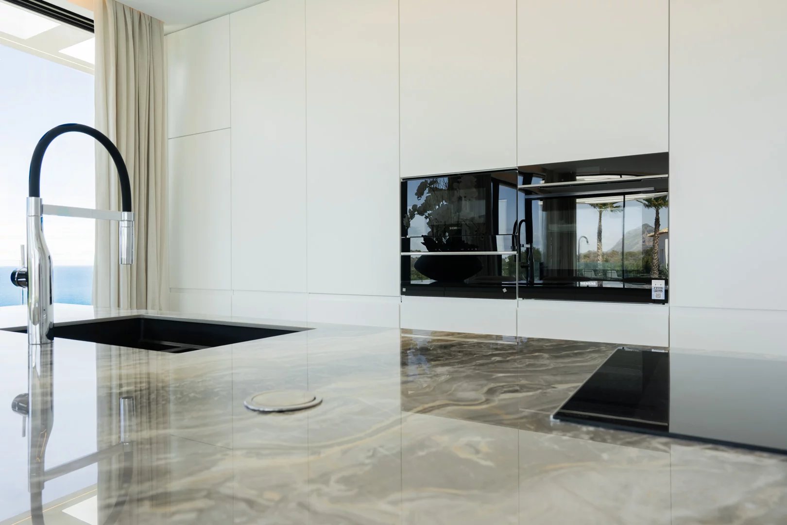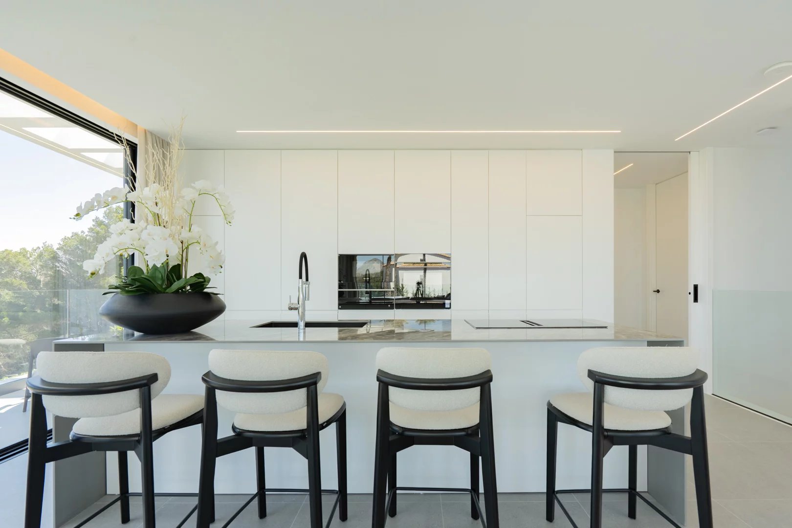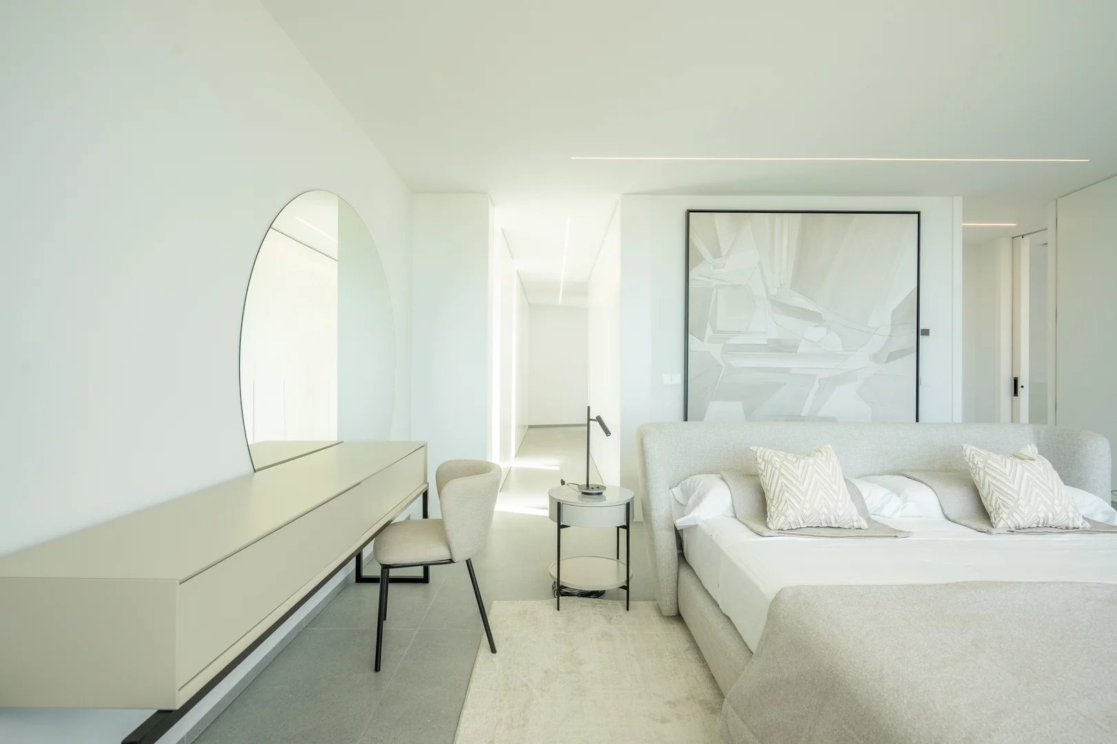 Interior Layout Across 420m² of internal space, the villa offers generous proportions and sophisticated finishes. The main living level comprises a vast, open-plan living and dining area with floor-to-ceiling windows framing panoramic sea views. The sleek, fully equipped designer kitchen features integrated appliances and a marble-accented island. The primary suite offers a serene retreat with a private dressing room and luxurious ensuite, while three further bedrooms – all ensuite and with their own dressing areas – are located on the lower level. A dedicated home office with an adjacent bathroom provides flexibility as a fifth bedroom.