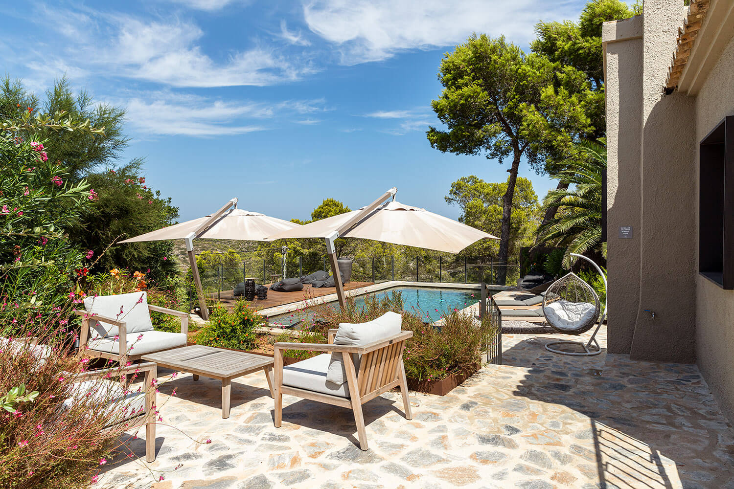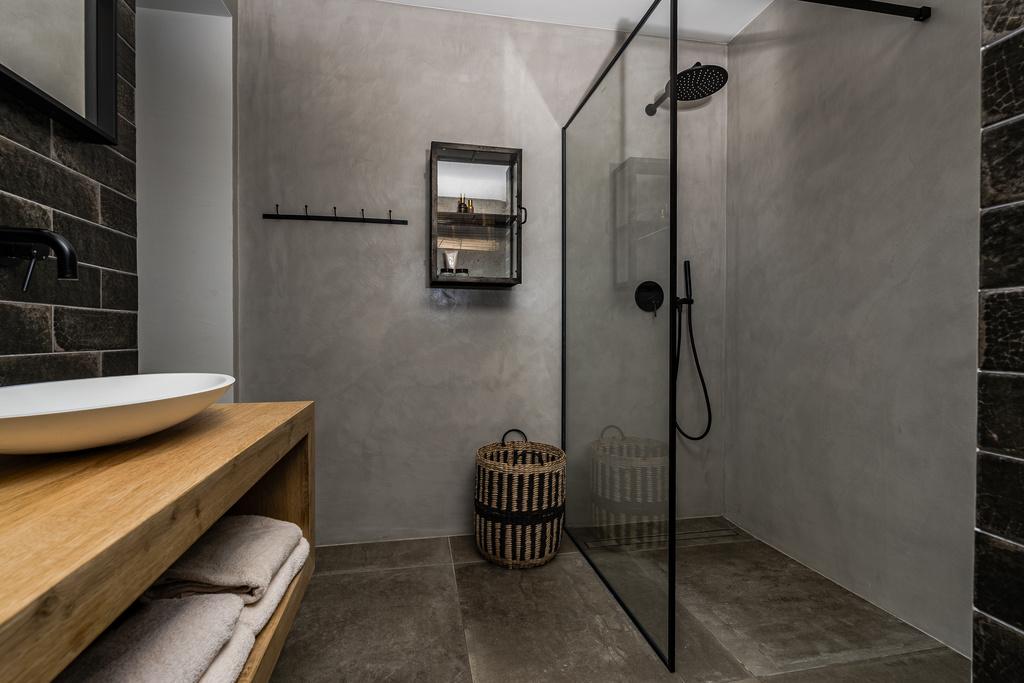 Outdoor Living The exterior spaces are equally impressive, centring around a spectacular 10 x 5m heated saltwater pool with a floating teak deck—a signature feature that sets this property apart. Multiple lounging zones, shaded terraces, and an alfresco dining area with BBQ provide year-round enjoyment. An outdoor shower designed by celebrated local artist Toni Mari is both functional and sculptural, adding a unique, artisanal touch. Whether it’s morning yoga, sunset cocktails, or lazy summer afternoons by the water, the villa’s terraces are designed to frame every moment.
