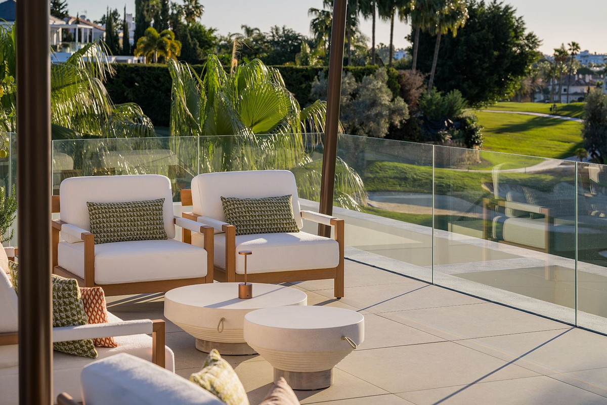 Exceptional frontline golf villa in Nueva Andalucía - one of the best quality villas we are yet tho see - featuring four en-suite bedrooms, rooftop spa and cinema, open-plan living, enormous private terraces, and direct access to the world famous Los Naranjos Golf course. Including a gymnasium, home office, fabulous outdoor kitchen, and panoramic views over Los Naranjos golf course and the golf valley.