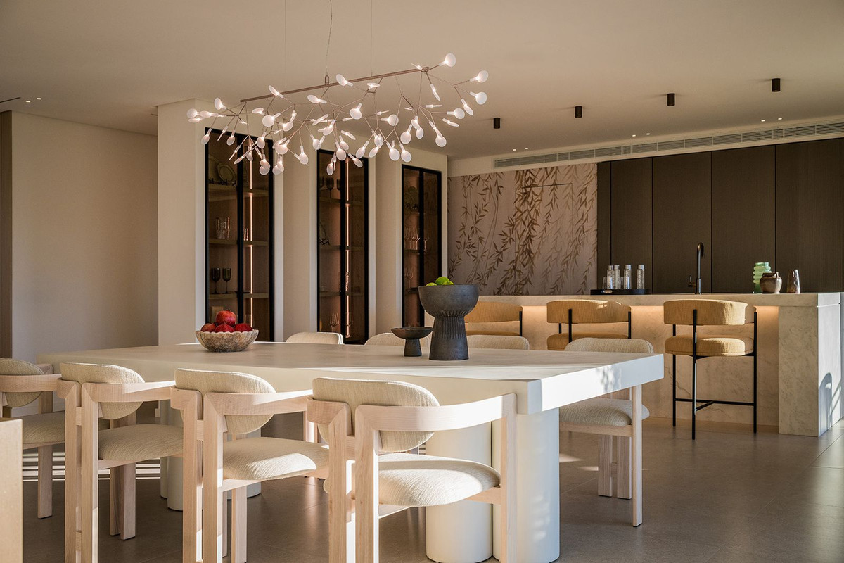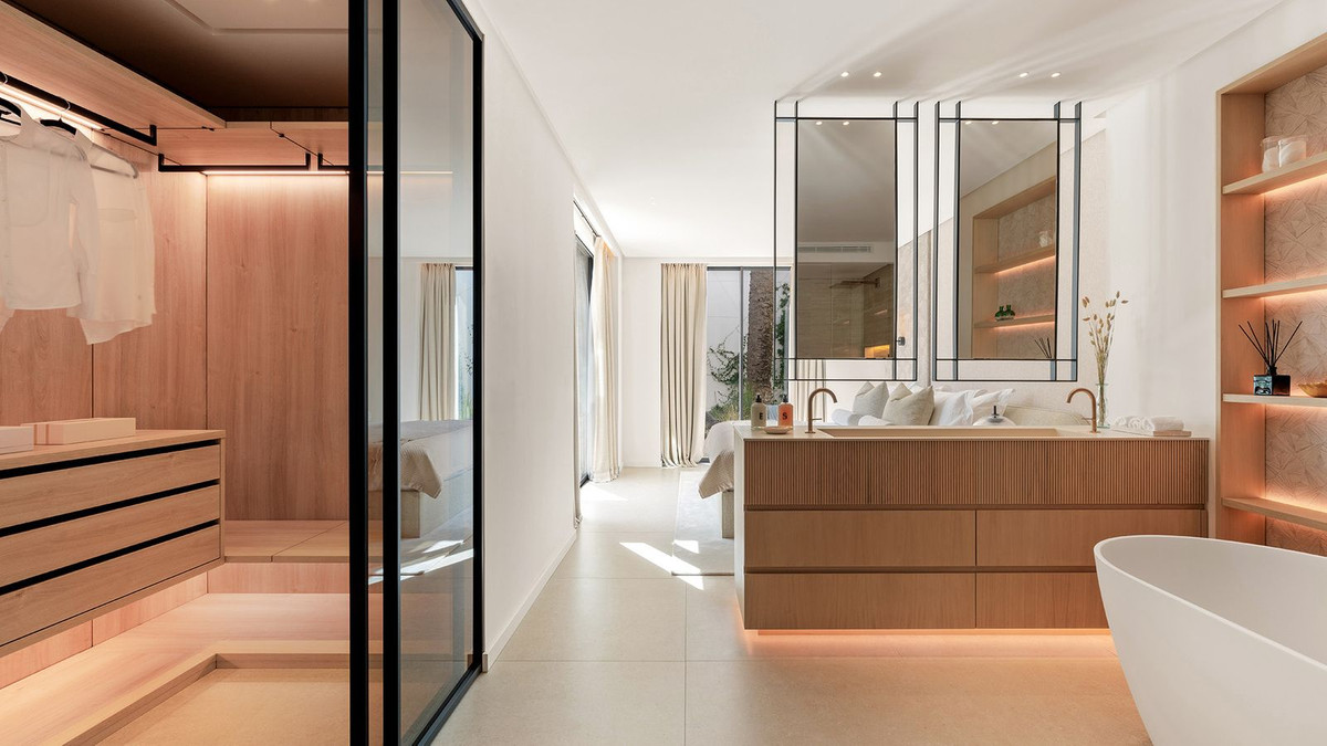 Upon entering, a sleek living space merges with an open-plan kitchen, offering captivating views of the renowned Los Naranjos golf course through floor-to-ceiling glass doors. This modern haven comprises four bedrooms, each with an en-suite bathroom and private terrace. The master bedroom boasts a spacious walk-in closet and an open-plan designer bathroom.