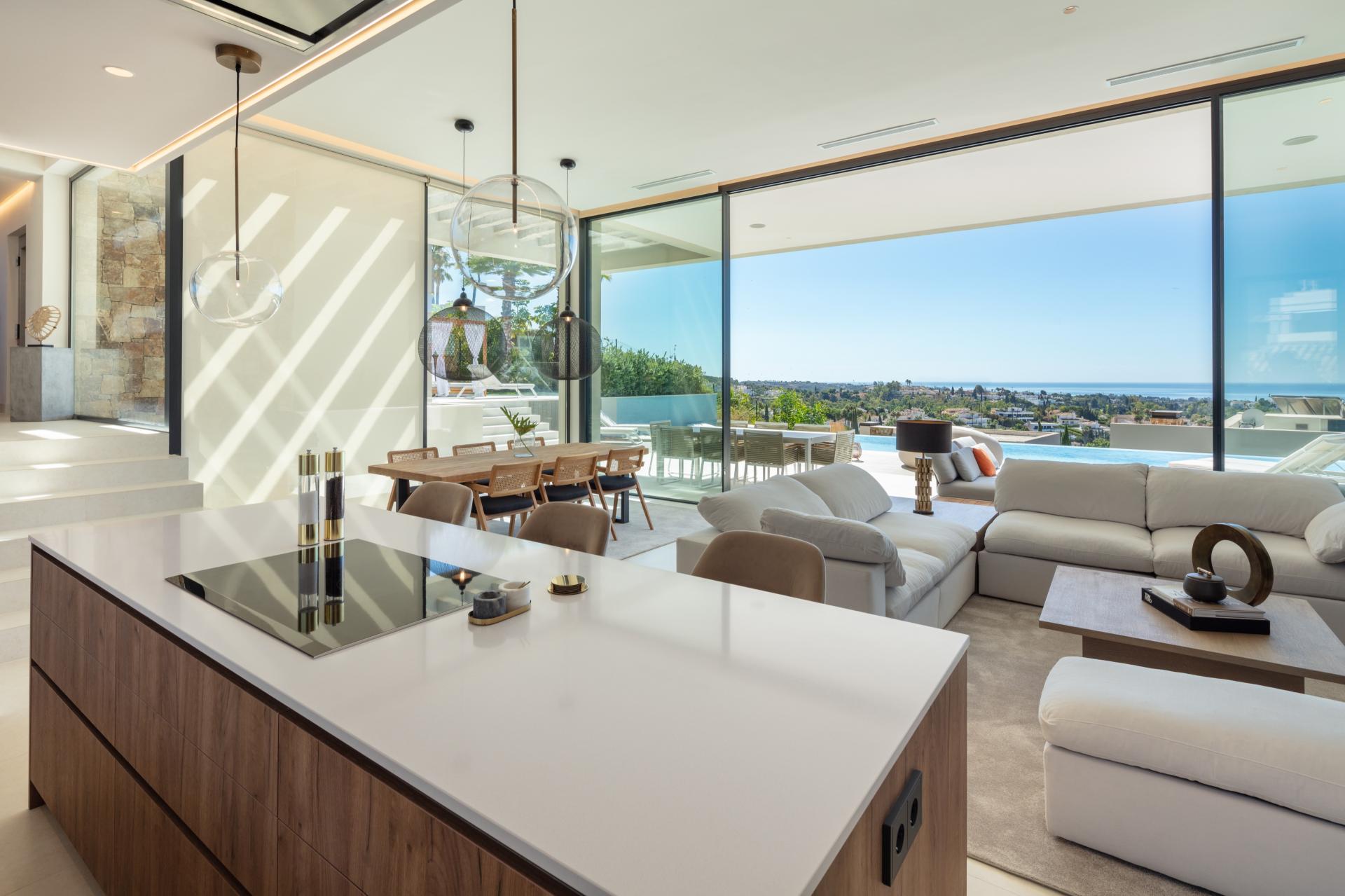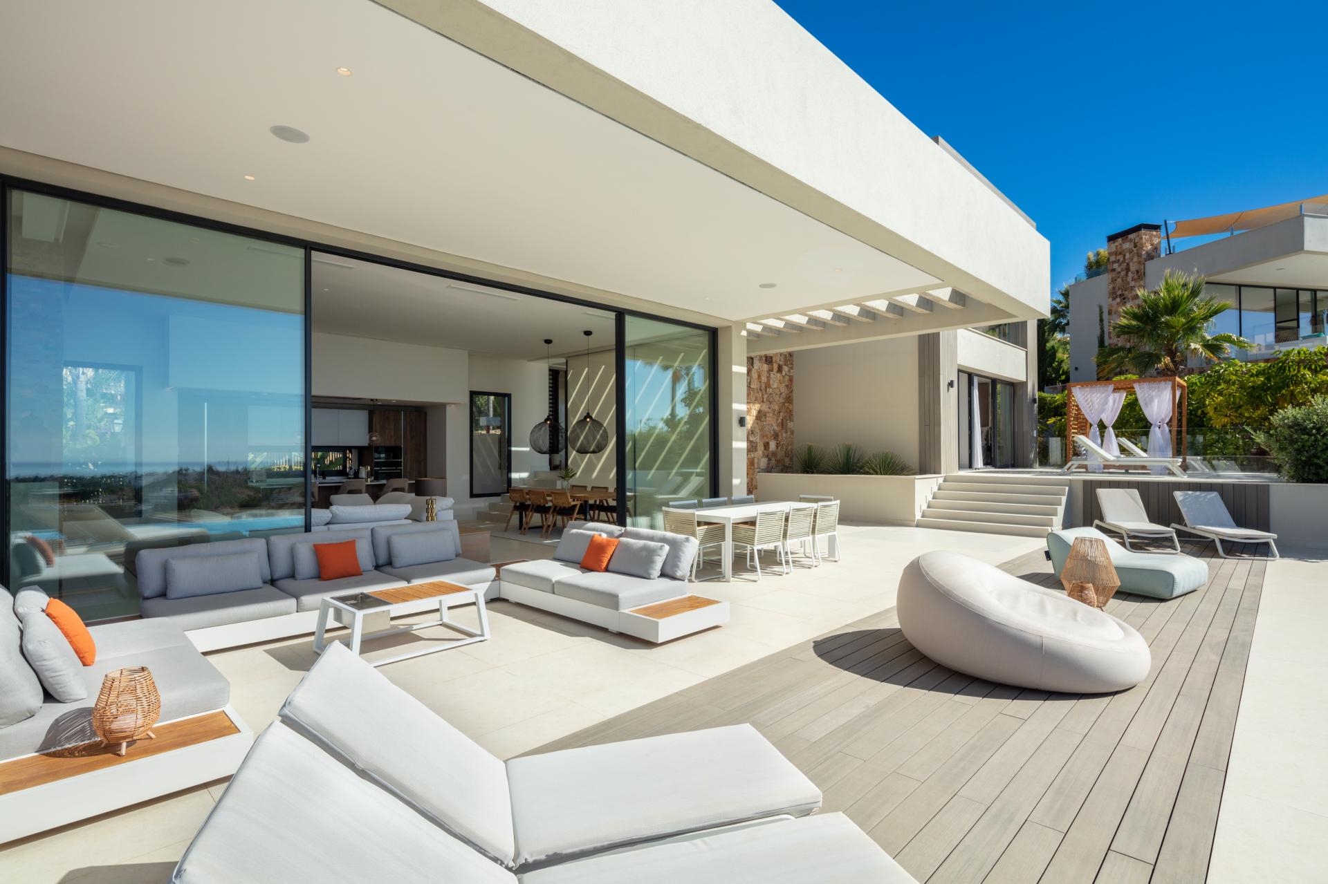 This exceptional 5 bedroomed, 5 bathroom villa offers modern elegance with a unique blend of nature-inspired architecture and high-end finishes. Nestled on a generous 1274 m² plot with a remarkable 592 m² of living space, this property is designed to optimise comfort and sophistication, all while offering captivating views of the Mediterranean Sea and La Concha mountain.