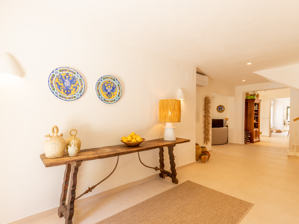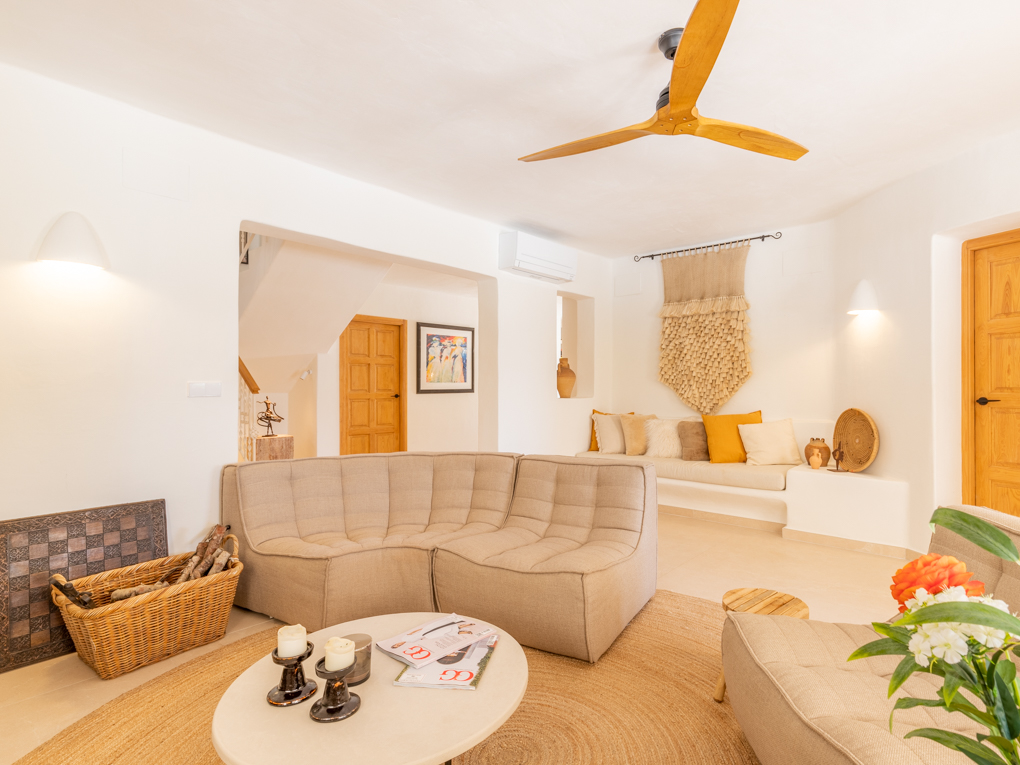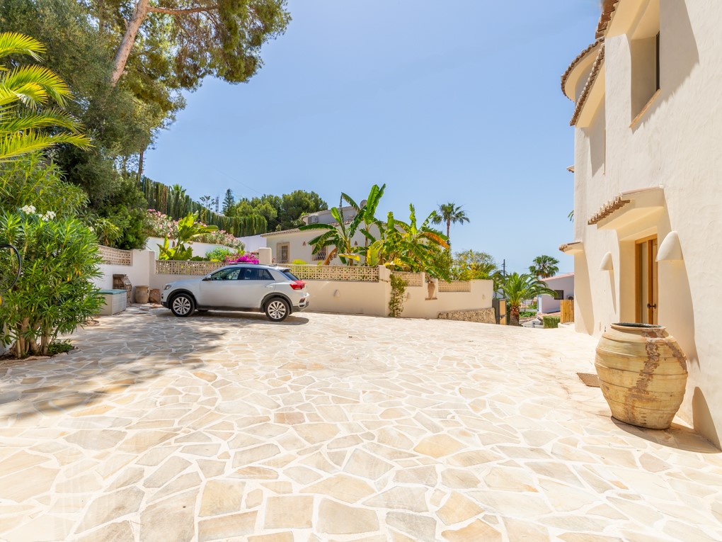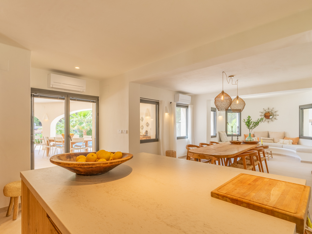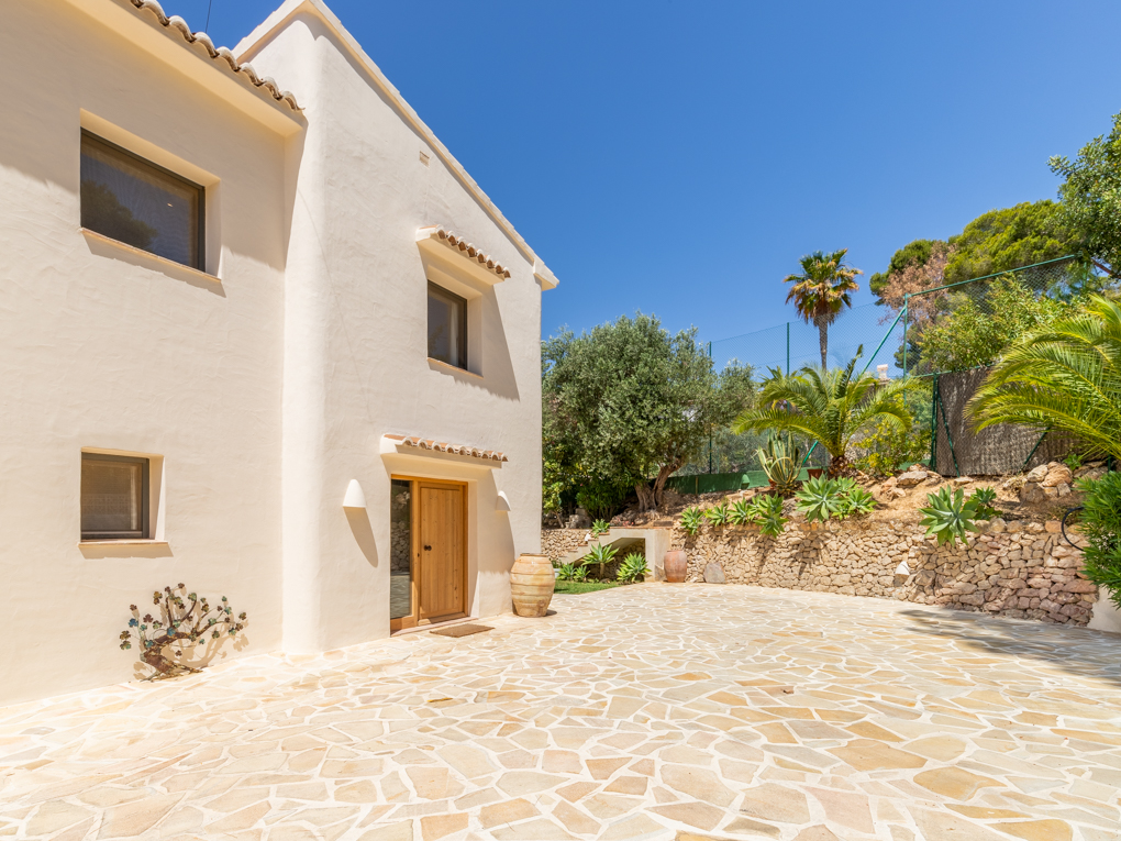 PROPERTY AT A GLANCE This stunning Mediterranean villa exudes timeless elegance with a modern Ibizan influence, perfectly blending traditional charm and contemporary comforts. Set on a flat, expansive plot of 1180m² with a build size of 463m², this beautifully renovated property offers a lifestyle of luxury and convenience in the picturesque town of Moraira, just 600 meters from a beautiful bay.