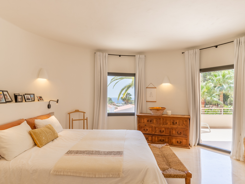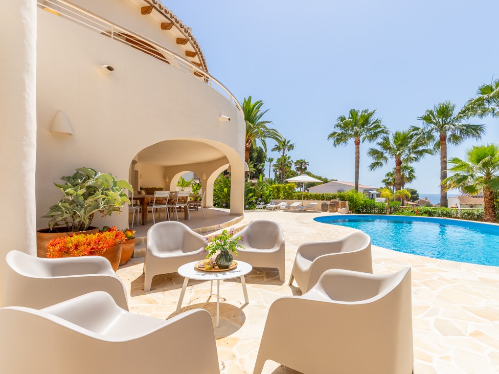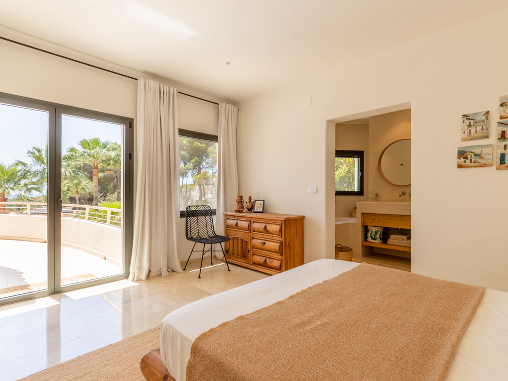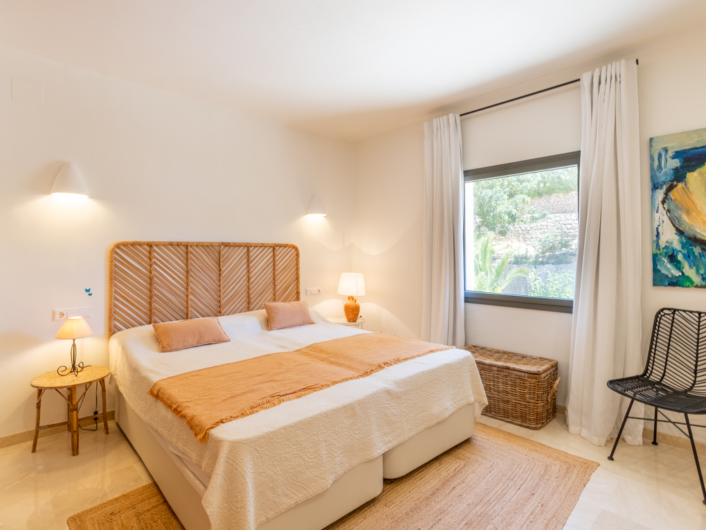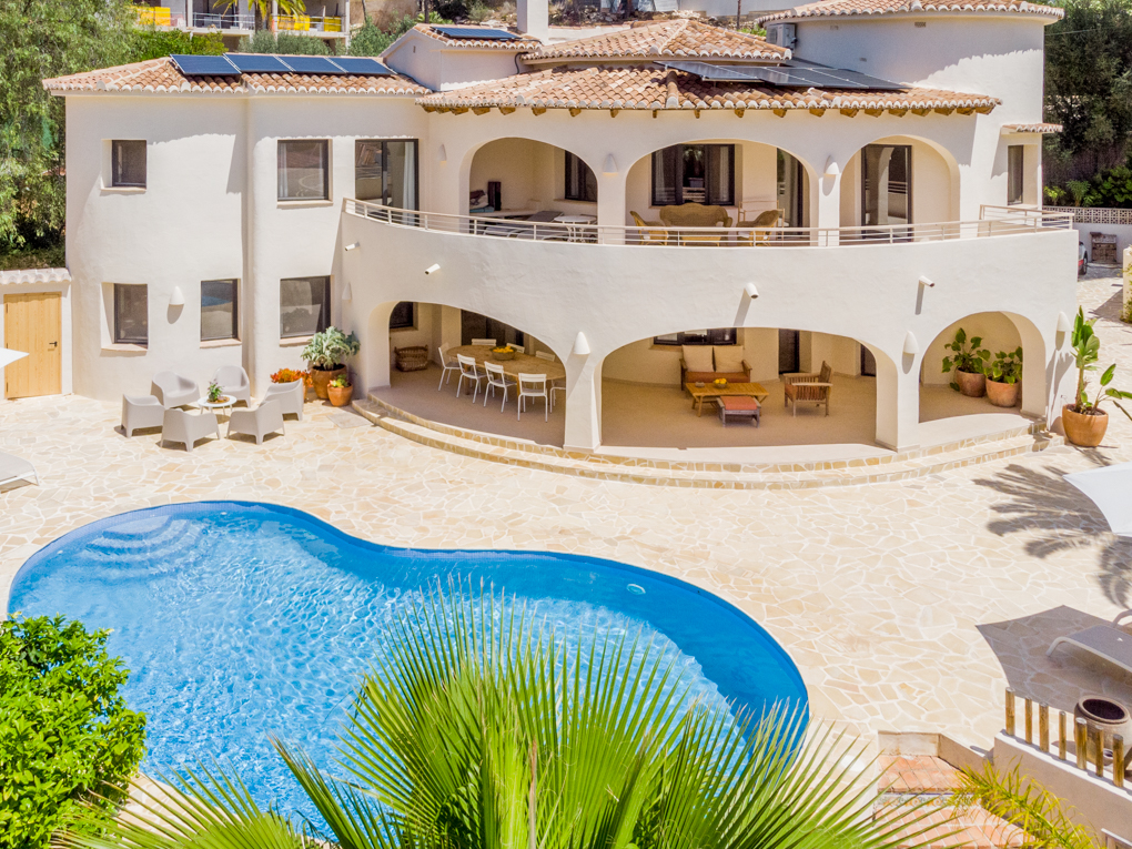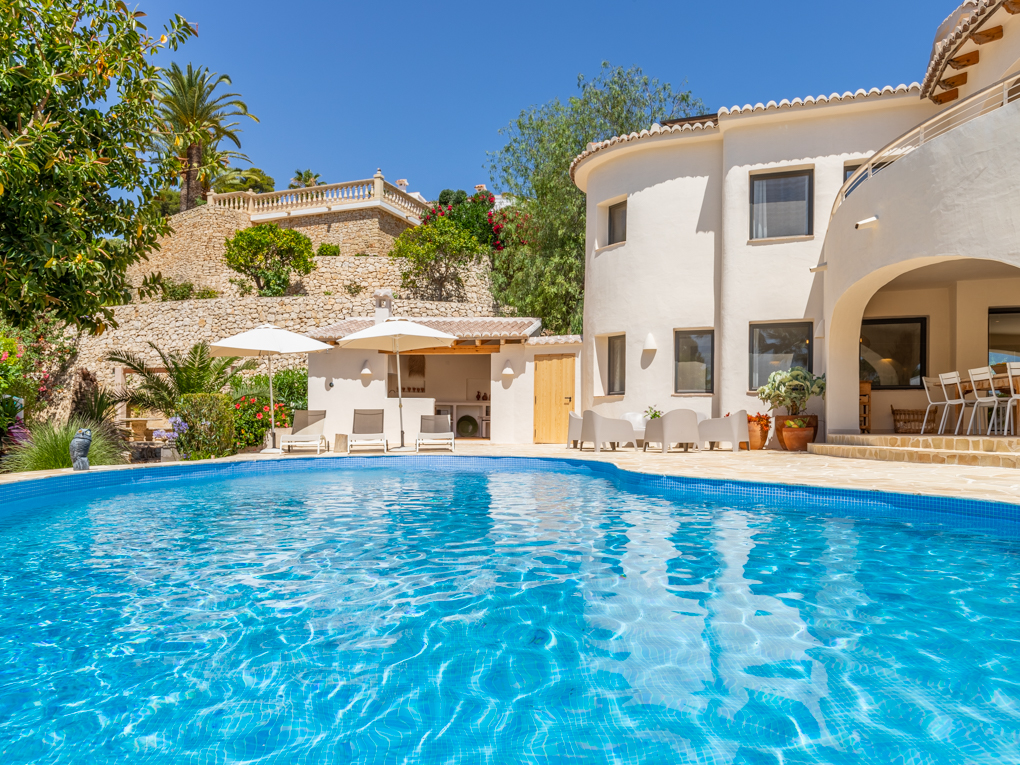 PROPERTY AT A GLANCE This stunning Mediterranean villa exudes timeless elegance with a modern Ibizan influence, perfectly blending traditional charm and contemporary comforts. Set on a flat, expansive plot of 1180m² with a build size of 463m², this beautifully renovated property offers a lifestyle of luxury and convenience in the picturesque town of Moraira, just 600 meters from a beautiful bay.