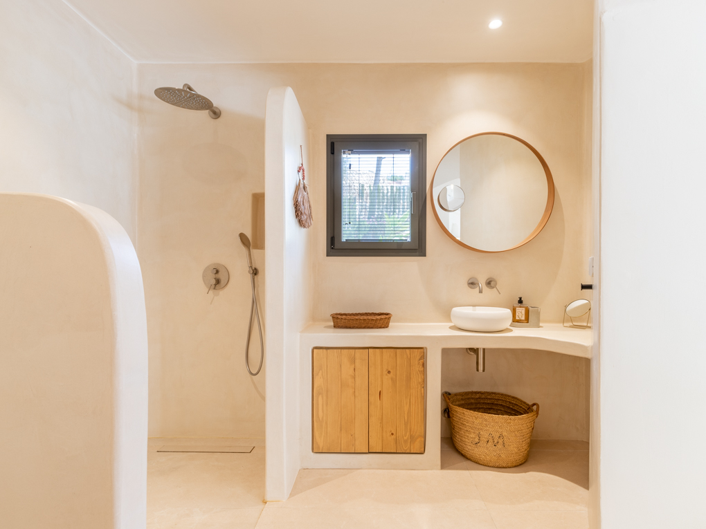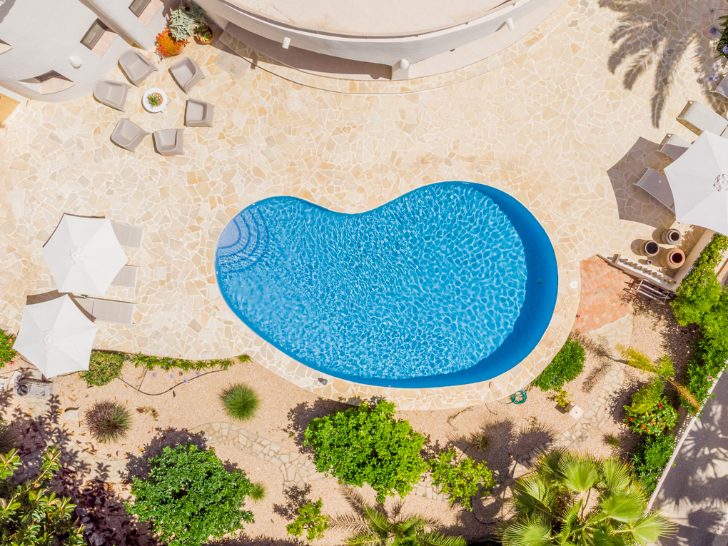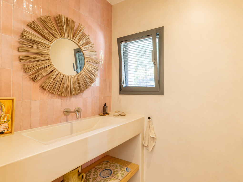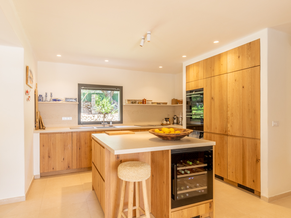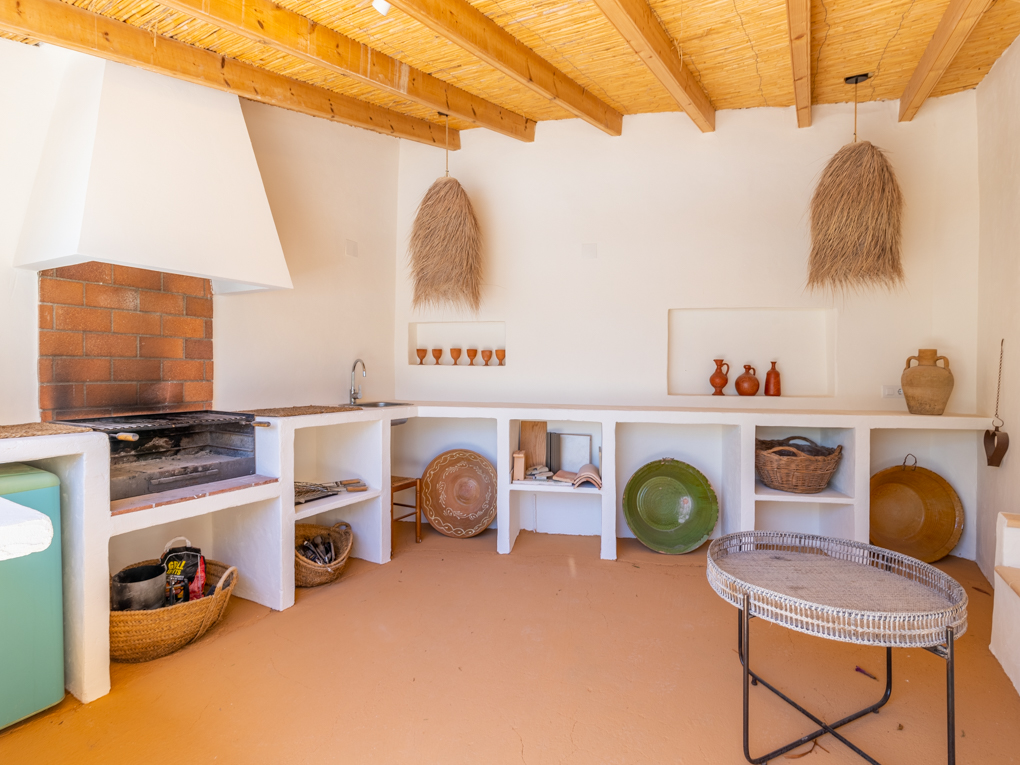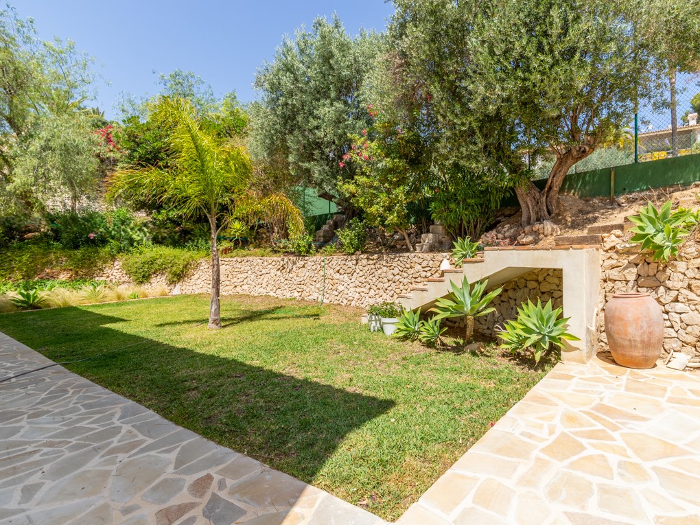 The outdoor spaces are designed to fully embrace the Mediterranean lifestyle. Beyond the naya, you'll find a summer kitchen with a built-in BBQ, sink, and ample storage. The natural stone terracing surrounding the pool provides various sunbathing and relaxation spots. The mature, lush Mediterranean garden offers privacy and includes a well-maintained lawn, framed by palm trees and vibrant greenery.