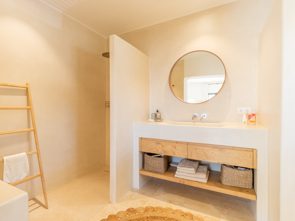 This villa includes 5 bedrooms and 4 bathrooms. A guest ensuite bedroom is located on the ground floor, while the upper level features 4 bedrooms, including the master suite. The master bedroom serves as a private retreat with a walk-in closet, ensuite bathroom, a spacious lounge/office area, and access to a large terrace with stunning sea views. Another ensuite bedroom and two additional bedrooms sharing a family bathroom complete this level.