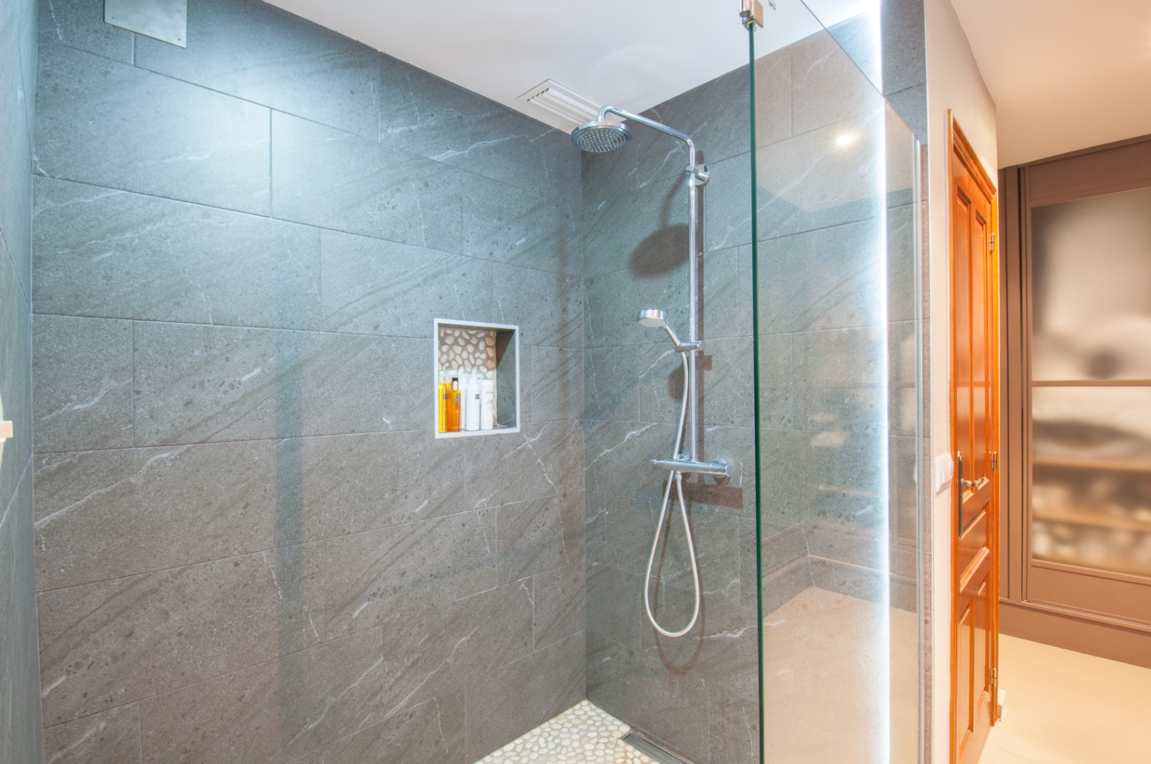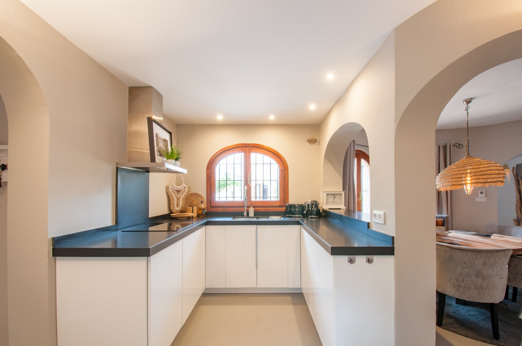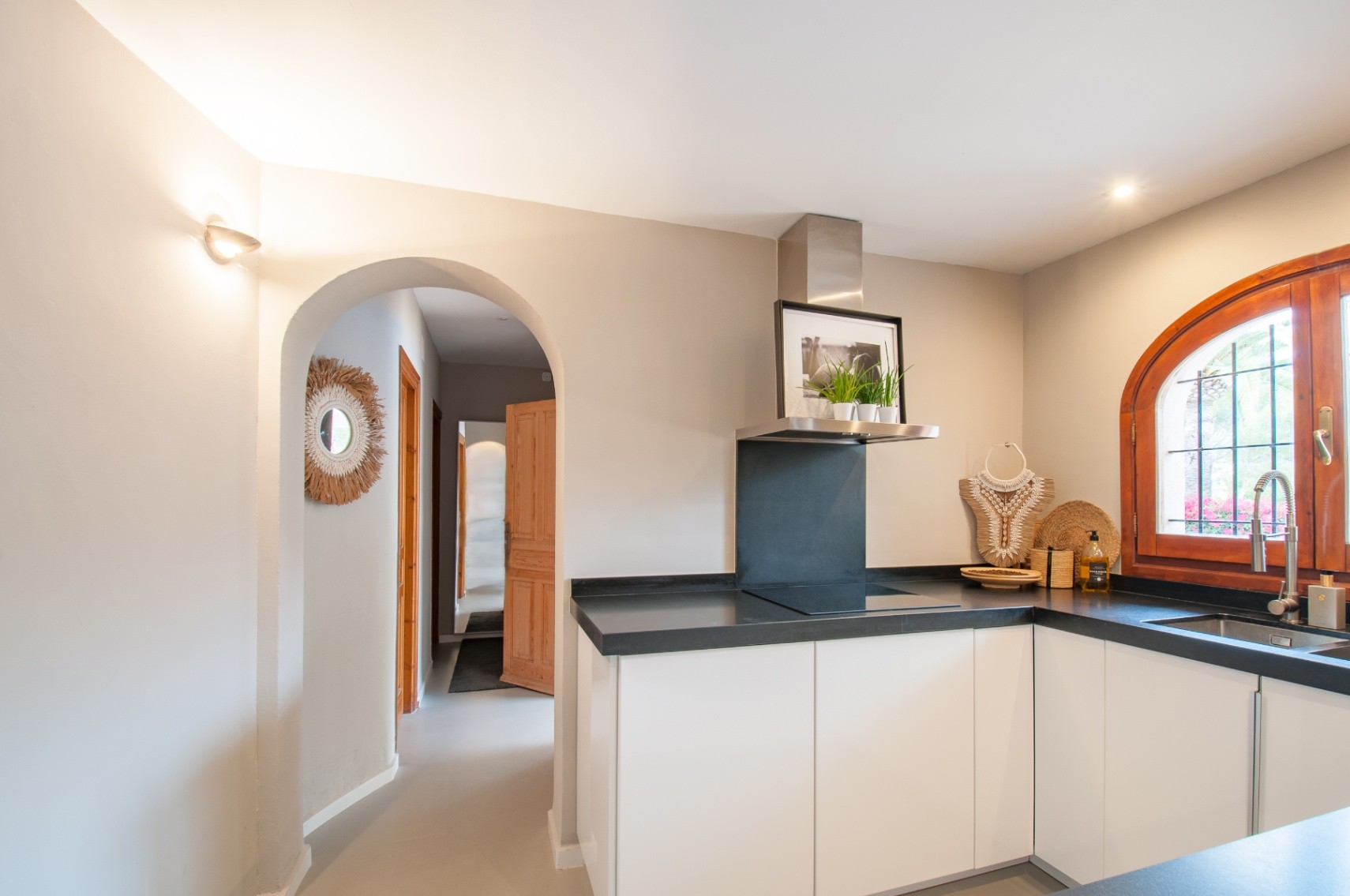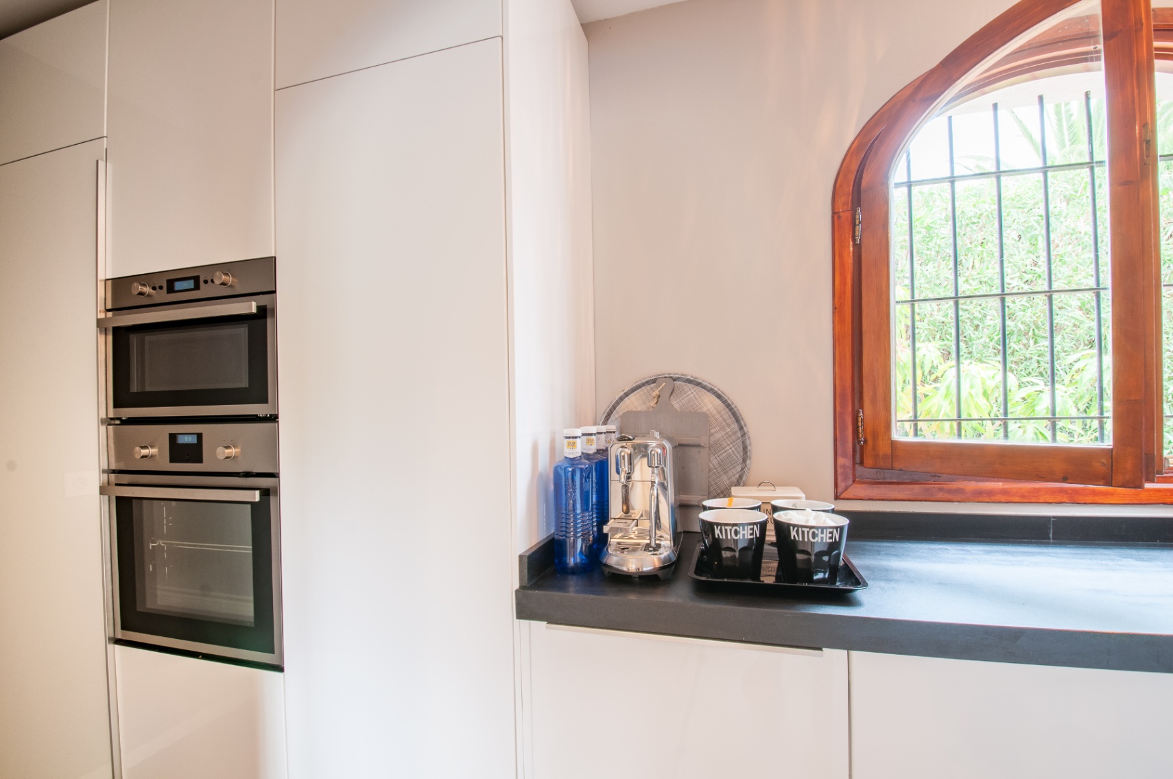 Functional and Stylish Kitchen: The kitchen is sleek and modern with clean lines, fitted with white cabinetry and black countertops. Its simplicity ensures functionality while complementing the villa’s overall Mediterranean charm.