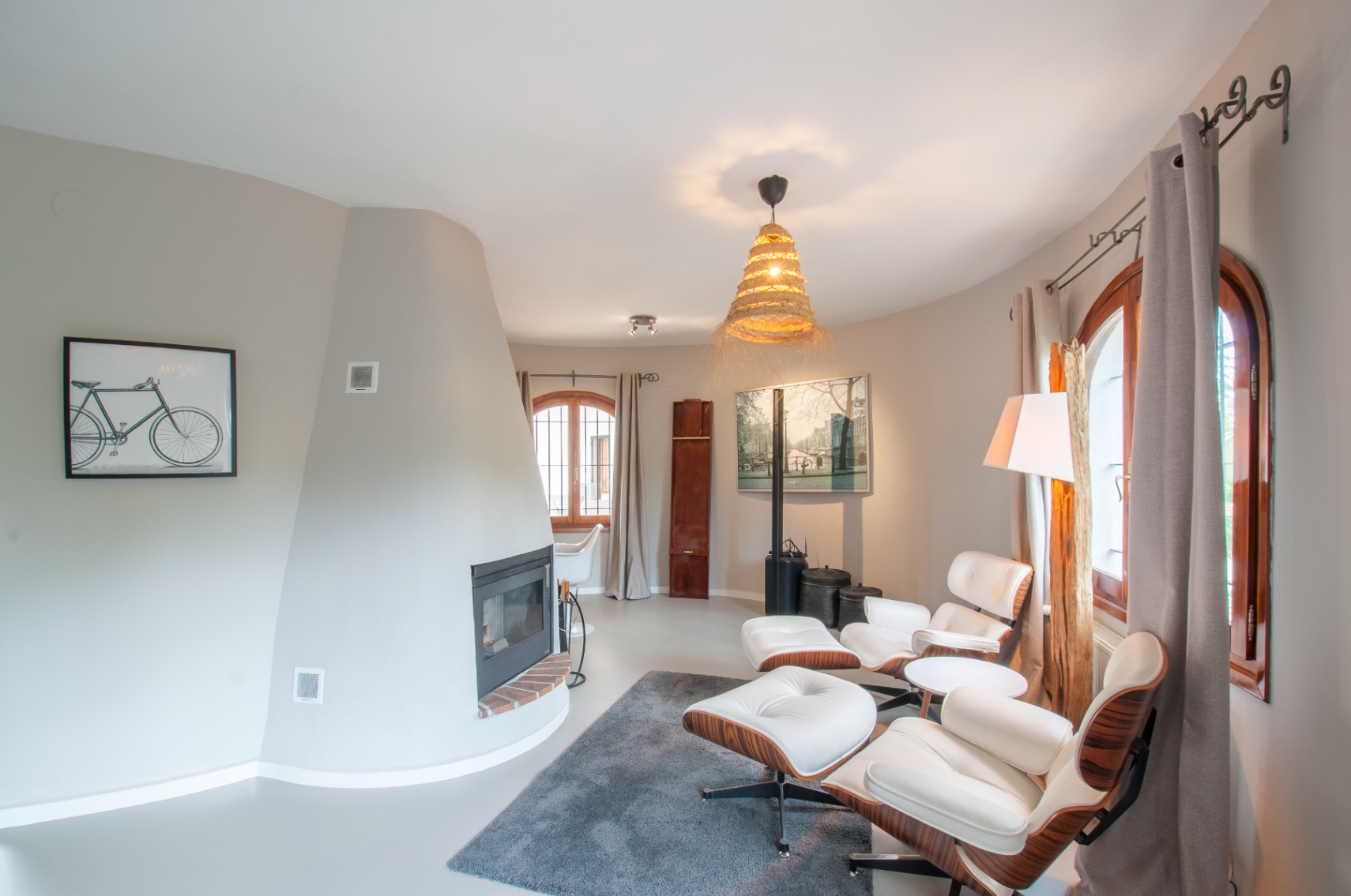Cosy Living Spaces: The living room is designed for relaxation, with ample seating, a central fireplace with a modern silhouette, and thoughtful lighting for a warm ambiance.
