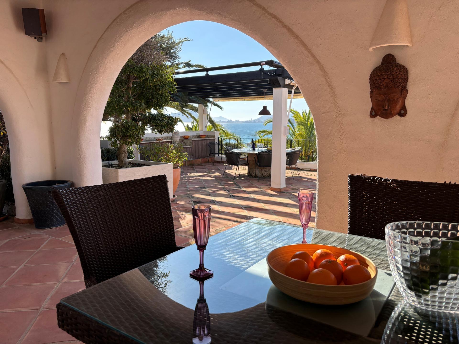 The outdoor areas include an 8m x 4m swimming pool with a pool cover, surrounded by open terracing for sunbathing. After a refreshing dip, retreat to the shaded Naya with its chill-out lounge and dining area, the perfect place to unwind . Adjacent to the kitchen, a pergola dining area with a retractable shade provides a convenient setting for breakfasting, while an additional side terrace offers a quiet and peaceful sheltered area for morning coffee or evening relaxation. The main terrace features another pergola dining space again with retractable shade, complete with built-in storage and a BBQ area, providing an elevated vantage point for enjoying stunning sea views over the marina and the iconic Peñón de Ifach and watching yachts and boats glide across the horizon . Whether hosting elegant gatherings or intimate dinners, this villa is designed for effortless enjoyment.