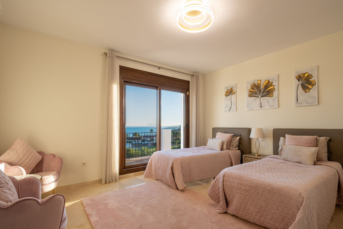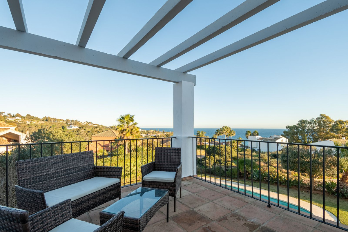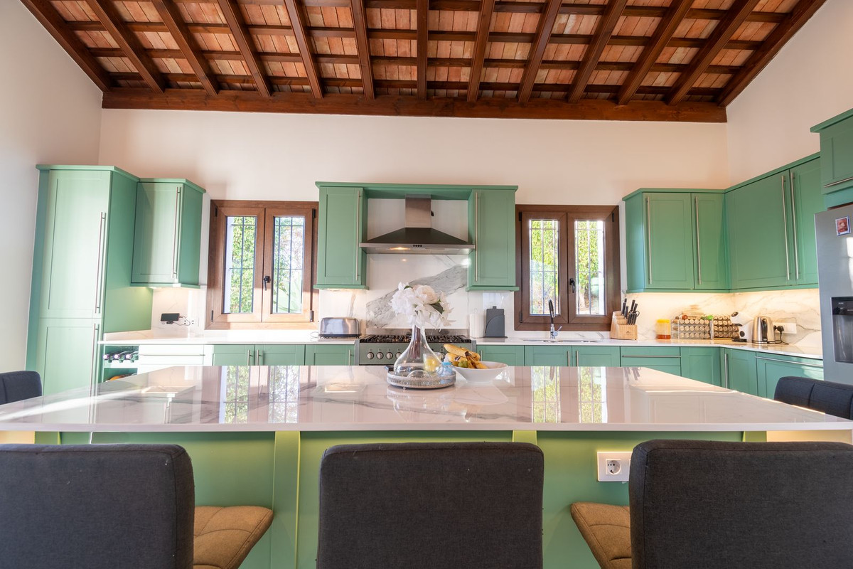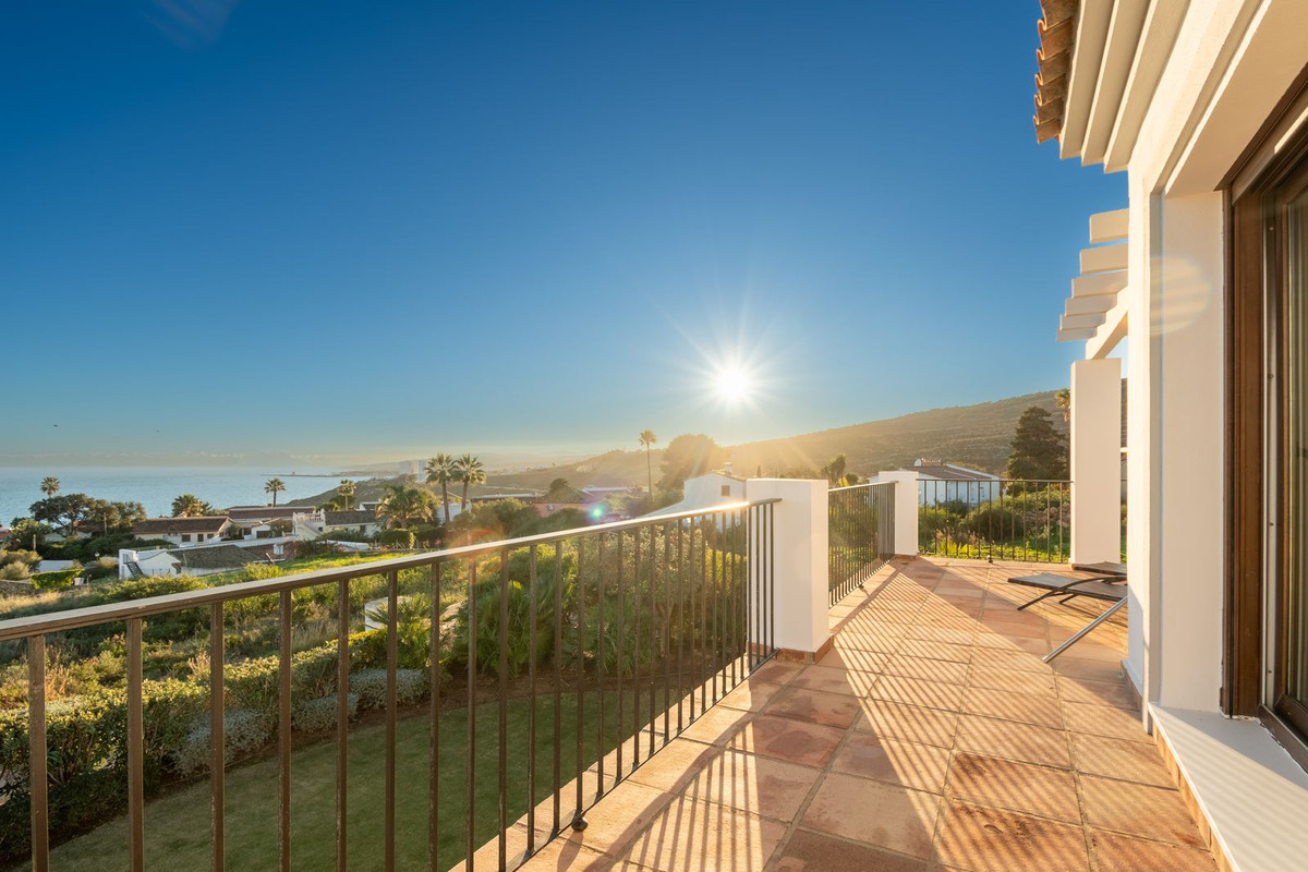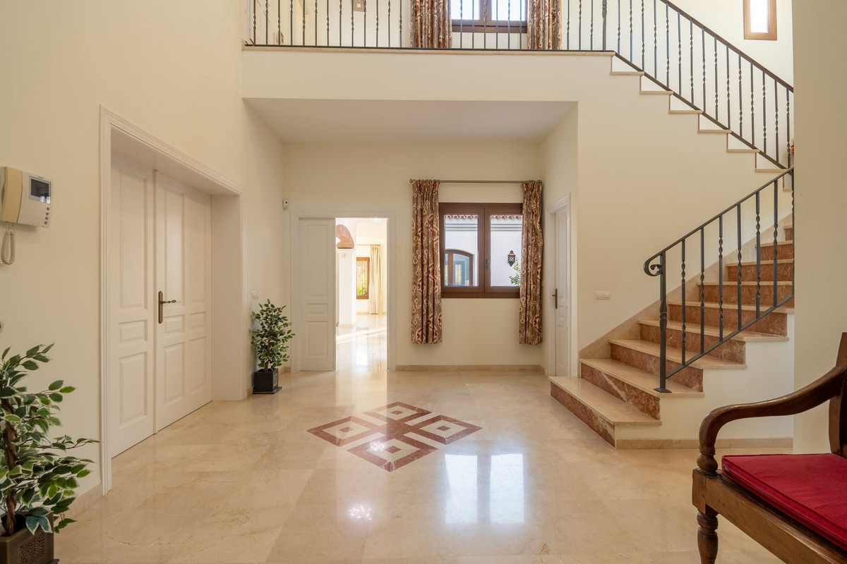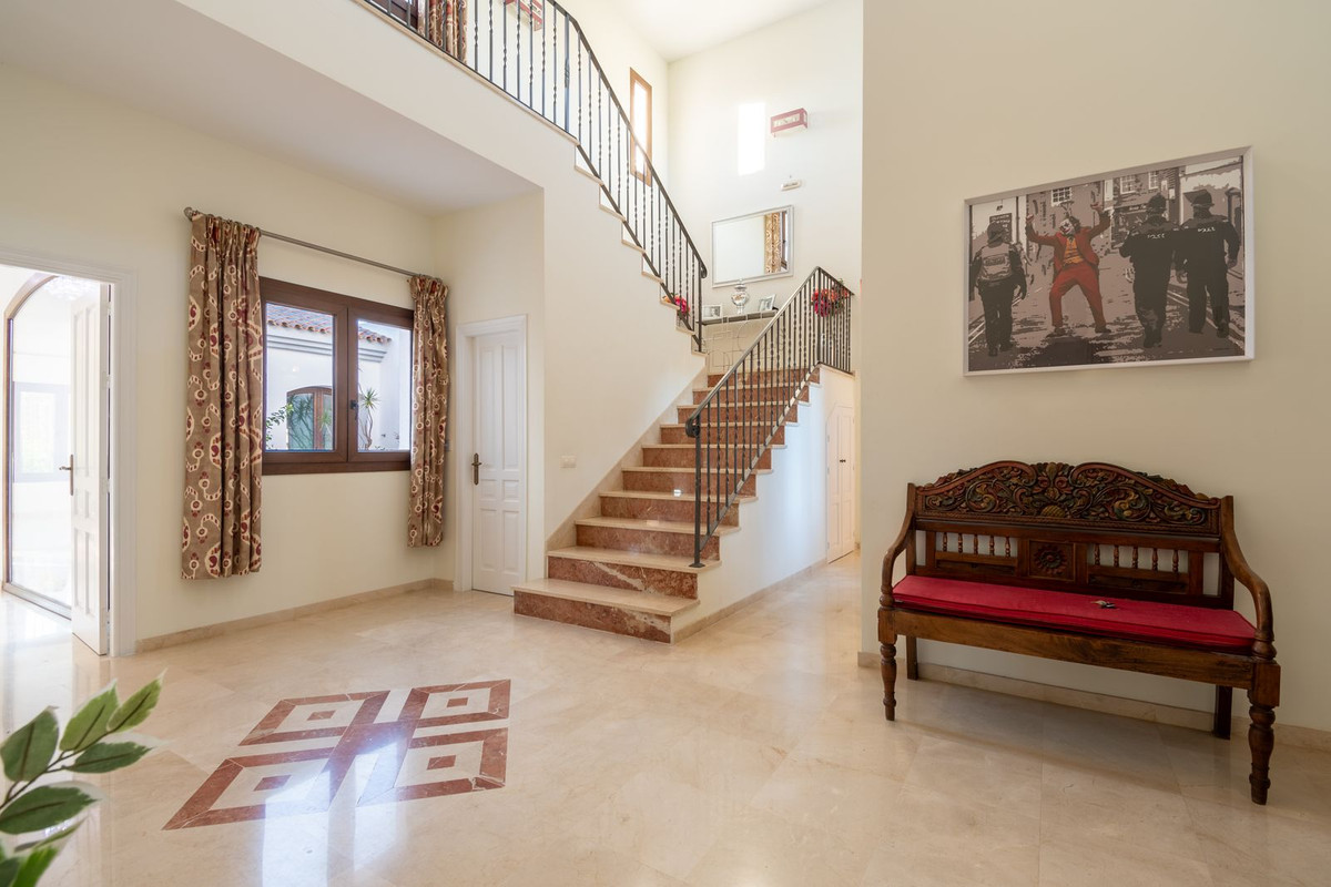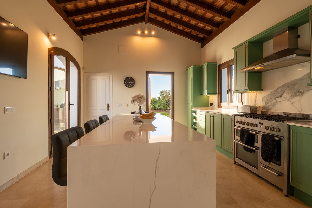 Nestled between the prestigious Sotogrande and the picturesque La Duquesa Marinas, this truly stunning five-bedroom detached villa offers a luxurious retreat within a mere 10 minutes' drive in between the two Marinas. The villa has a south orientation, providing all day sunshine and truly captivating views. The villa's exterior features a private swimming pool, beautiful tropical gardens, and an inviting interior courtyard, creating a serene and visually pleasing ambiance. Upon entering, the high-ceilinged entrance hall welcomes you into a meticulously designed interior. The expansive lounge and dining areas are thoughtfully separated, providing both spaciousness and comfort. The property has a brand-new kitchen, and immaculate bathrooms on both the ground floor and in the upstairs master bedroom. For added comfort, underfloor heating is installed on both levels, accompanied by a wood burner fire in the lounge - perfect for winter evenings! A spacious garage with room for two vehicles, coupled with a driveway accommodating an additional two vehicles, ensures ample parking space for guests. With world-class 5-star golf courses just a few-minutes drive away, this residence becomes a golfer's paradise, combining luxury living with proximity to leisure activities. A private terrace offers an ideal space for unwinding or entertaining guests, providing the perfect vantage point to appreciate the beauty of the property's private fruit garden. This home is meticulously designed for comfort and elegance, situated just a few steps of the most sought-after locations, Sotogrande. An absolute must view completely unique property - contact us now!