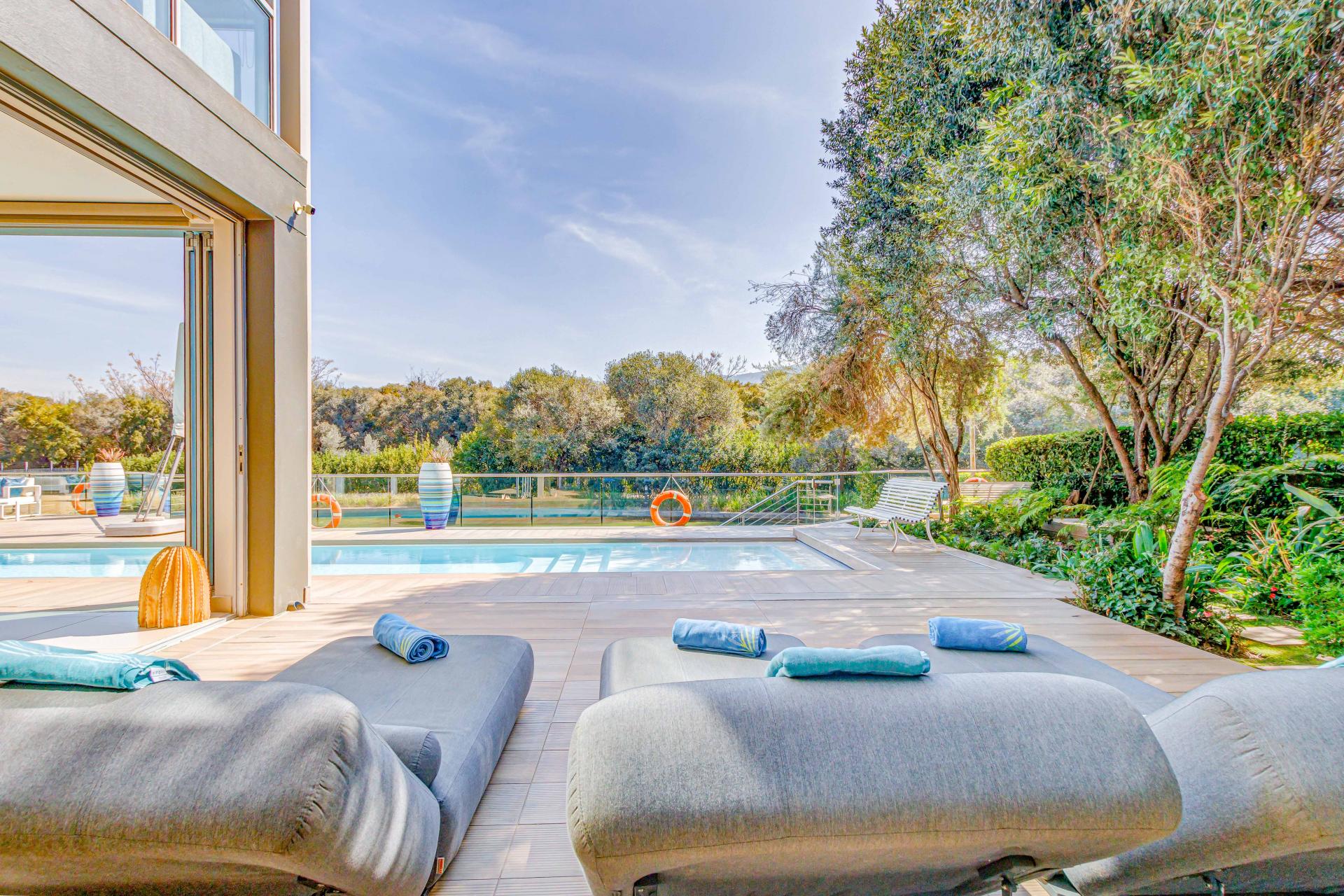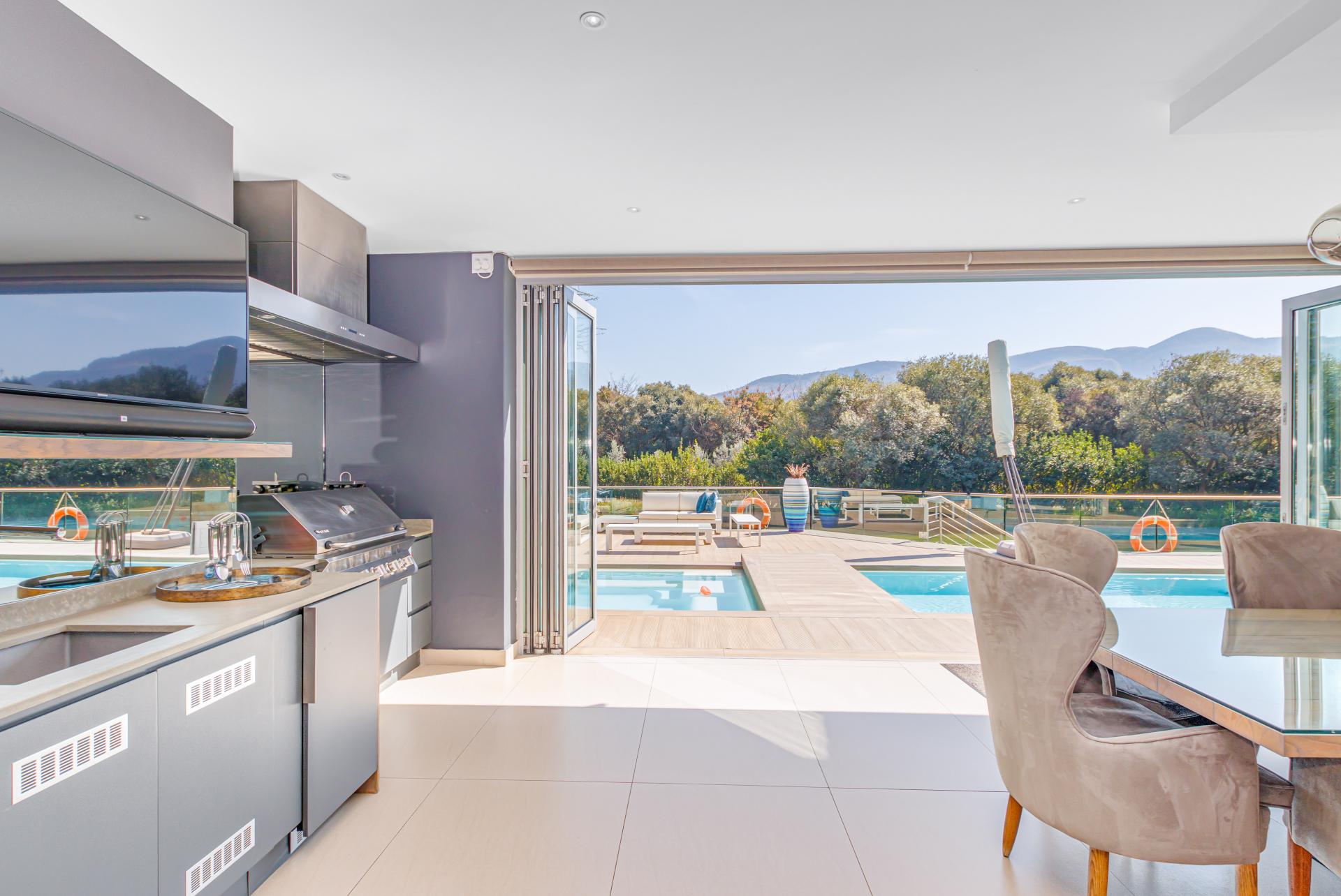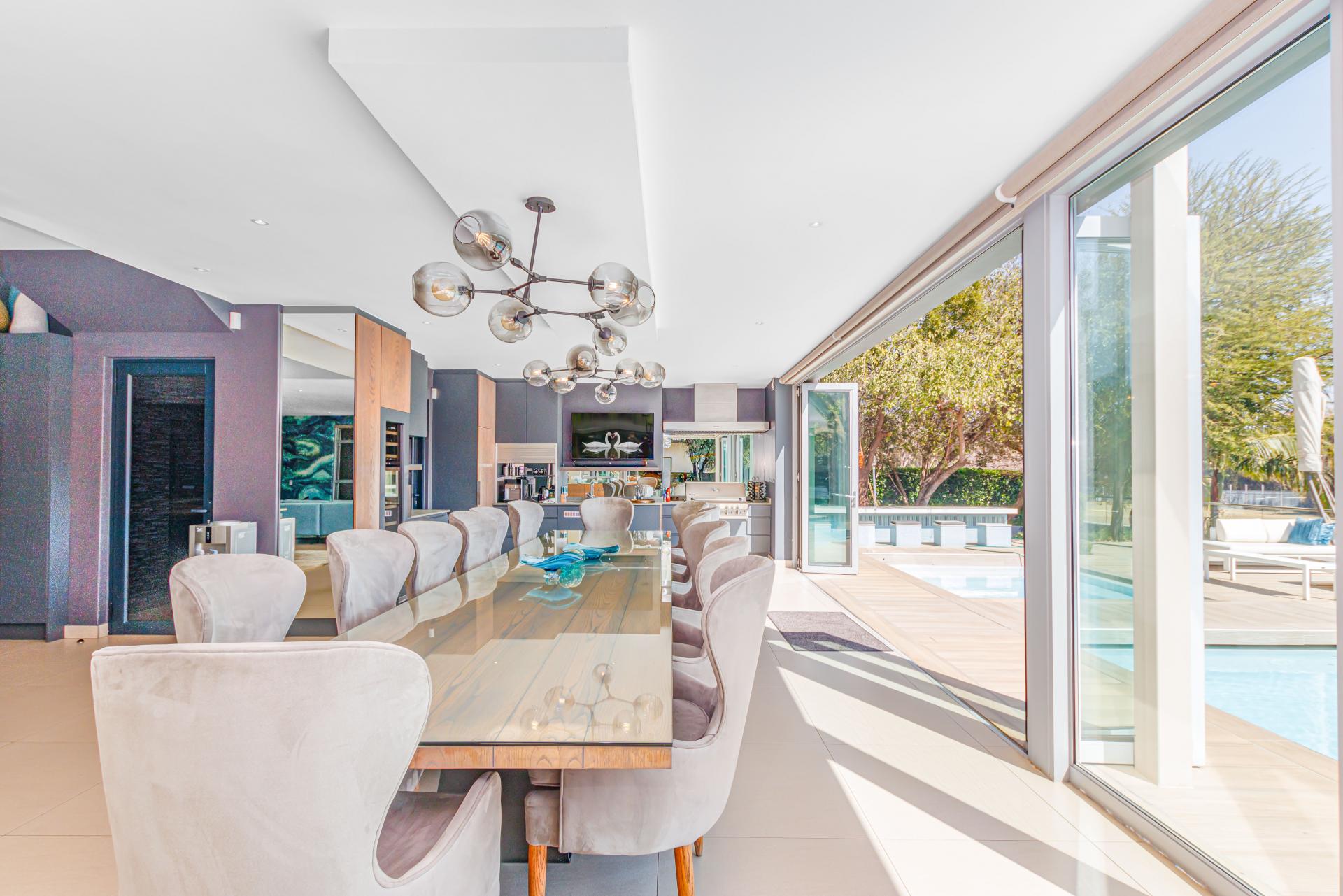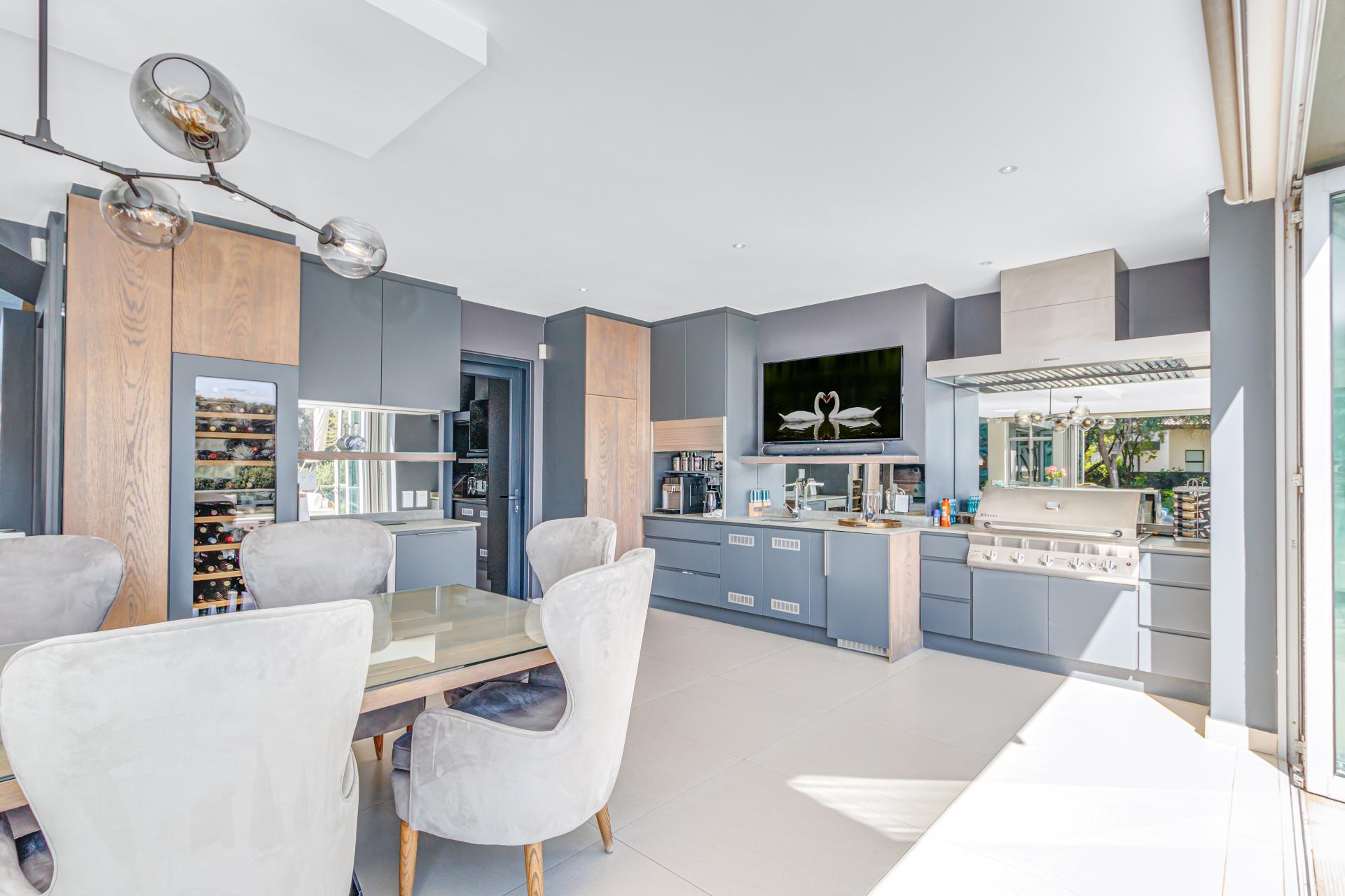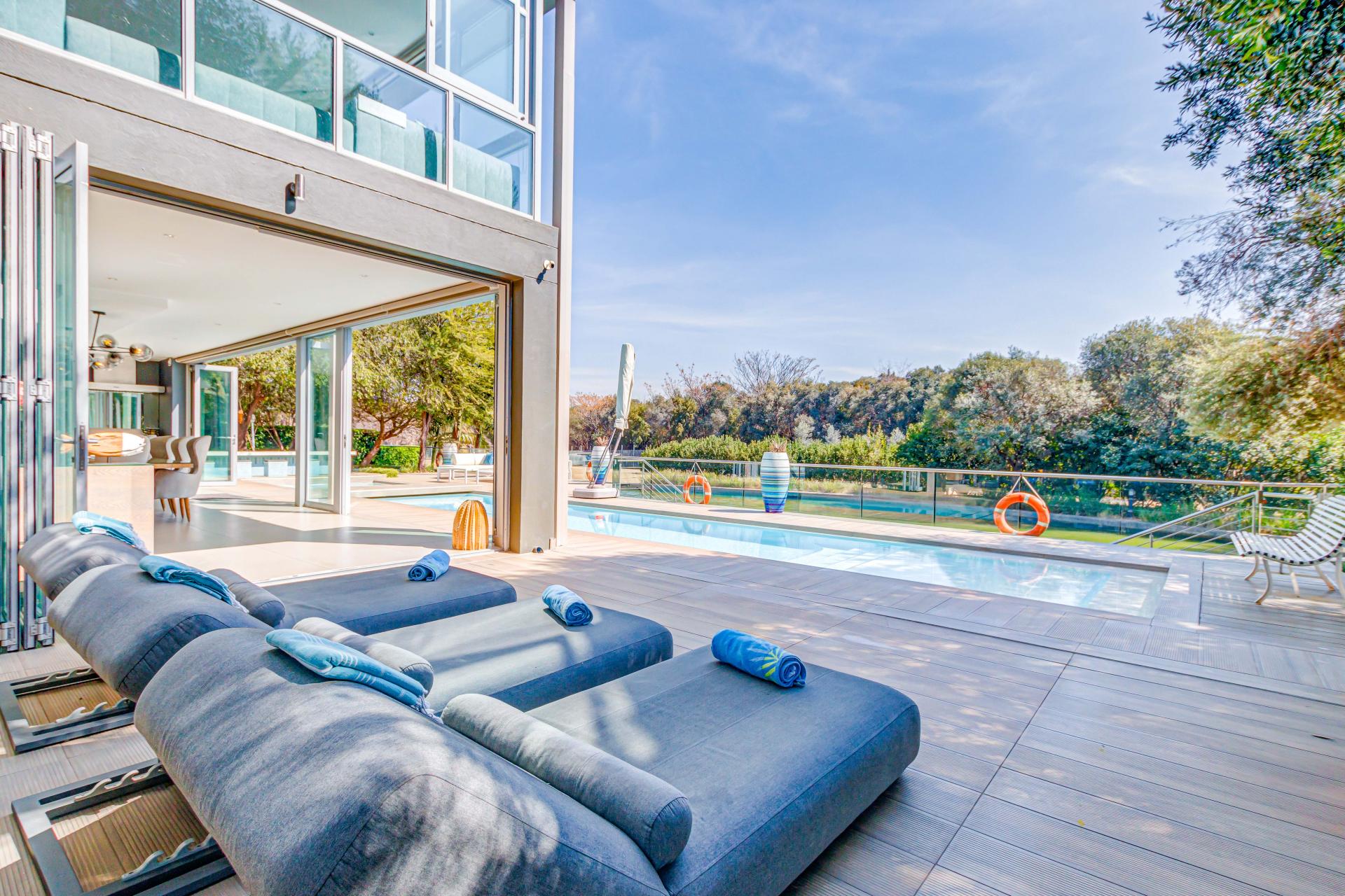 Nothing is out of place from the moment you walk into the high volume entrance opening onto an open plan living experience, well suited to capture the views and openness the home offers. The kitchen offers a beautiful space with built in wine fridges and a wine cellar with a seamless flow throughout. Inside blends with the outside when the doors are opened up and the entertainment space comes to life with a sparkling pool with an automated cover, pizza oven, fire pit right by the canal and access to the canal from the property. The best part is that the gas braai is inside, but feels like it is outside when the doors are all open. To truly capture the views beyond, there is a rooftop patio with bar and gas braai.