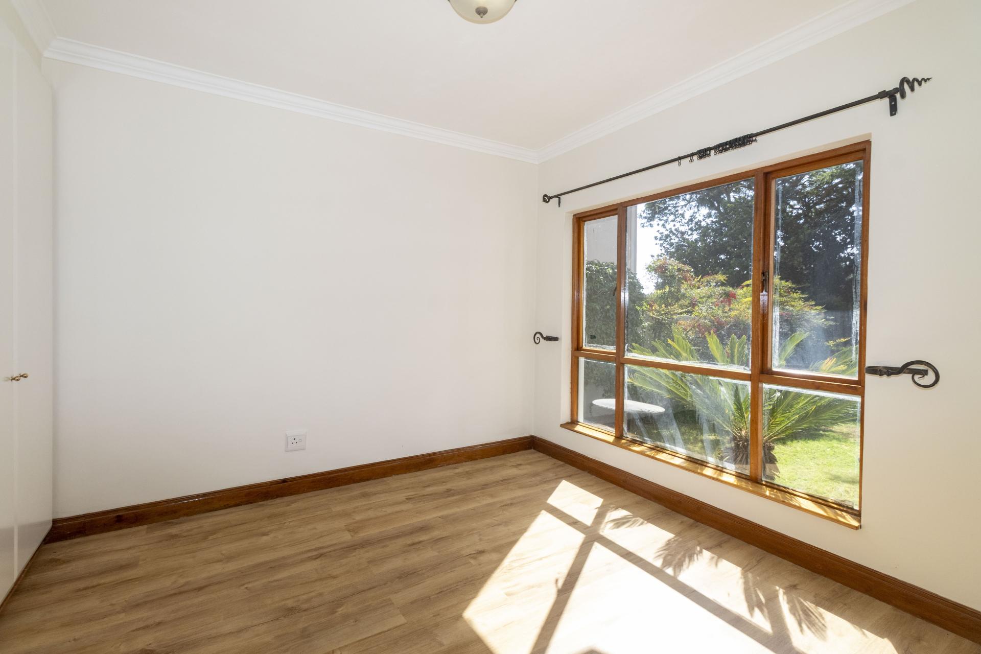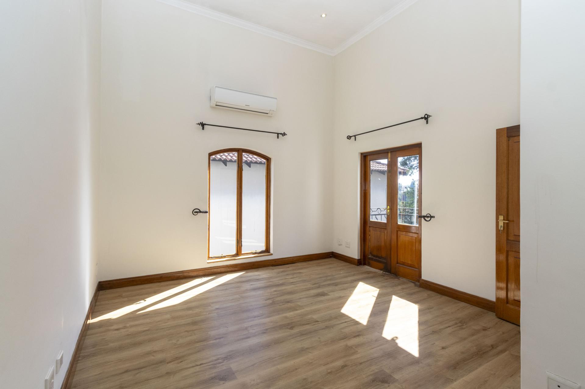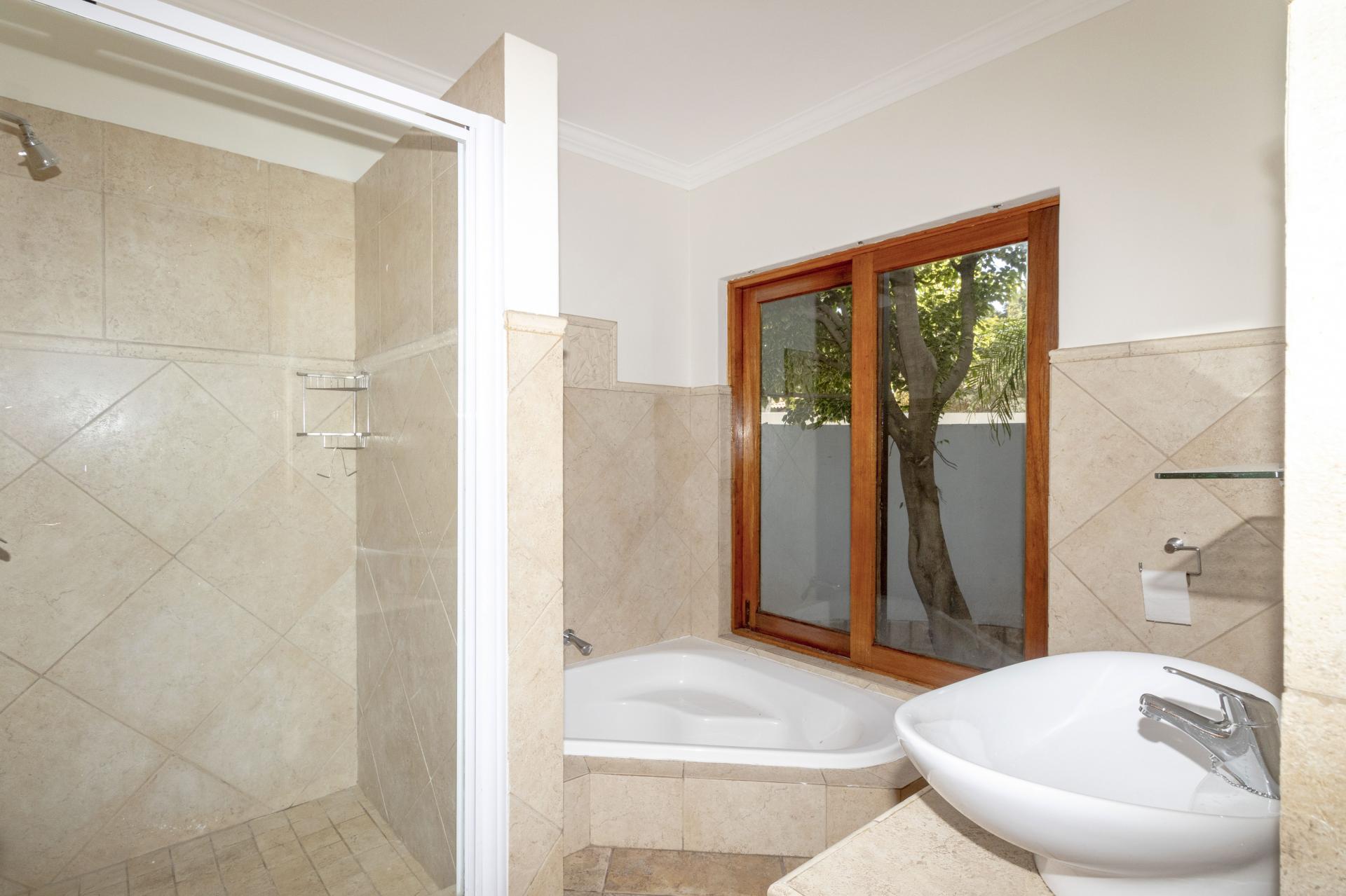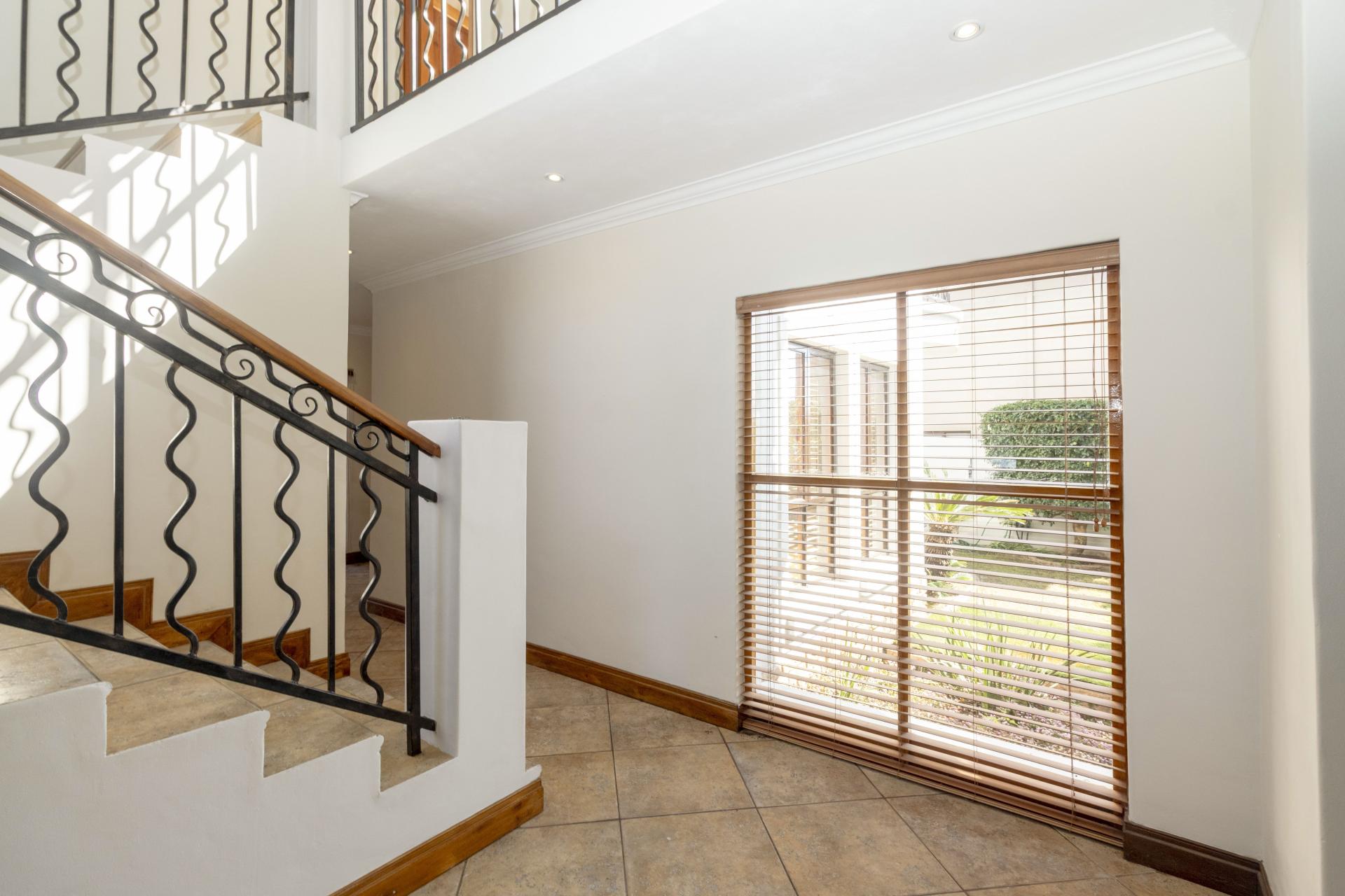 Step into the main house through a striking double-volume entrance that leads to a thoughtfully designed interior. The spacious master suite upstairs offers a private haven with a large en-suite bathroom, ample cupboard space, and an adjoining office—perfect for working from home. Two additional bedrooms situated downstairs share a stylish, bathroom, providing ample space for family living.