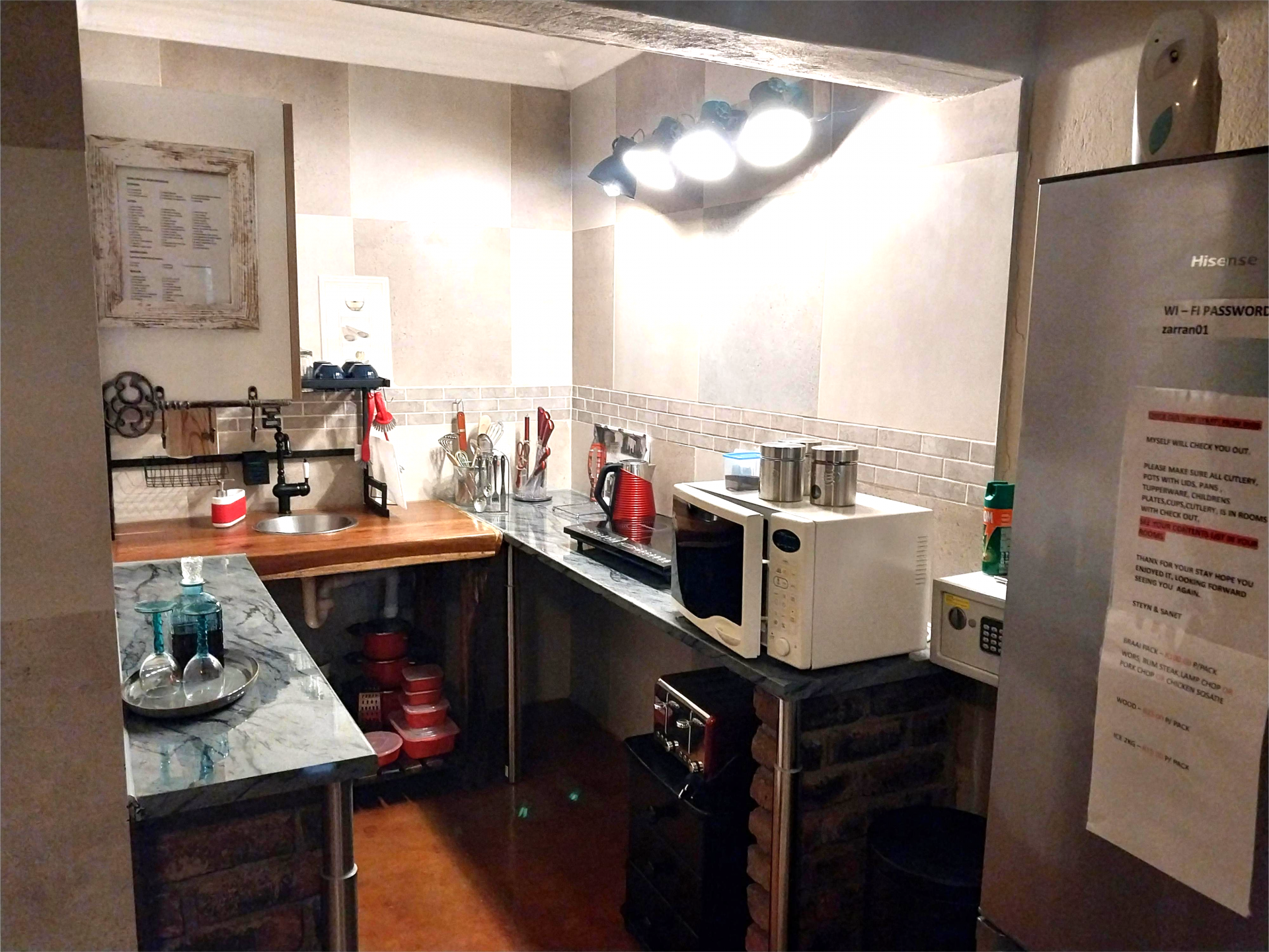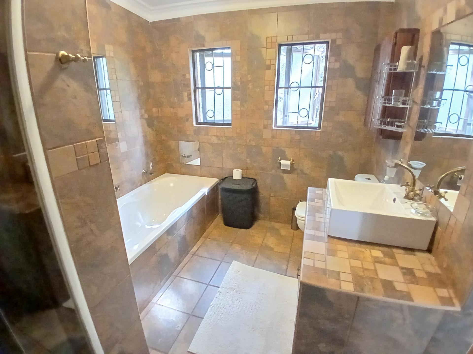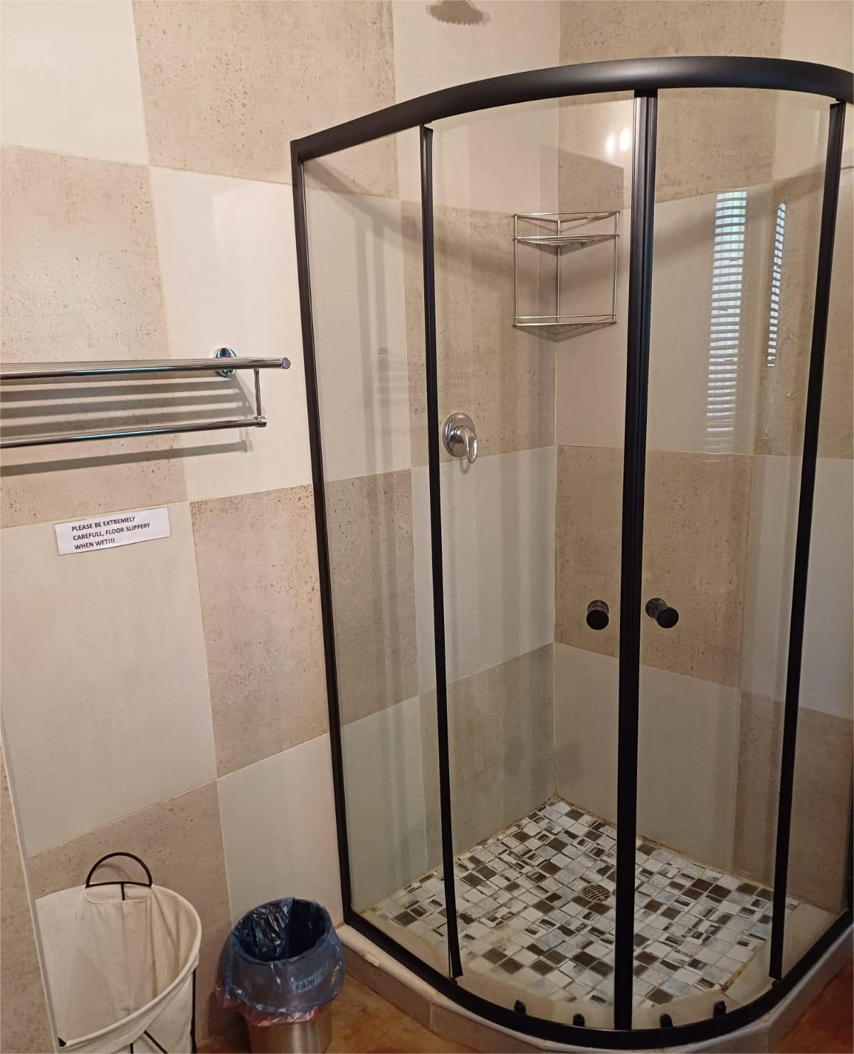 The main unit boasts two comfortable bedrooms, with cupboards and aircons, with the main having a walk in cupboard. Open plan living dining and kitchen area. Well laid out and fully equipped for your with a separate scullery area. This unit features 3 entrances for your convenience. On from the courtyard into the sitting area and the other one from the main en-suite leading to the pool and entertainment area, as well as a back door leading to the laundromat.