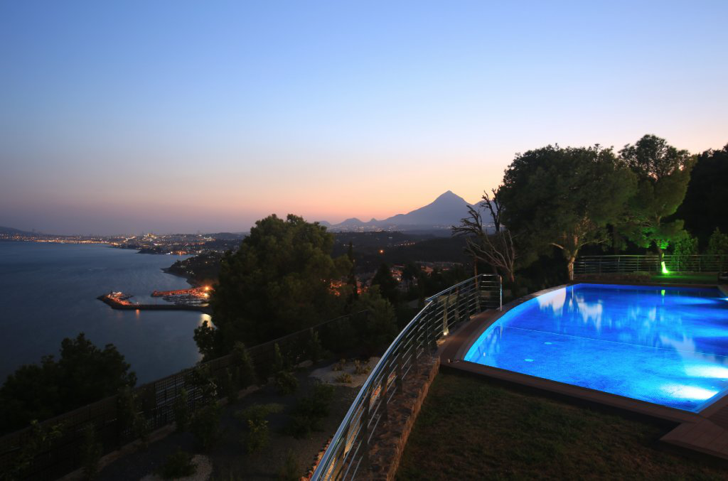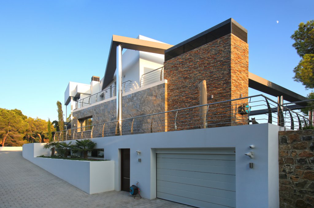 The living areas and bedrooms are spread across three levels with a glass elevator for ease of transport from the basement to the two other levels. On the main floor you will find the vast open plan living area, with clever and ambient LED lighting and floor to ceiling insulated tinted glass expanses to maximise the fabulous panoramic views, incorporating a formal dining area, two lounge areas including one with a modern yet cosy fireplace and a designer gourmet kitchen fitted with high-end appliances from Bosch, on the same level there is a guest toilet and a guest bedroom with ensuite, these are areas that have access to the terraces pool and garden areas. On the first floor there are 3 ensuite bedrooms including the Master bedroom with a walk-in wardrobe and ensuite with Jacuzzi bath allowing you to bathe enjoying sea views. All rooms have direct access to the large sun terraces. In the lower level you will find the private bespoke wine cellar large enough to entertain guests in plus a home cinema/games room and a gymnasium. There is also a separate one bedroomed studio apartment with lounge and kitchen area ideal for staff quarters or for older family members wanting their own independence, ample storage space, a laundry room and the integrated garage with direct access.