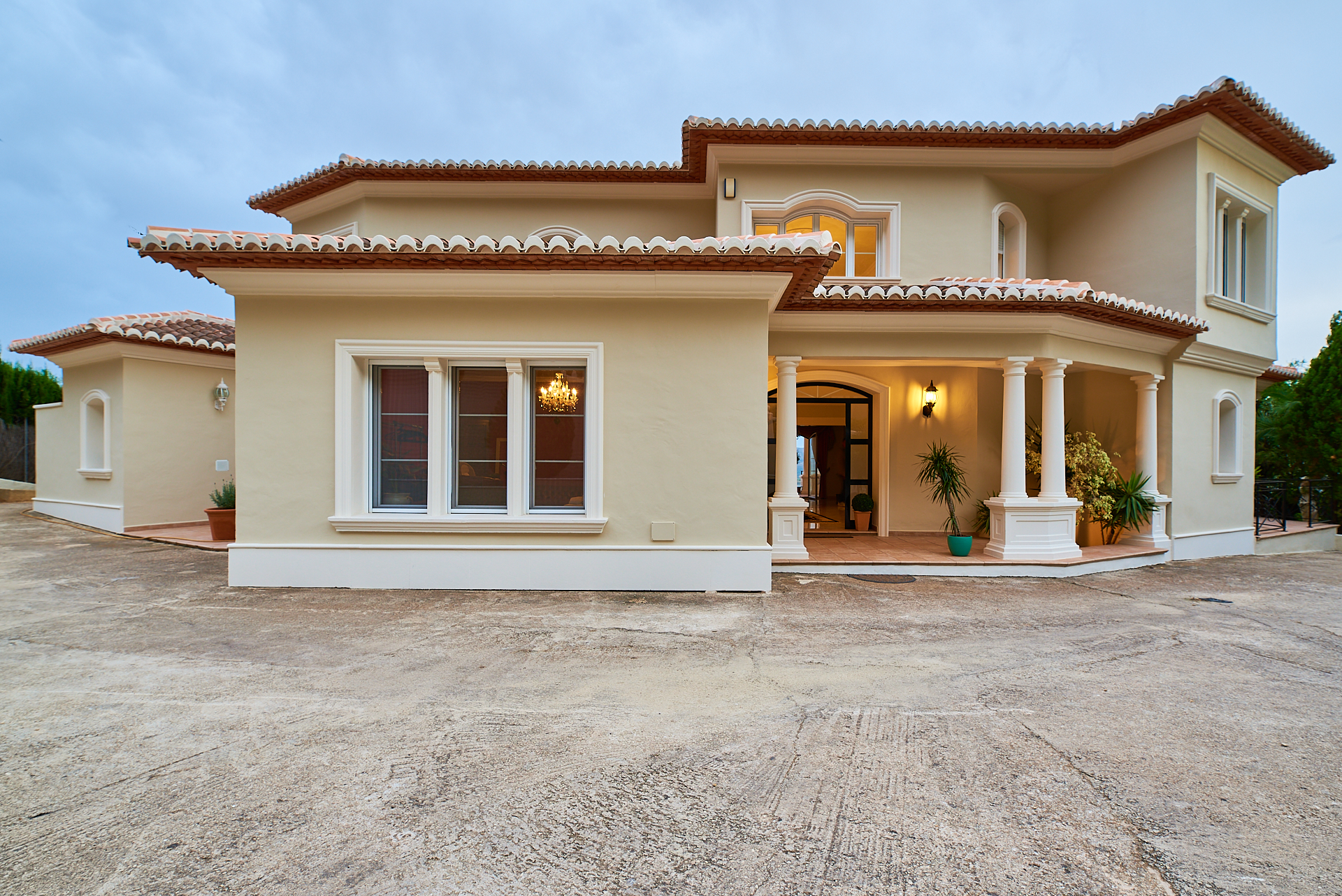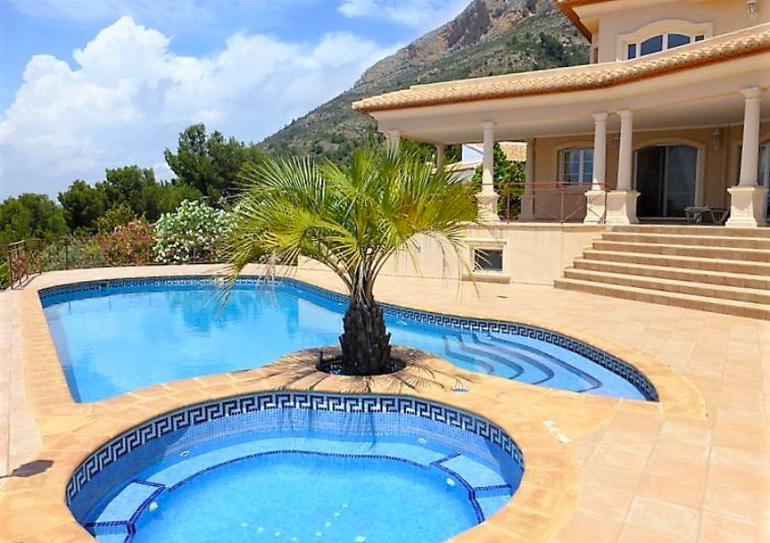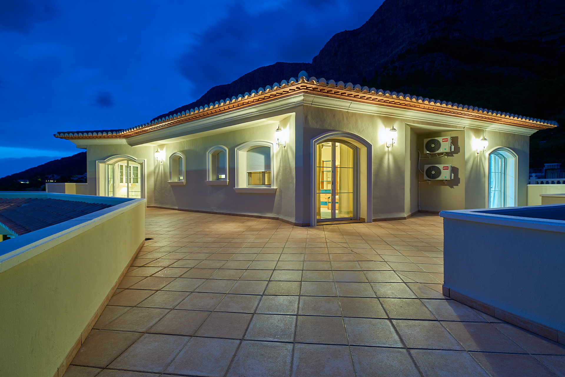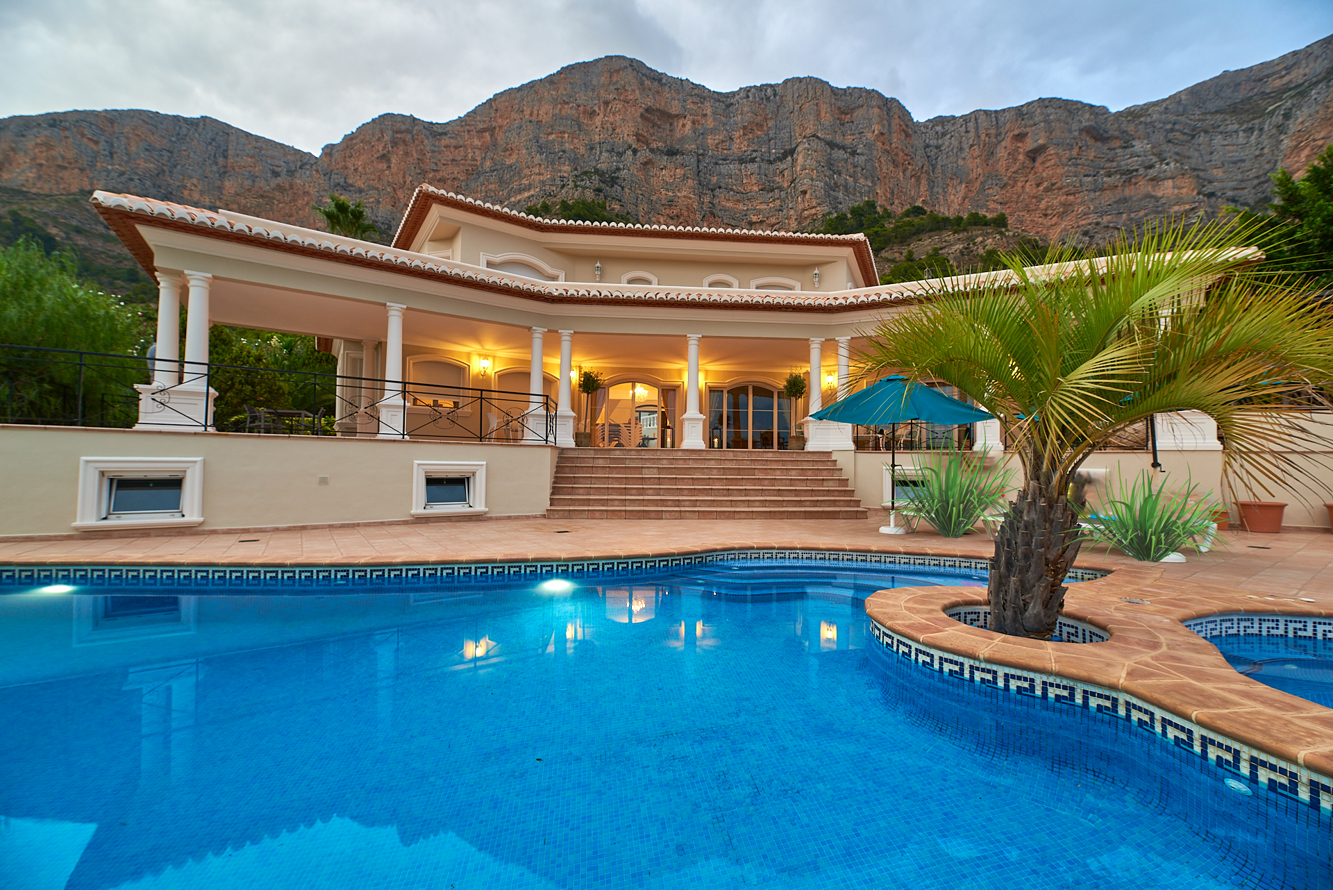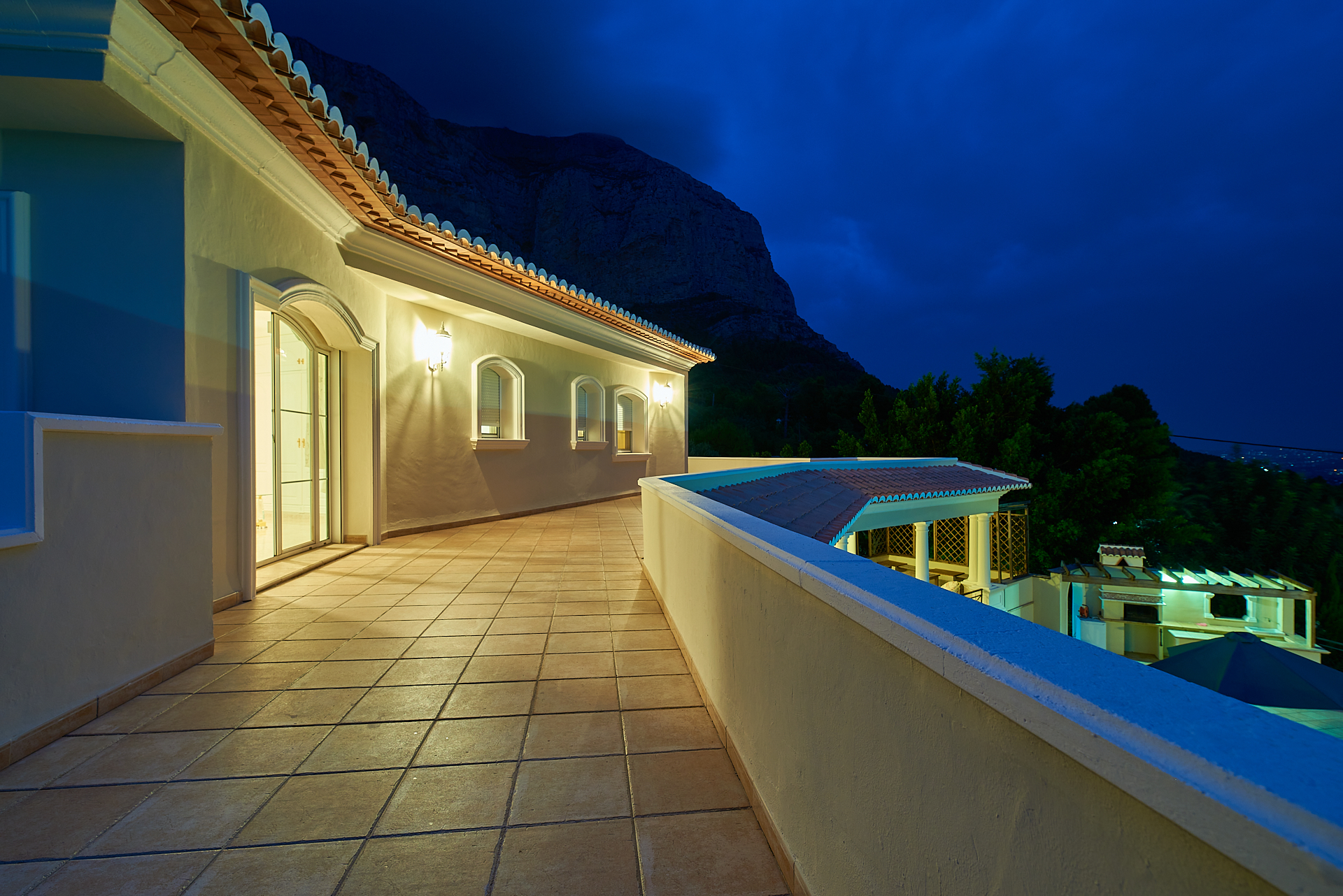With a backdrop against the mighty Montgo Mountain and stunning 180º panoramic views of the valley this private south facing property built over three levels offers grand yet welcoming interiors that includes a beautiful staircase like a work of art in itself, and wonderful exteriors that includes a pool oasis with a separate Jacuzzi, a tennis court and an abundance of outside areas for alfresco living all summer long and when the weather cools you have the perfect place inside as the formal lounge and dining area open to merge together for hosting amazing parties and gatherings. The basement area which already features a billiard room with lounge recess and a home cinema room also offers areas to create a gymnasium, wellness area, wine bodega, games room etc., and there is even a separate guest apartment with own entrance for visitors or older family members requiring privacy.
