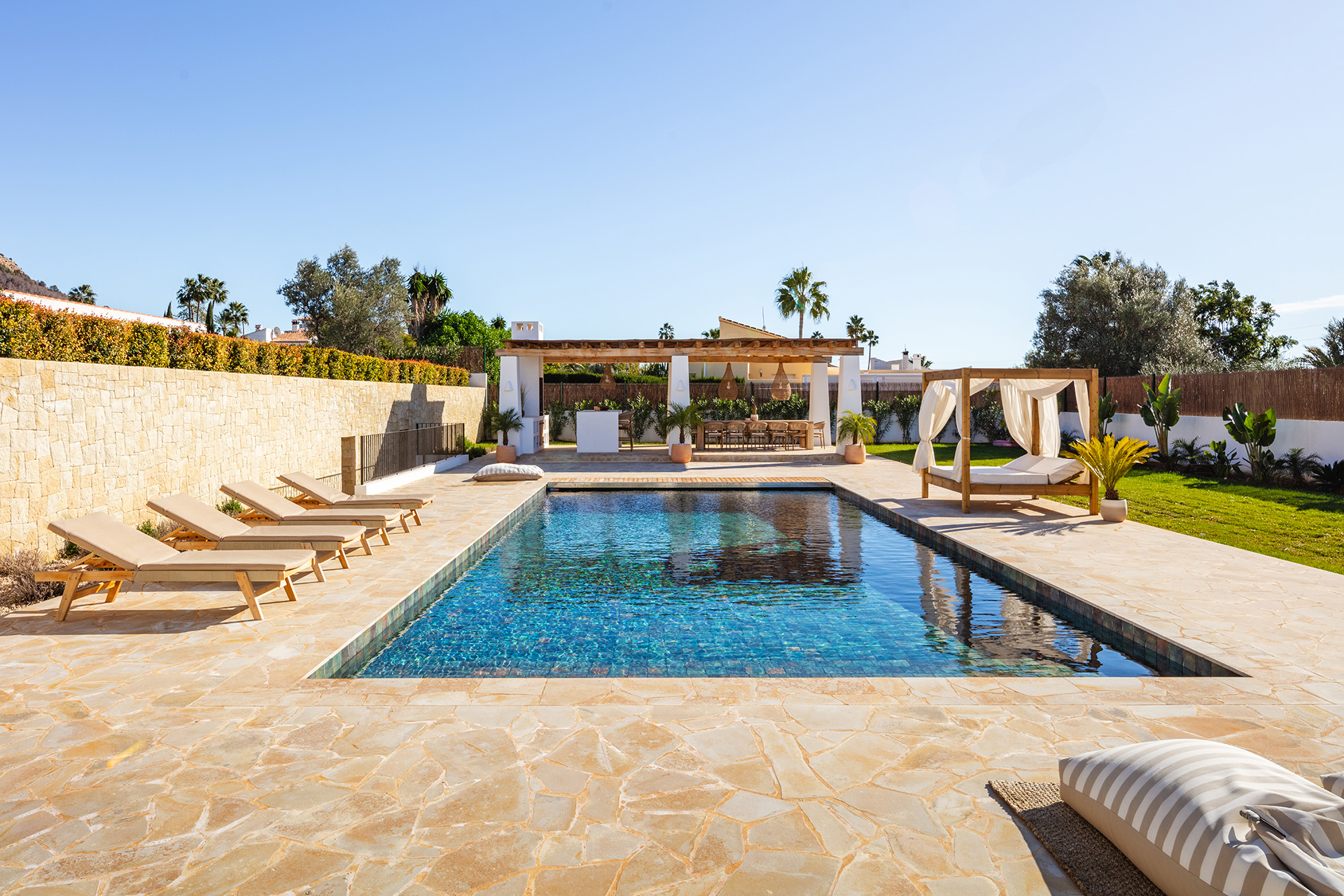 Exquisite Outdoor Living: A Private Oasis Designed to embrace the Mediterranean lifestyle, the outdoor spaces are a true sanctuary. A sprawling 450 m² of terracing seamlessly integrates with the villa's natural surroundings, providing multiple areas for relaxation, dining, and entertaining. At the heart of the garden is a stunning turquoise swimming pool, glistening under the Spanish sun. With its heated design and electric cover, the pool can be enjoyed throughout the year, making it a true centrepiece of this luxurious retreat.