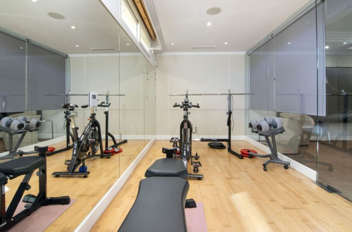 Spanning 476 m² across three floors, the villa features a welcoming hall, a fully equipped kitchen, a cozy living room, and five en-suite bedrooms. The upper level includes the main bedroom with a private terrace and a TV room, while the lower level boasts an entertainment area with a cinema/games room, a bar, a gym, and ample storage.