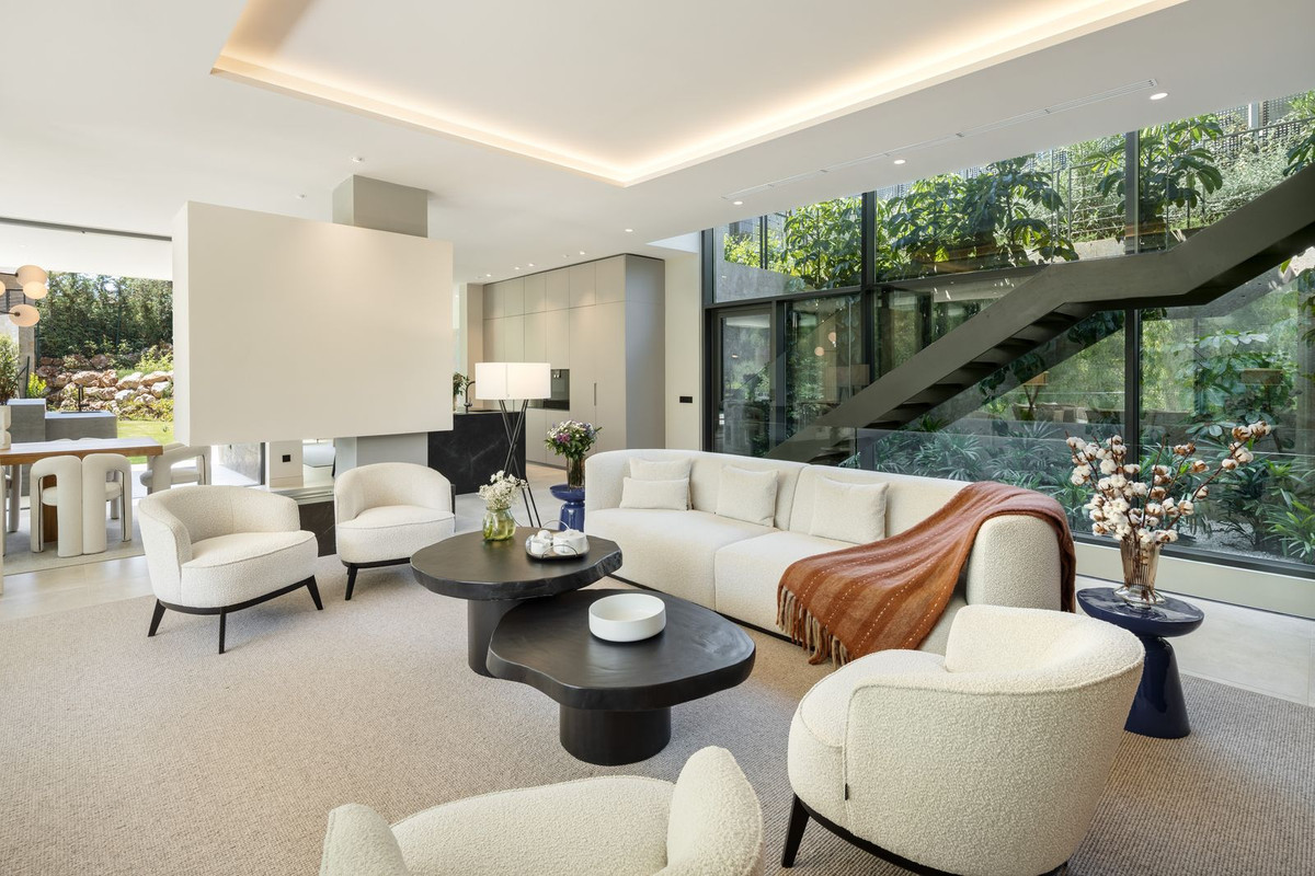 Stunning natural-material villa featuring solar panels, infinity saltwater pool, rooftop terrace with jacuzzi and fire pit, spacious living areas, gym, spa with sauna and hammam, smart home automation, Gaggenau kitchen, flexible top-floor layout, and fully furnished interiors.