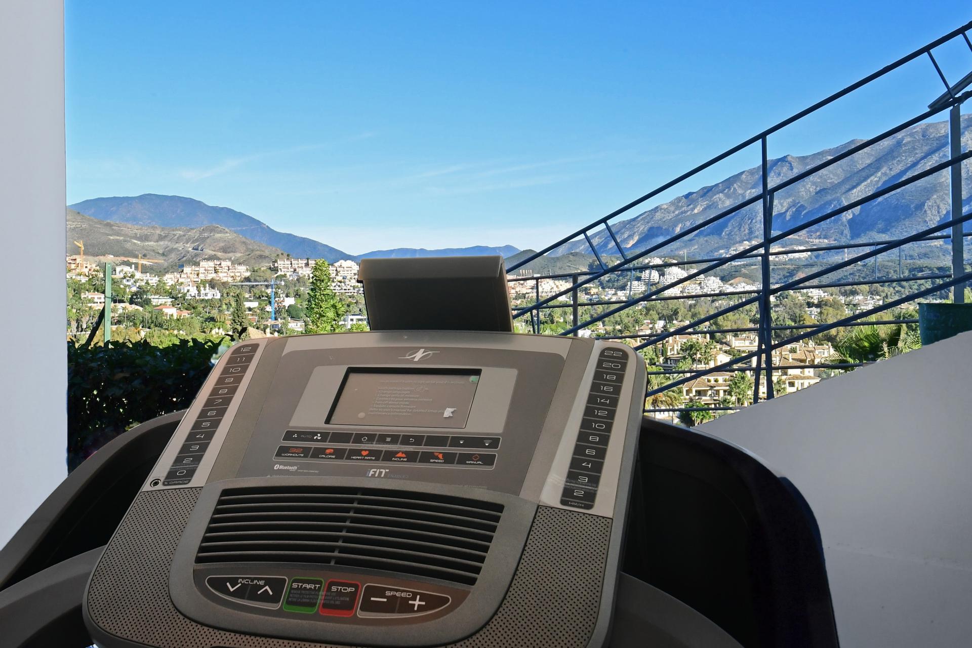 Located in the prestigious Golf Valley of Nueva Andalucía, this luxurious 7-bedroom, 6-bathroom villa offers panoramic views of La Concha mountain and the Mediterranean Sea. Spread across three levels and 667 m² of built space on a 1,000 m² plot, the property combines sleek contemporary architecture with high-end amenities and a lifestyle-oriented layout. The open-plan living area flows seamlessly into expansive terraces and a heated infinity pool, while the designer kitchen features multiple refrigerators, wine cooler, ice maker, and seating for up to 16 guests. The home includes two master suites with private access to the upper terrace lounge and bar, while additional bedrooms on the lower level provide comfort and privacy, with some offering direct pool access. Entertainment features include a cinema/game room with pool table, outdoor gym, and rooftop terrace with an 8-person Jacuzzi and panoramic views. An additional 5-person Jacuzzi and a built-in barbecue area enhance the outdoor living experience. The property offers secure parking for four vehicles and includes a laundry room and scullery. With a rental license and first occupancy permit (LPO) in place, this turnkey villa is ideal for both private use and investment. Just minutes from Puerto Banús, golf, schools, and beaches.