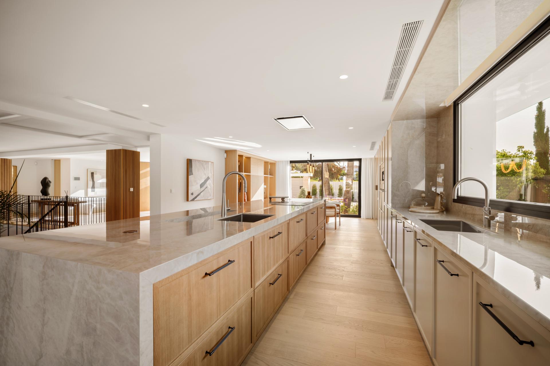 Located in the prestigious Aloha area of Nueva Andalucía, this fully renovated villa offers timeless elegance with contemporary design. Featuring six spacious bedrooms and six bathrooms, the home boasts a stylish open-plan layout with natural finishes and warm wooden accents. Enjoy panoramic golf views, a private west-facing pool, and beautifully landscaped gardens. The villa includes 365 m² of terraces, perfect for outdoor living and entertaining. High-quality construction, advanced home systems, and a carport with parking for four vehicles ensure comfort and convenience. Just minutes from Marbella, Puerto Banús, and top golf courses, this home defines luxury living in the Golf Valley.