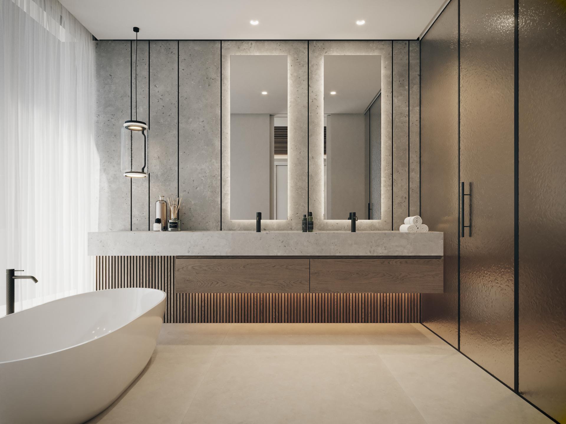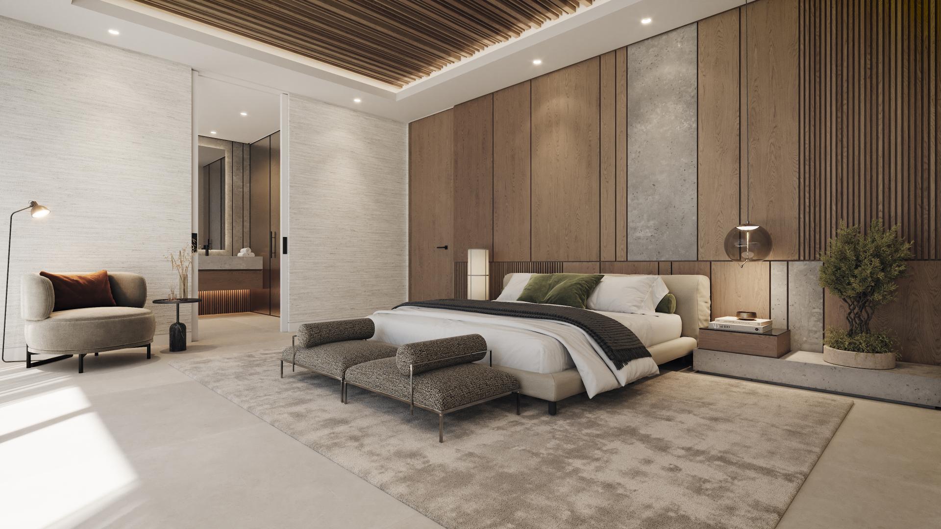 Indoor-outdoor living is seamlessly integrated, with direct terrace access from the entire ground floor. The interiors showcase modern design tailored specifically for this property, while the open-plan layout effortlessly merges the kitchen, dining and living spaces. There is also one guest bedroom on this level. The upper level houses two guest bedrooms, each with private bathrooms, alongside a luxurious master bedroom boasting a walk-in closet, lavish bathroom and direct terrace access.