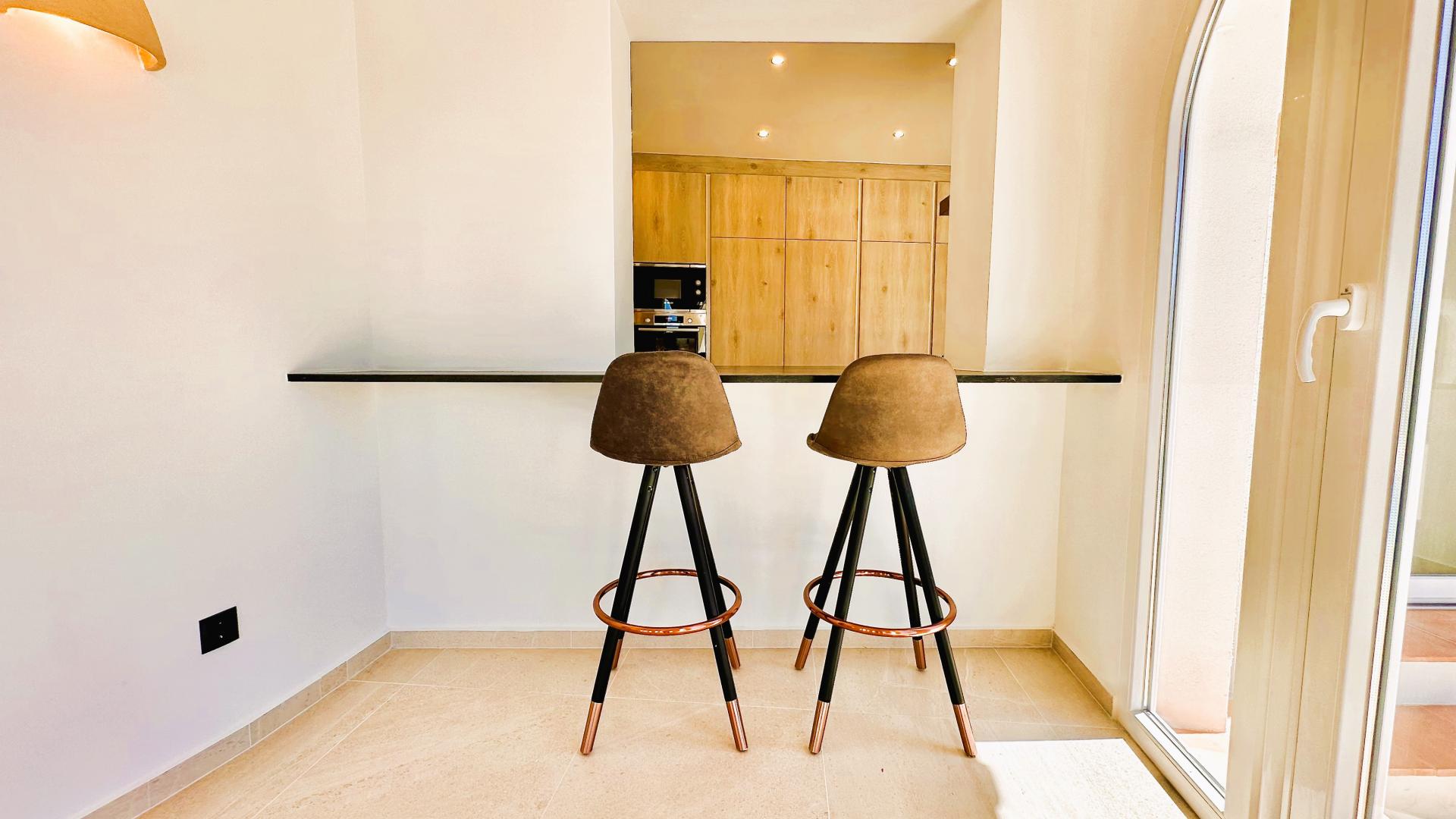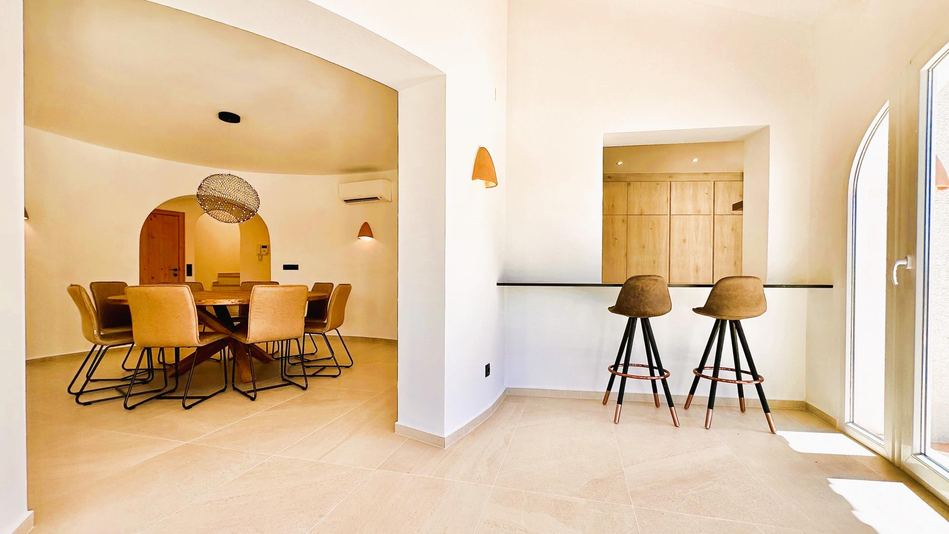 The villa's architecture ensures a seamless flow between its interior and exterior spaces. Large windows and arched doorways open up to a generous terrace, inviting sunlight to flood every corner of the home. Whether you're relaxing in the living room or preparing a meal in the kitchen, views of the sparkling pool and lush gardens remain ever-present, creating a constant connection to the outdoors.